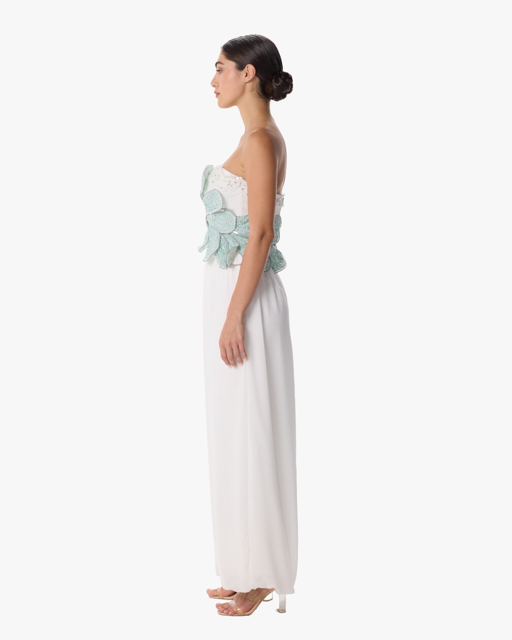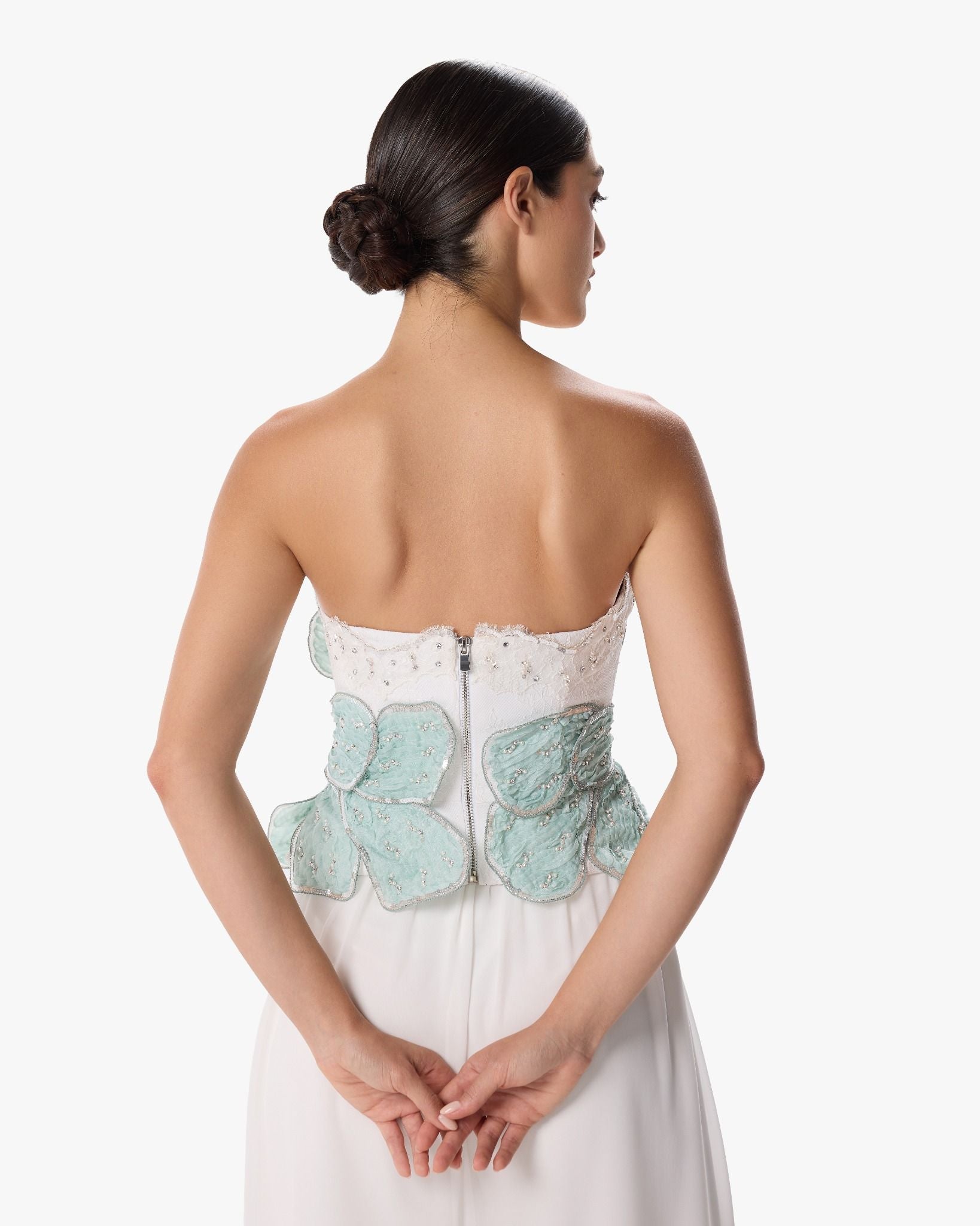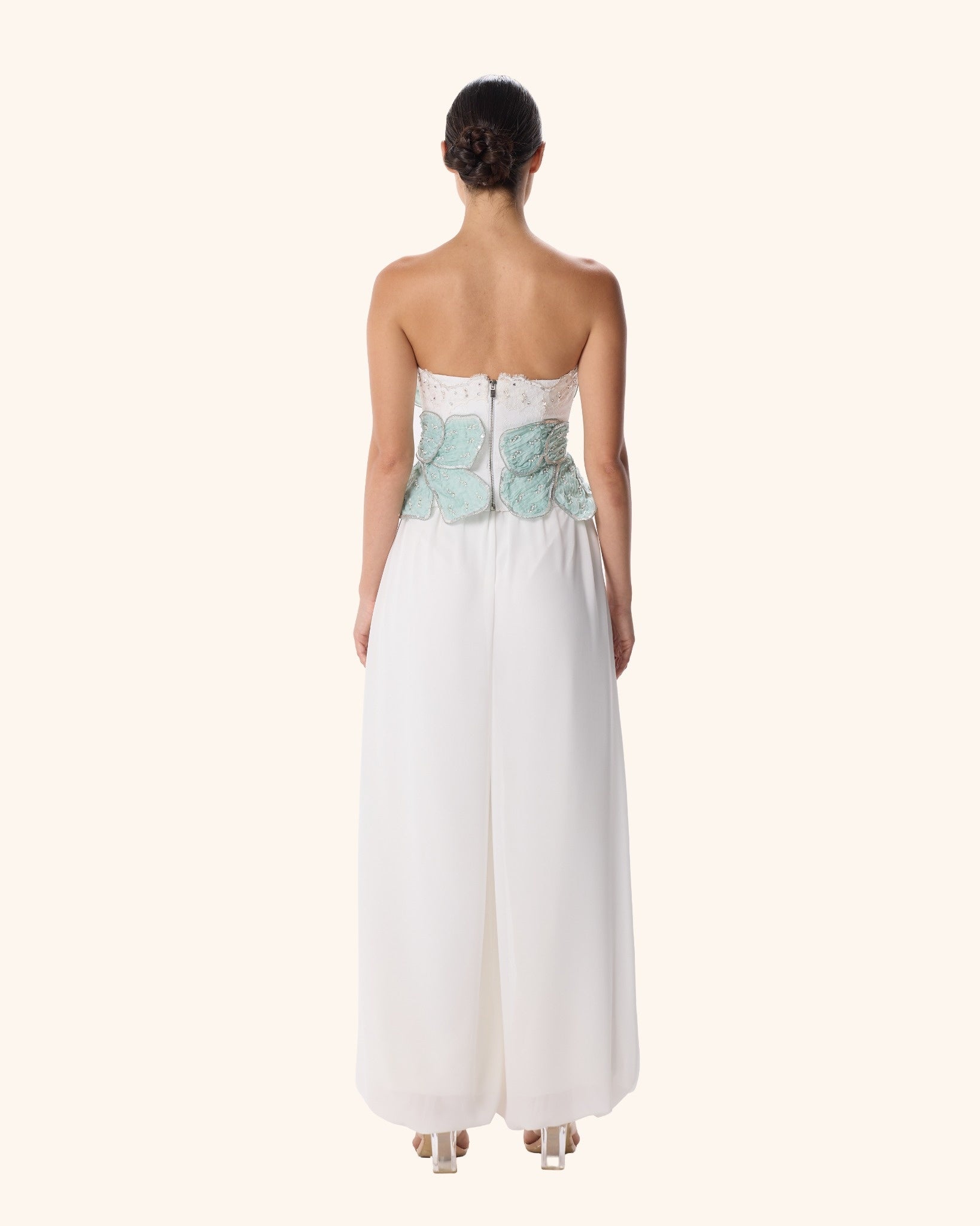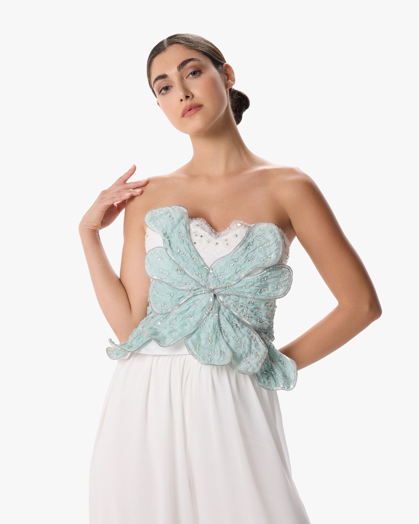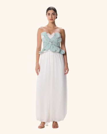 She is a mint and white bustier top with palazzo pants in chiffon, lace, and handmade construction, with 3D mint butterfly applique, sequin veins, and crystals scattered across her like fragments of light breaking through clouds. She does not walk into a room. She arrives like a celestial event.