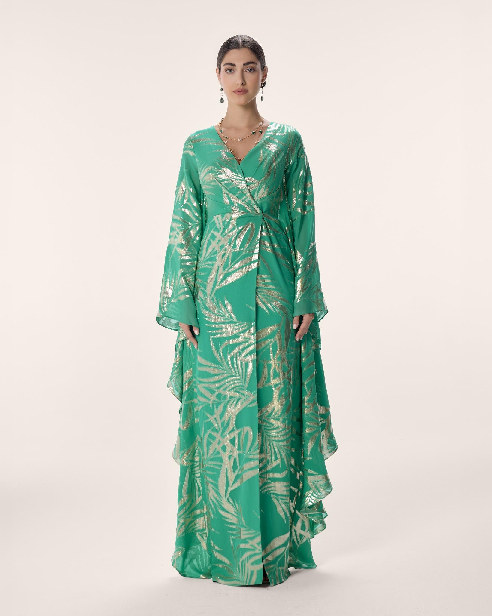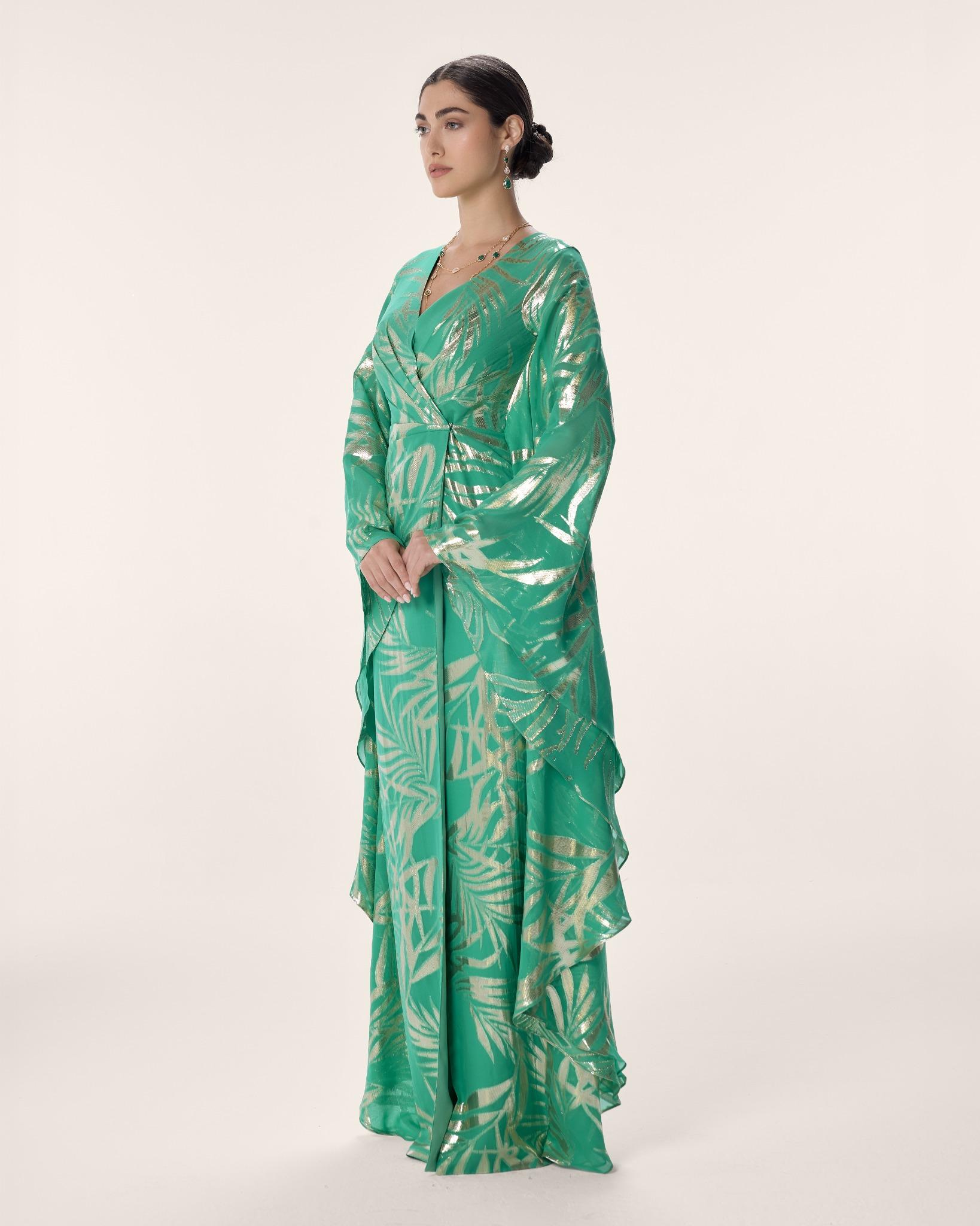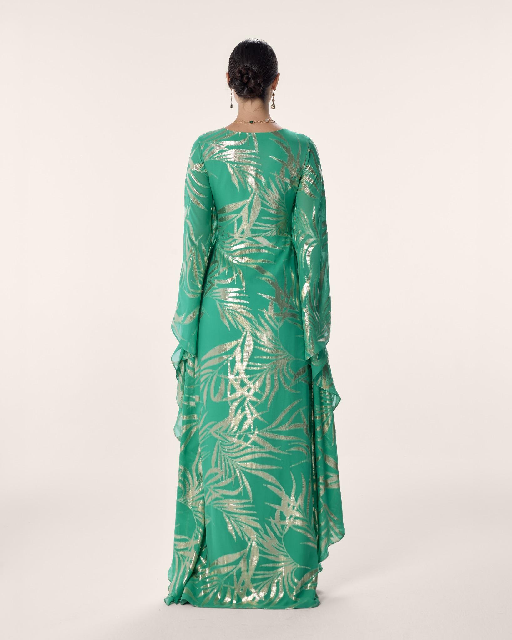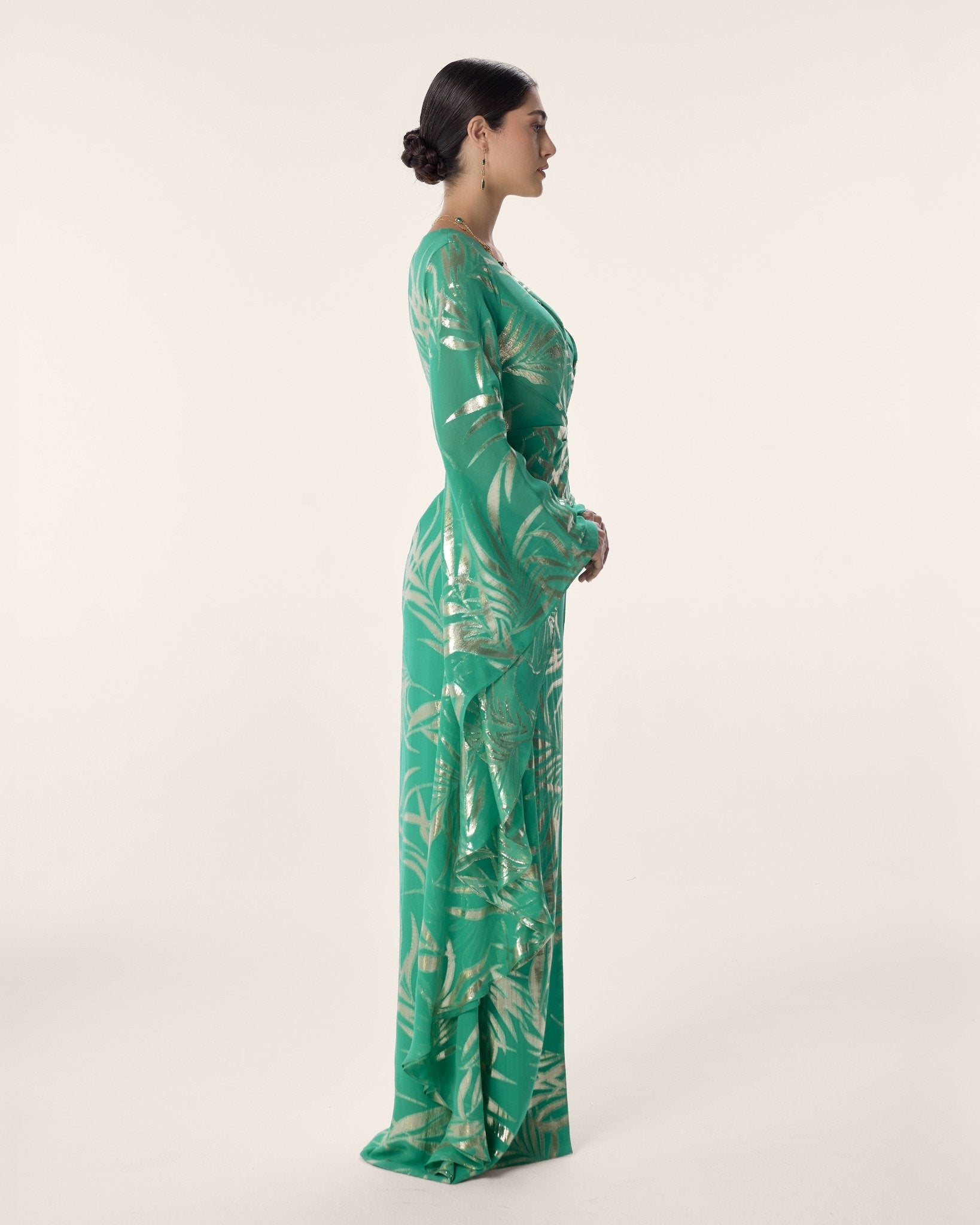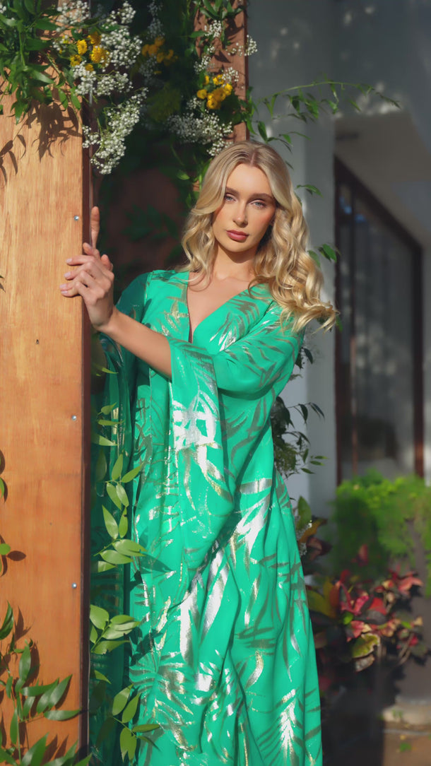 An emerald wrap maxi in gold foil-printed chiffon, layered at the hem for fluid, luminous movement. With a gathered waist and sweeping bell sleeves, she blooms in abundance — rich, radiant, and alive with every step.