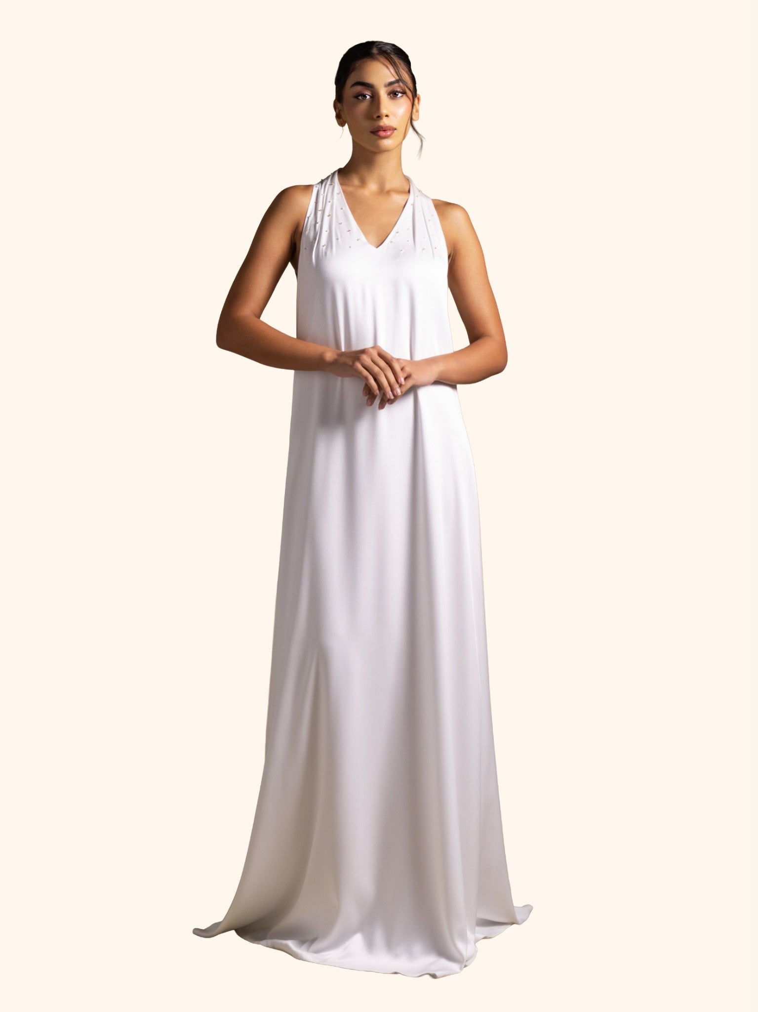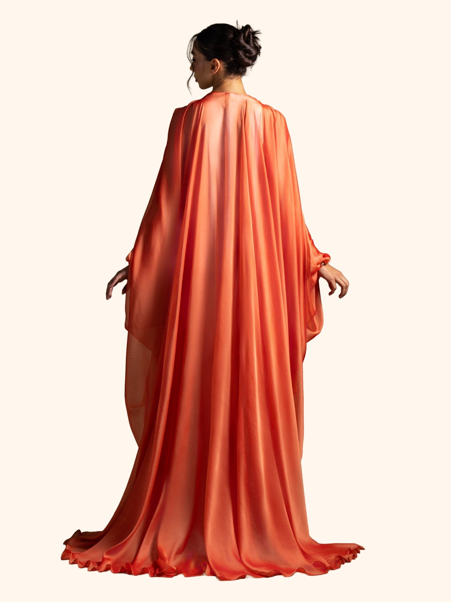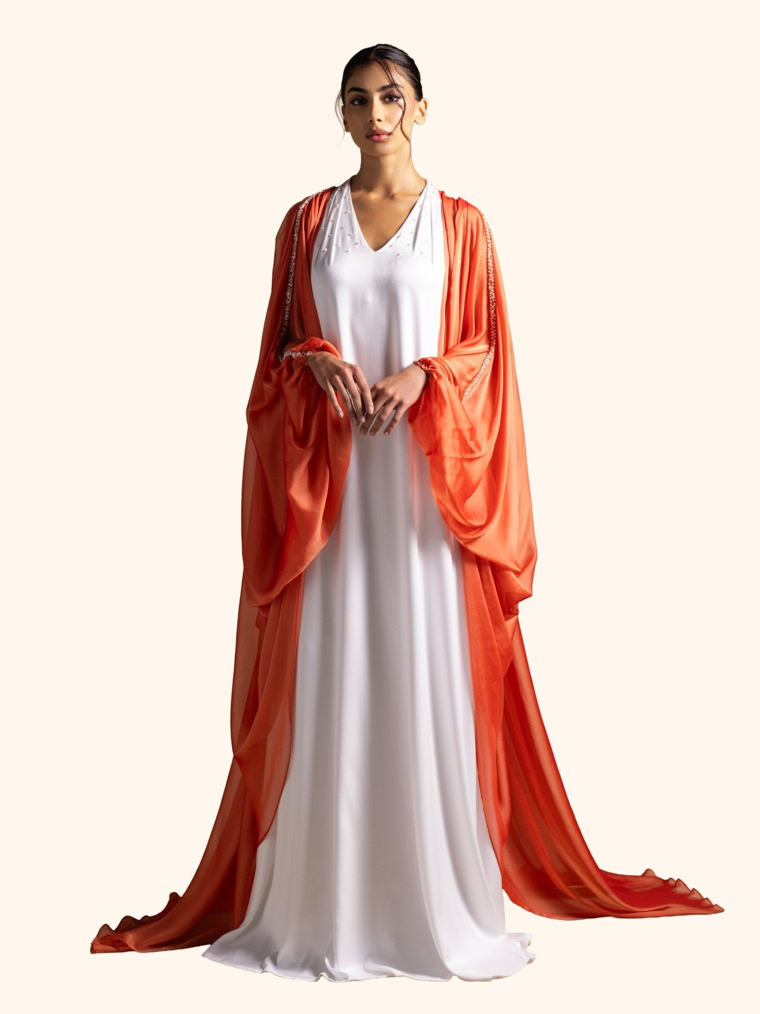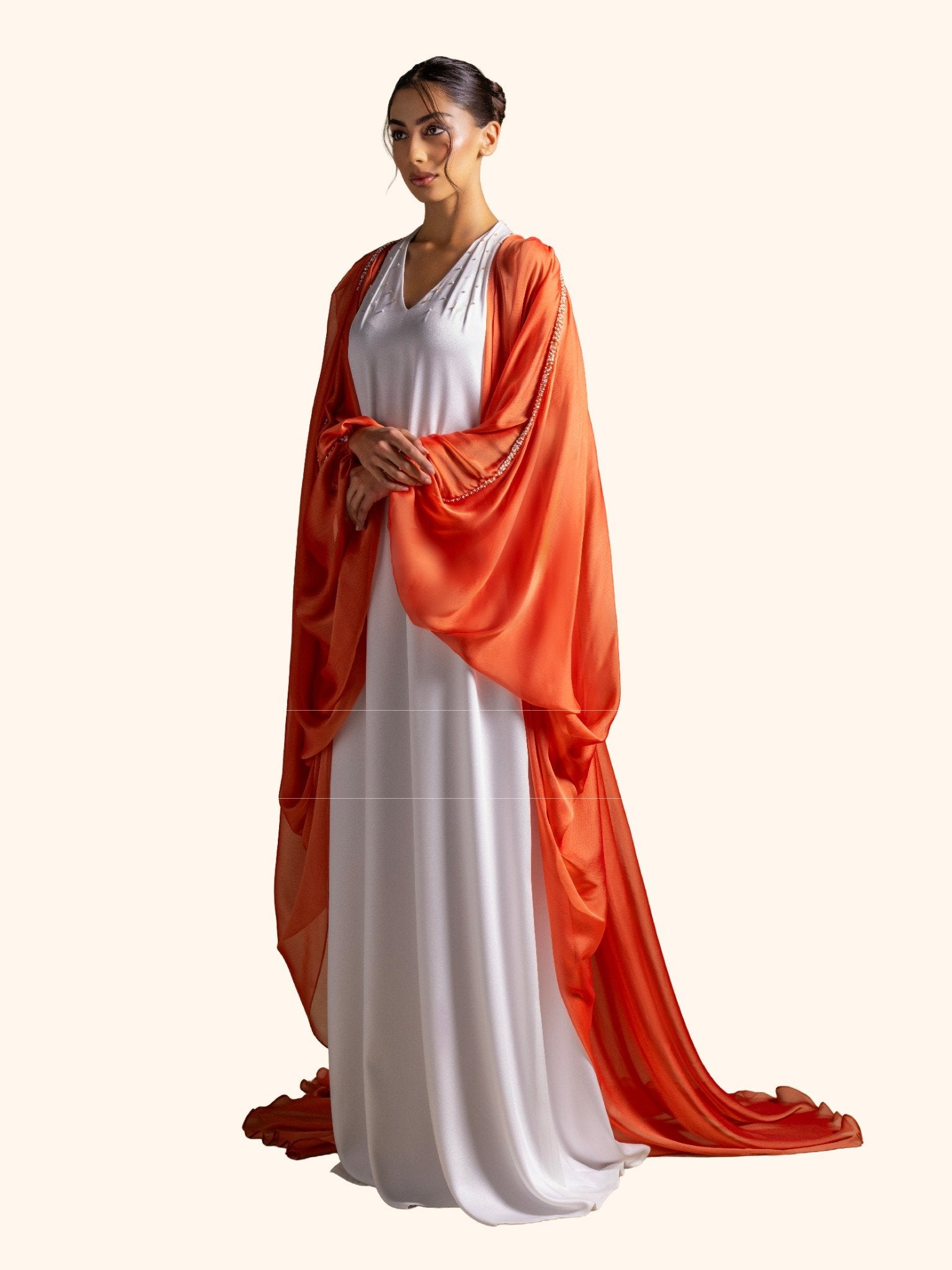 من مجموعة زارينا، يأتي فستان زينوبيا بلونه الأبيض الكريمي، مزيناً بعباءة من الأورجانزا البرتقالية المحروقة. ويزدان الفستان بتطريزات خرزية دقيقة على الأكمام والحواف، مما يخلق تبايناً لافتاً. يجمع هذا الفستان بين الرقي والجرأة، وهو مثالي لحفلات السهرة والاحتفالات الثقافية والمناسبات المميزة.