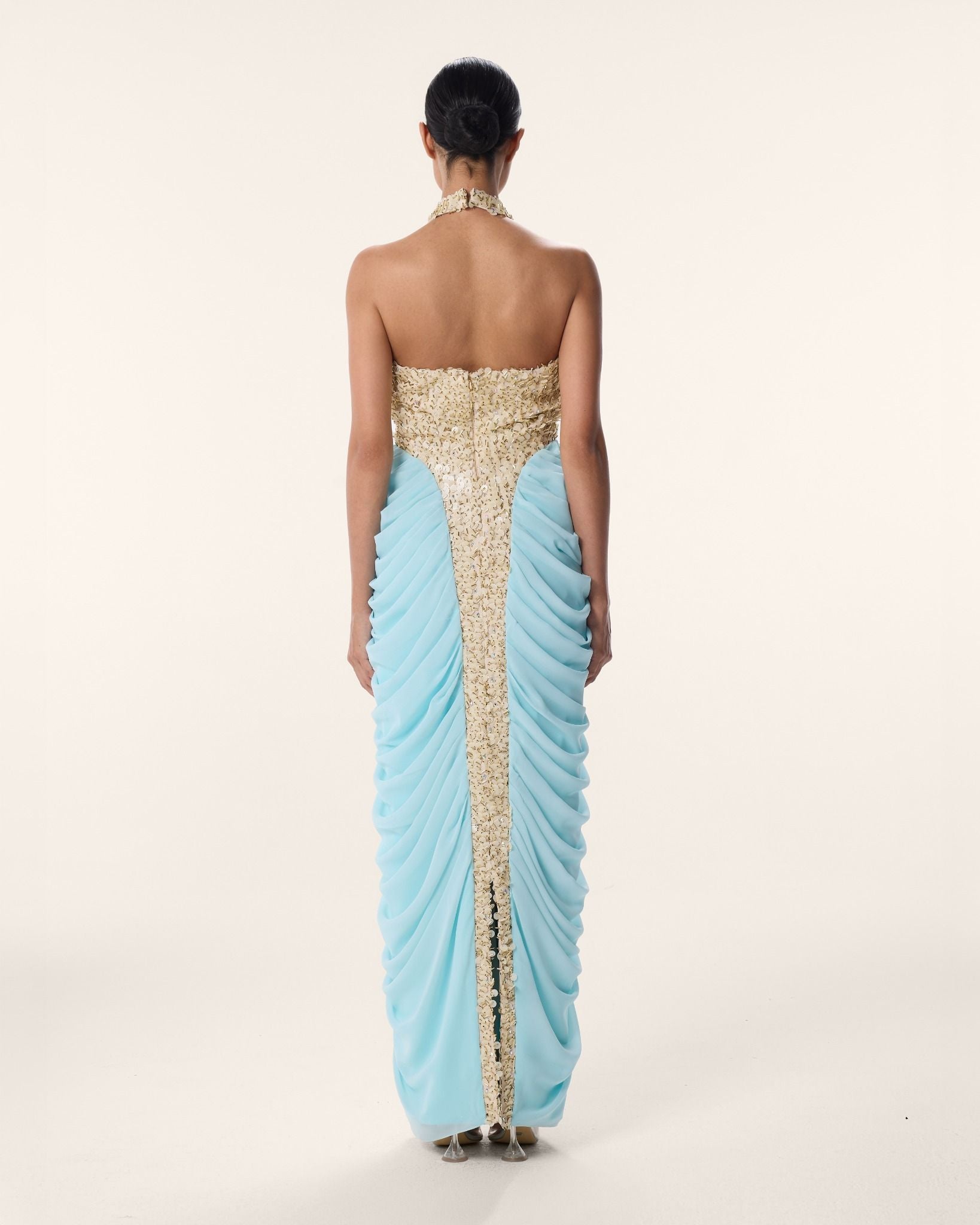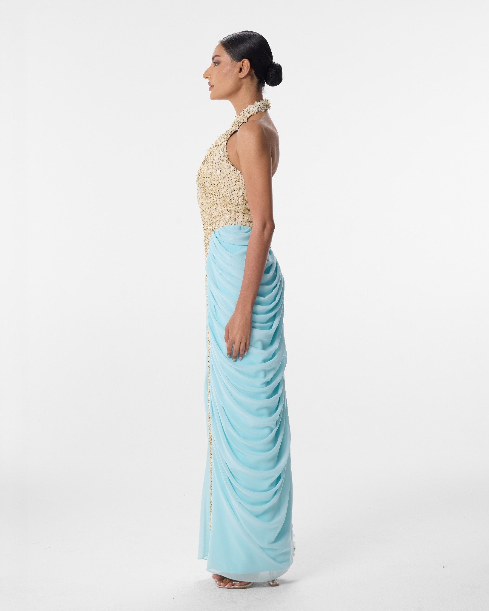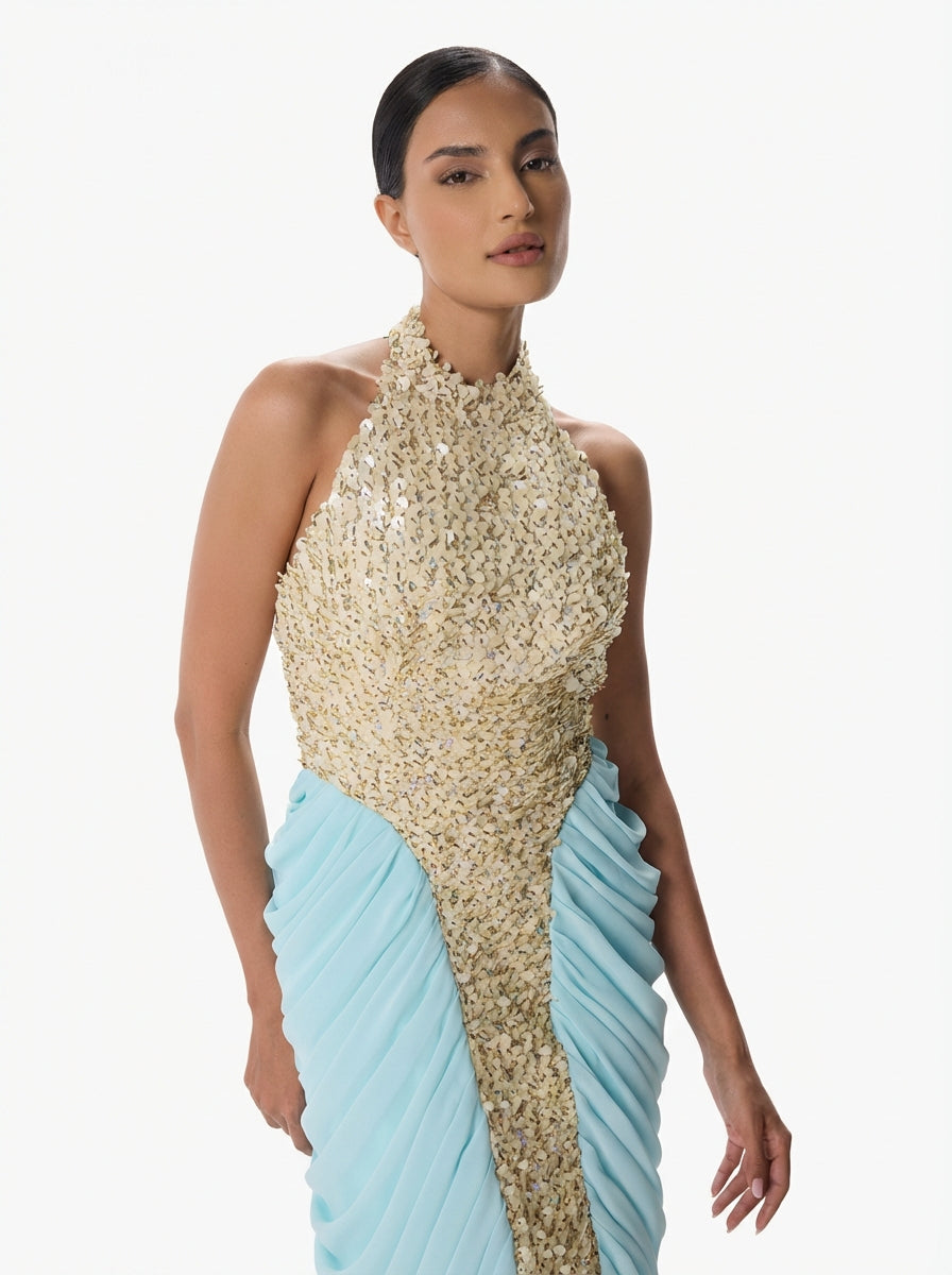 LINDY takes her name from the linden tree, known across European folklore for its gentle beauty and protective shade. She is a floor length column in gold and baby blue sequin and chiffon with a halter neck and high mock collar. A dense gold 3D textured sequin center panel runs down her front like a river of light. She is the woman whose gentleness is not weakness but rather the most powerful thing in the room.