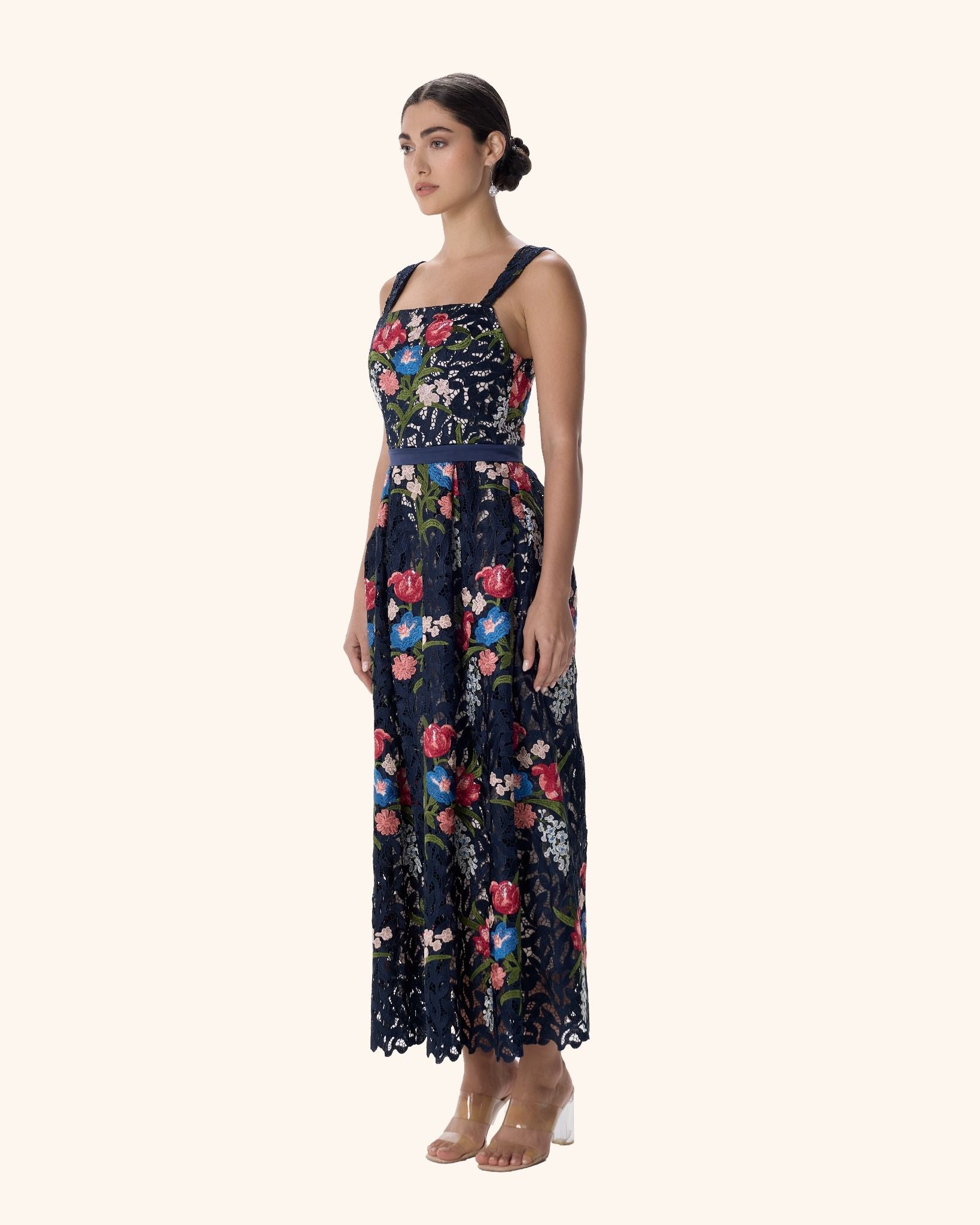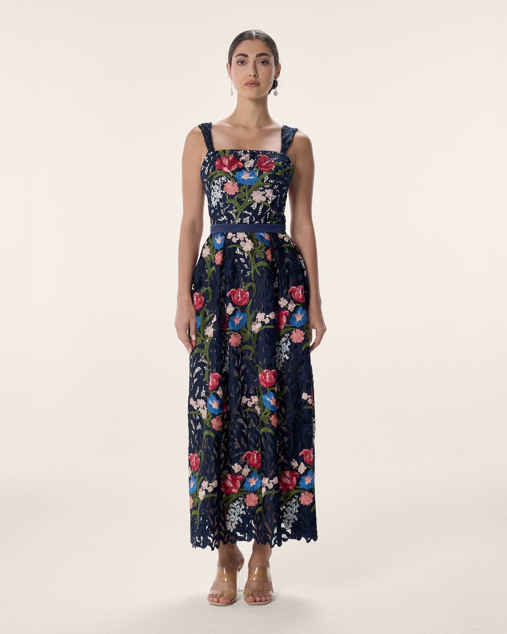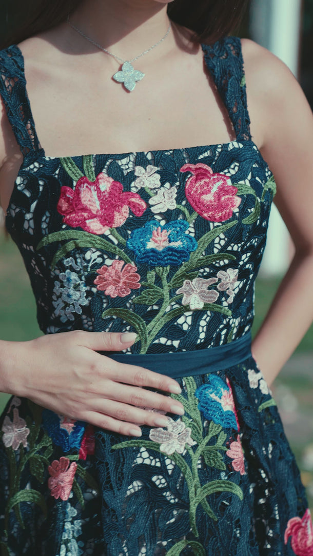 A refined midi column dress in navy embroidered lace, alive with vivid botanical detail. Framed by a square neckline and sculpted silhouette, she is the adornment — captivating, effortless, and impossible to overlook.