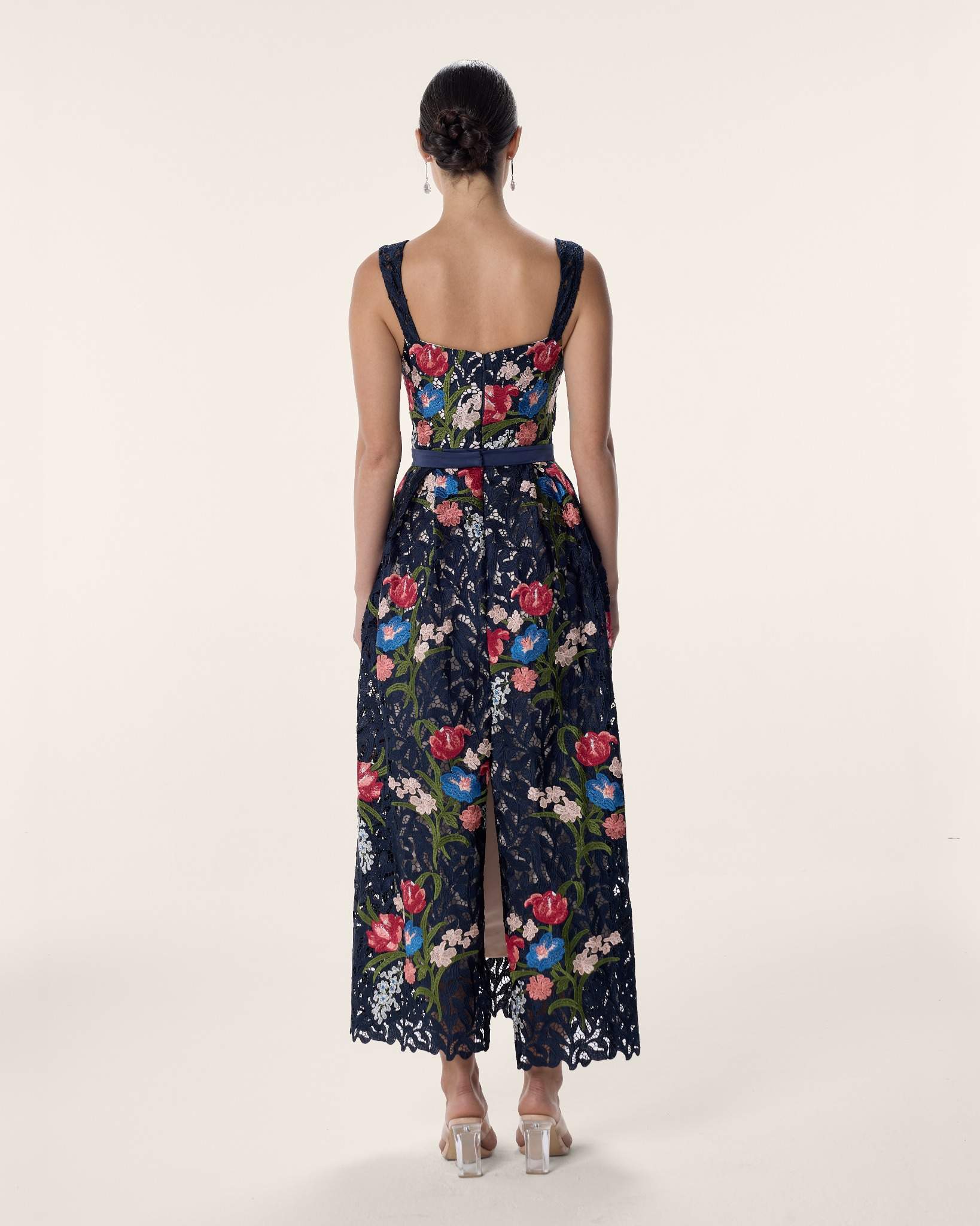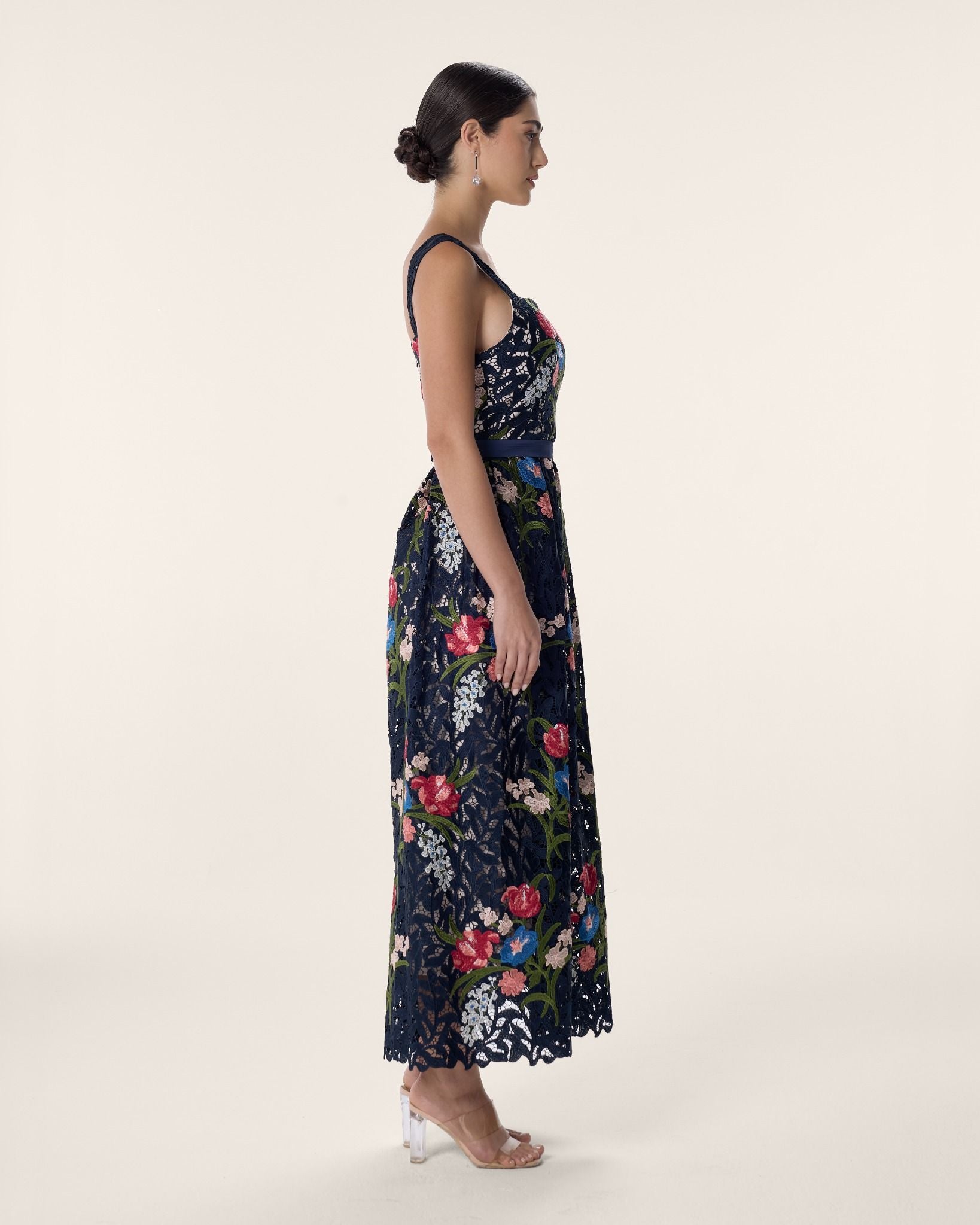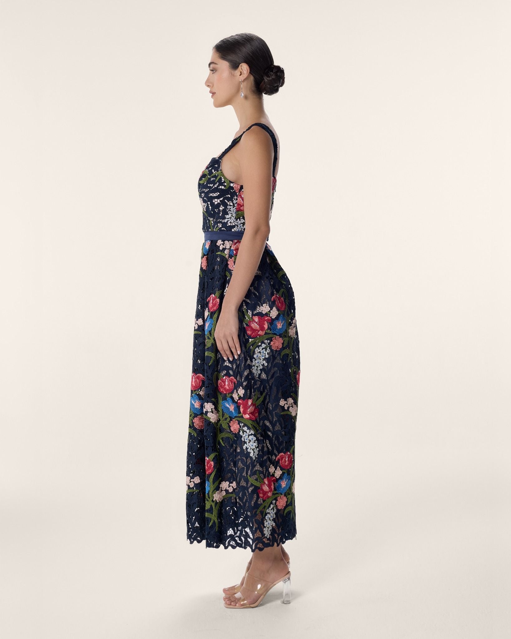A refined midi column dress in navy embroidered lace, alive with vivid botanical detail. Framed by a square neckline and sculpted silhouette, she is the adornment — captivating, effortless, and impossible to overlook.