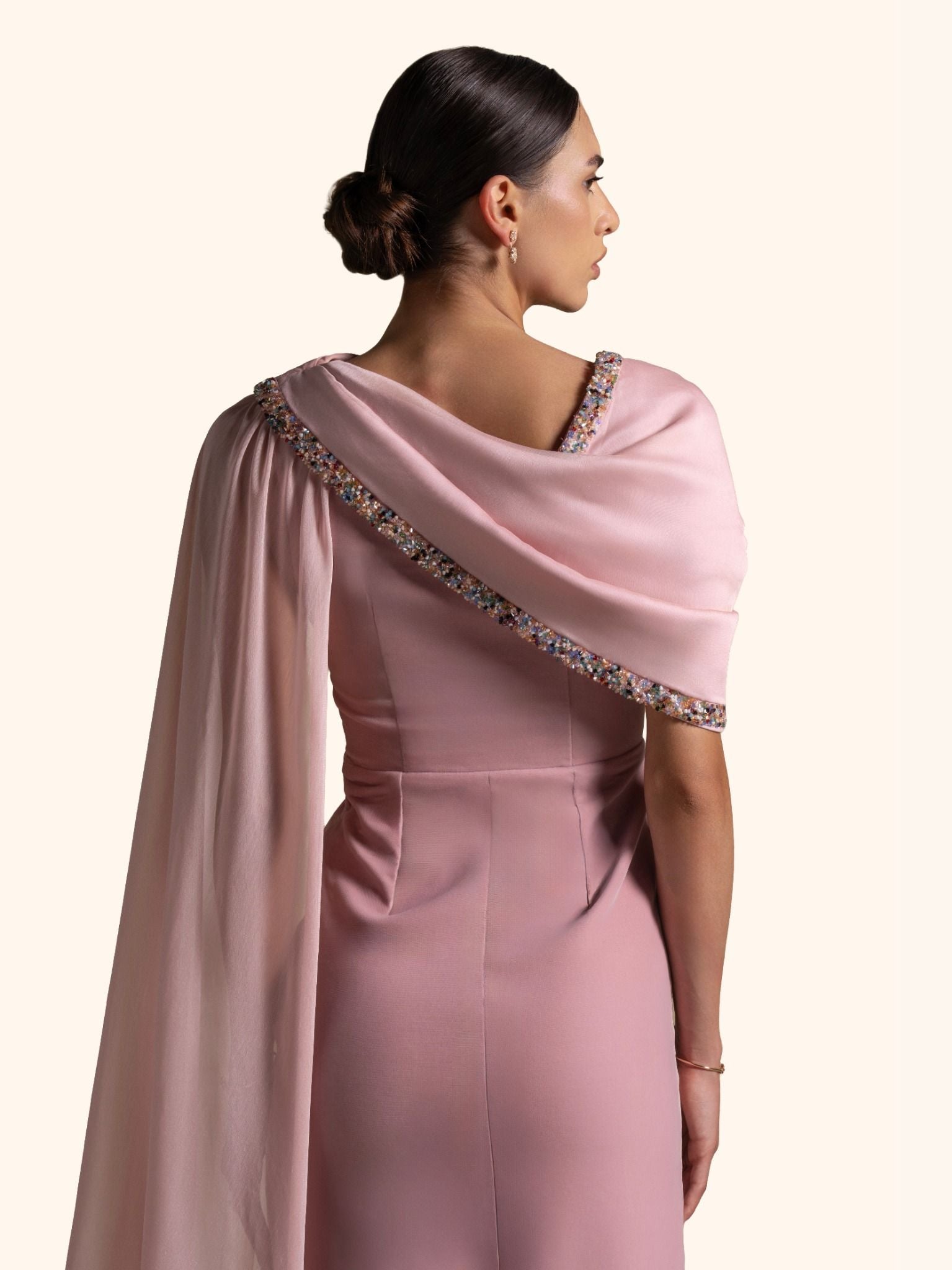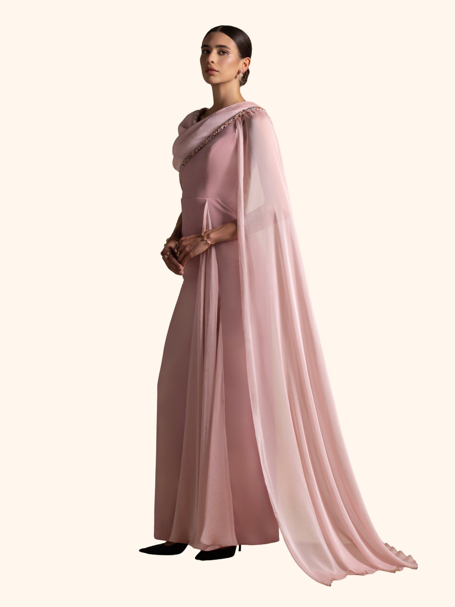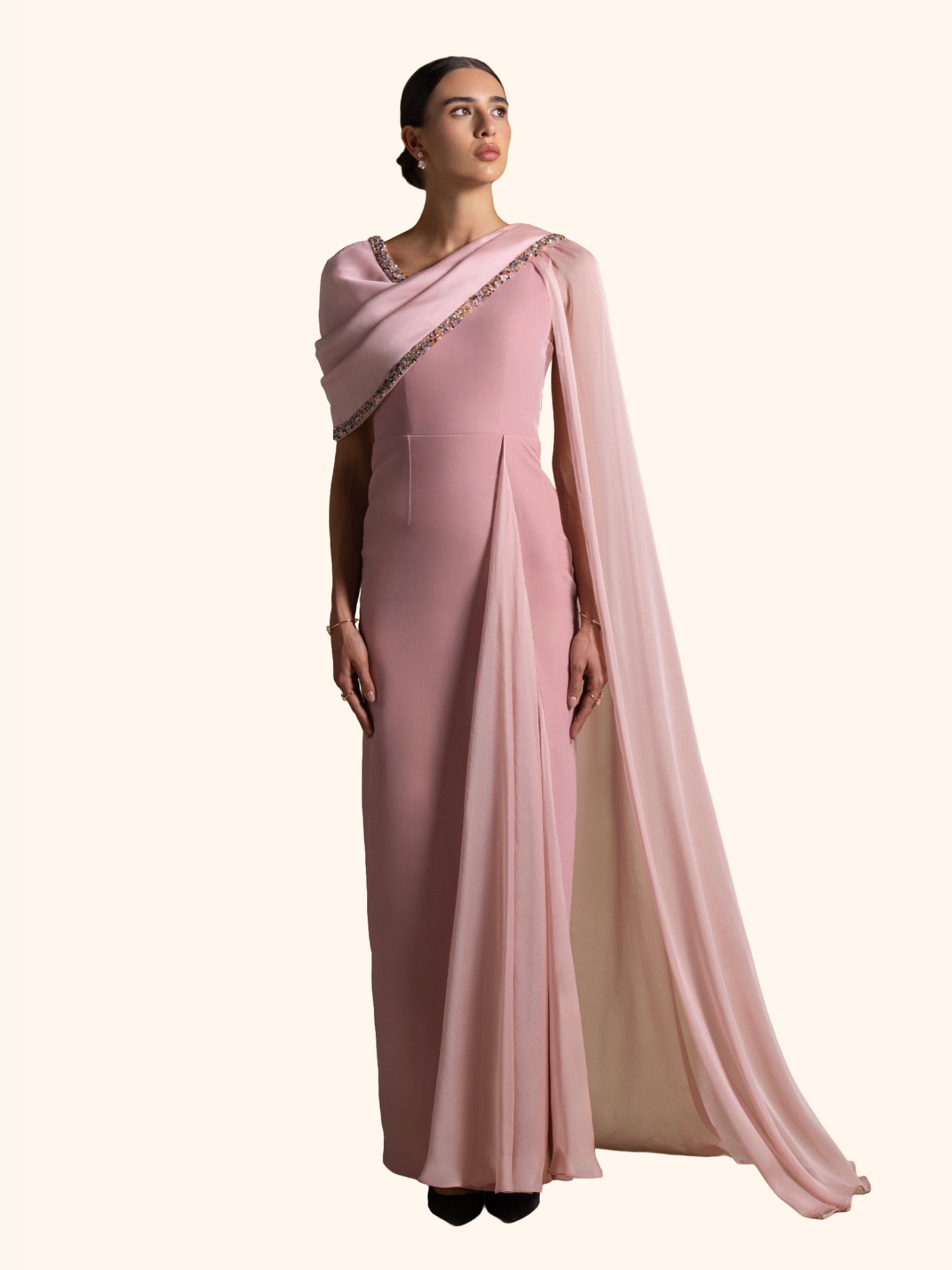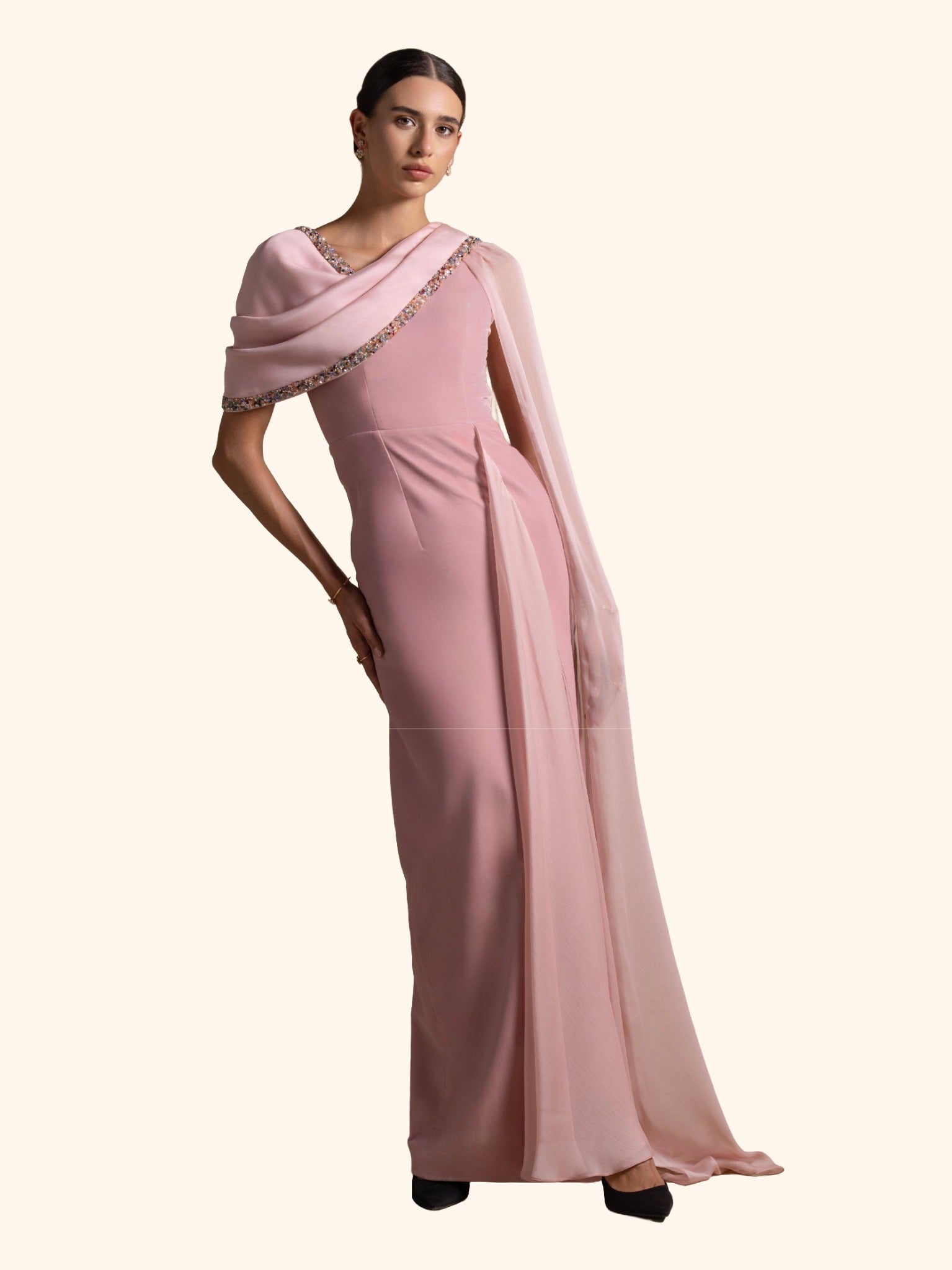 From the Zarina Collection, the Meghan gown in soft Pink Quartz blends a velvet base with a chiffon drape and delicate beadwork detailing along the neckline. Finished with butter crepe lining for a refined fit, this elegant silhouette is perfect for receptions, formal evenings, and graceful celebrations.