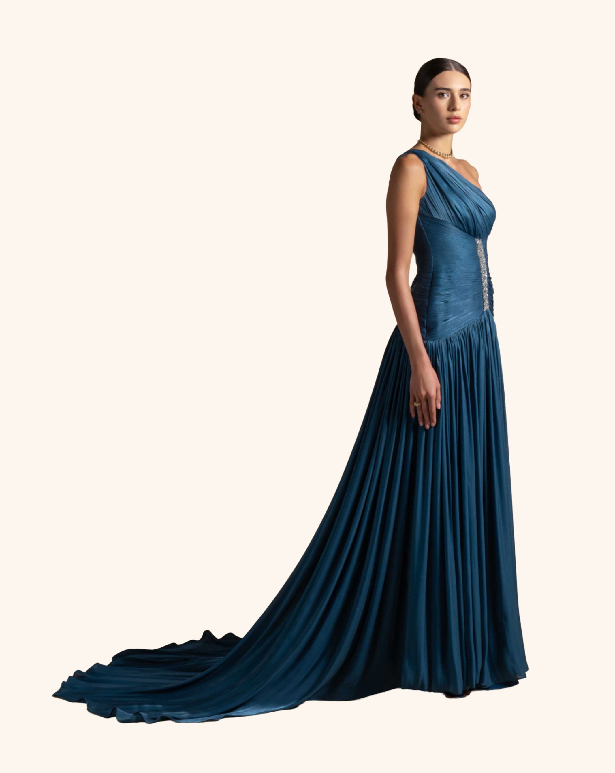 From the Zarina Couture line, this turquoise gown captivates with its one-shoulder draped design and a fitted ruched bodice adorned with delicate embellishment. The flowing skirt cascades into a graceful train, exuding timeless elegance. Perfect for evening galas, red-carpet events, and distinguished occasions.