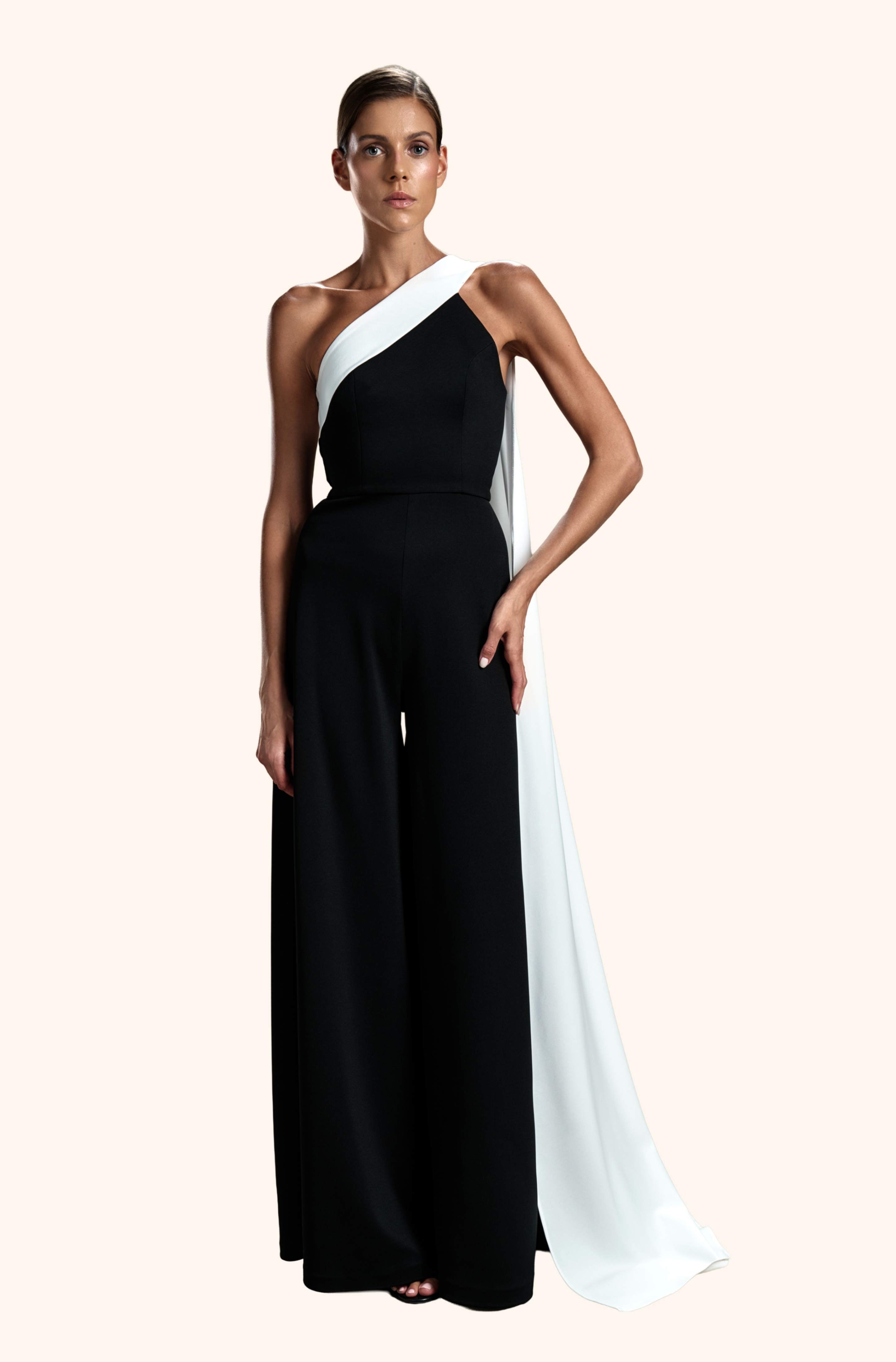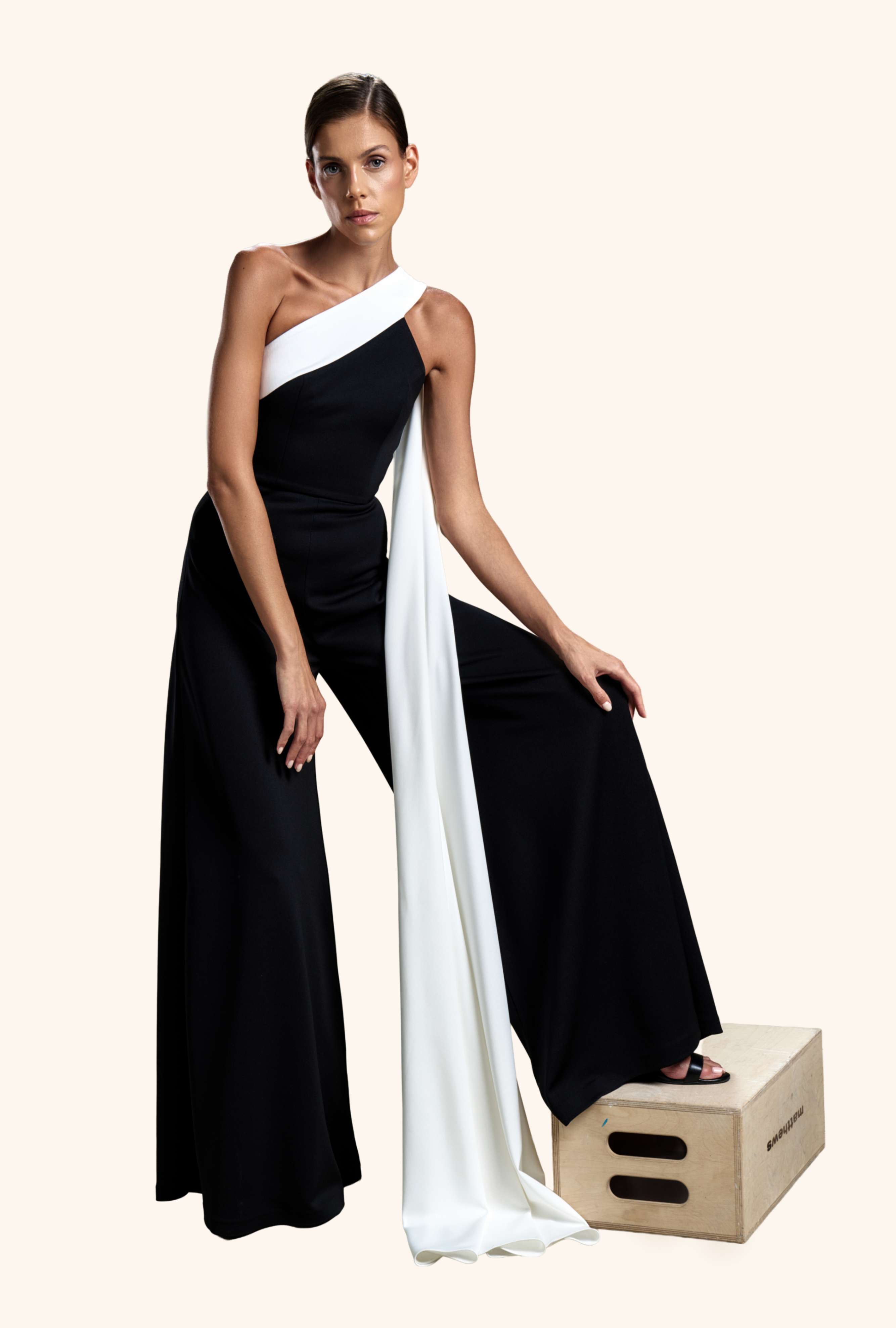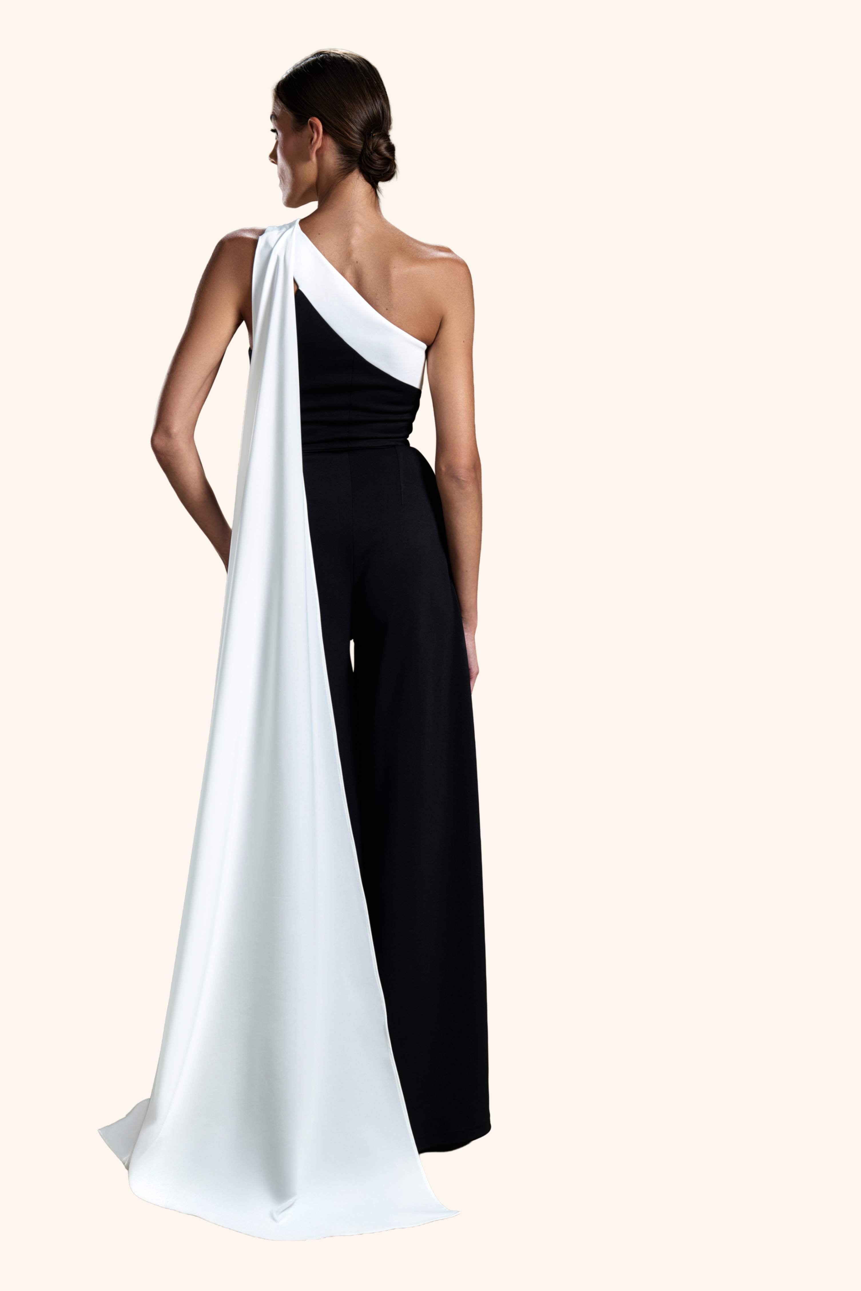 Monarch Drape from our Midnight Mirage SS2026 collection. One-shoulder evening jumpsuit with flowing white drape down back and front. Crafted for formal / evening with monarch statement.