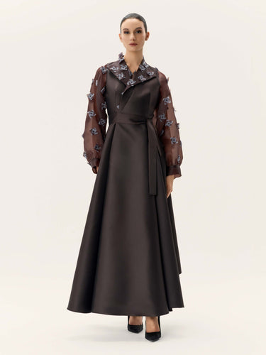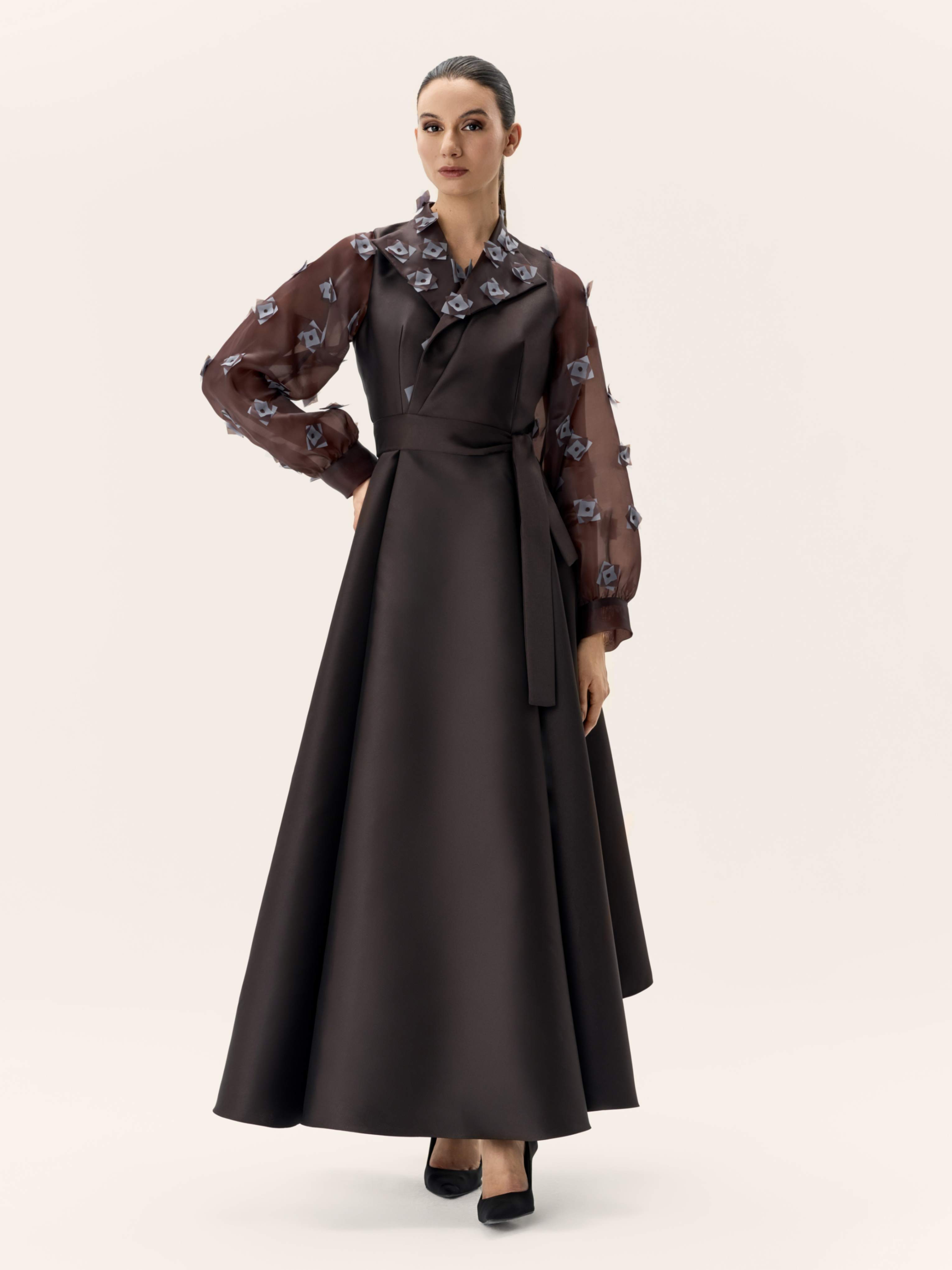 Satin mikado dress with 3D organza sleeves and a wrap waist tie