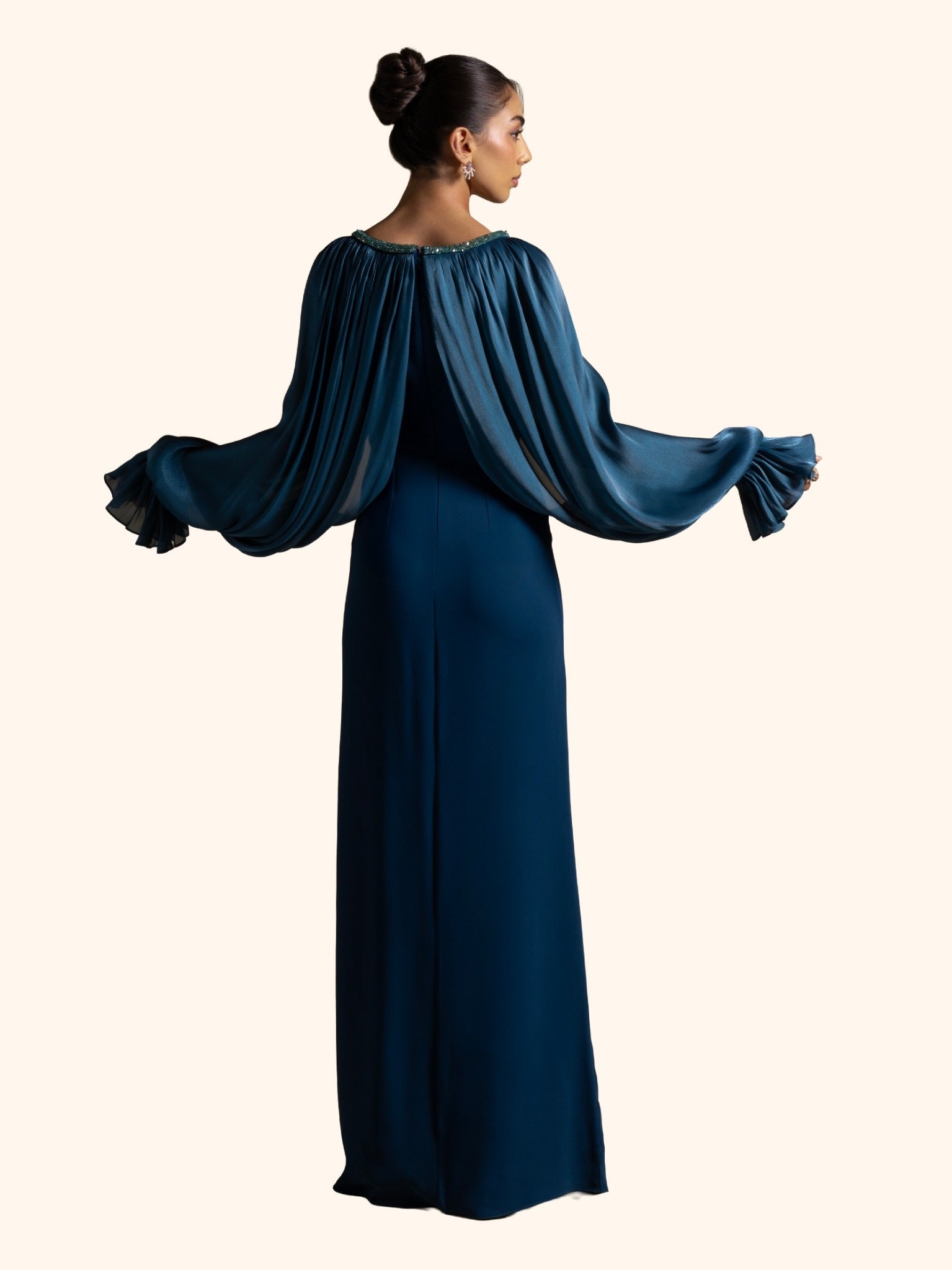 From the Zarina Collection, the Louise gown in Turquoise features a finely pleated organza drape over voluminous sleeves, paired with a sleek crepe base for a striking contrast of texture. Embellished neckline details add subtle sparkle, making it perfect for formal soirées, receptions, and elegant evening gatherings.
