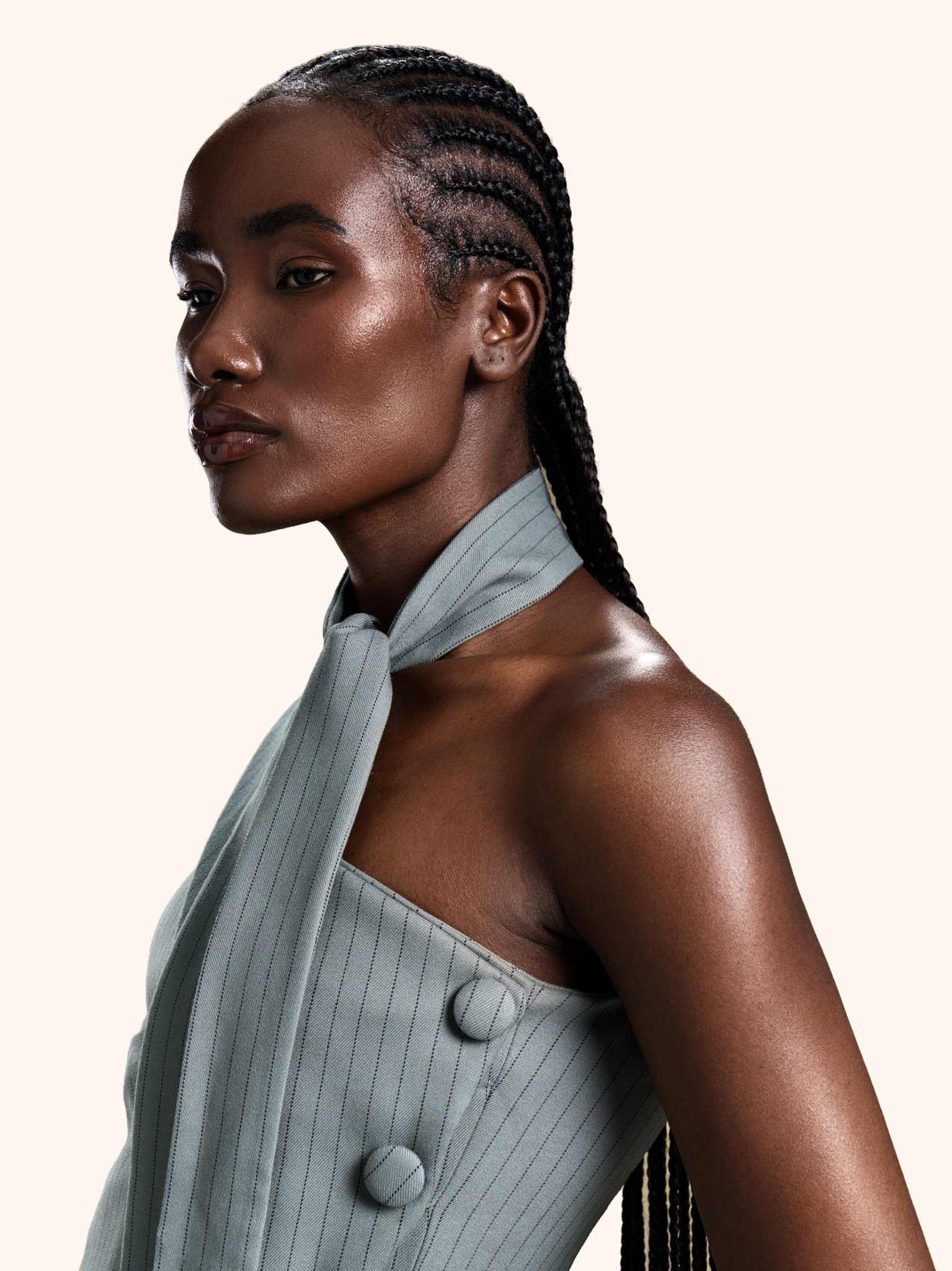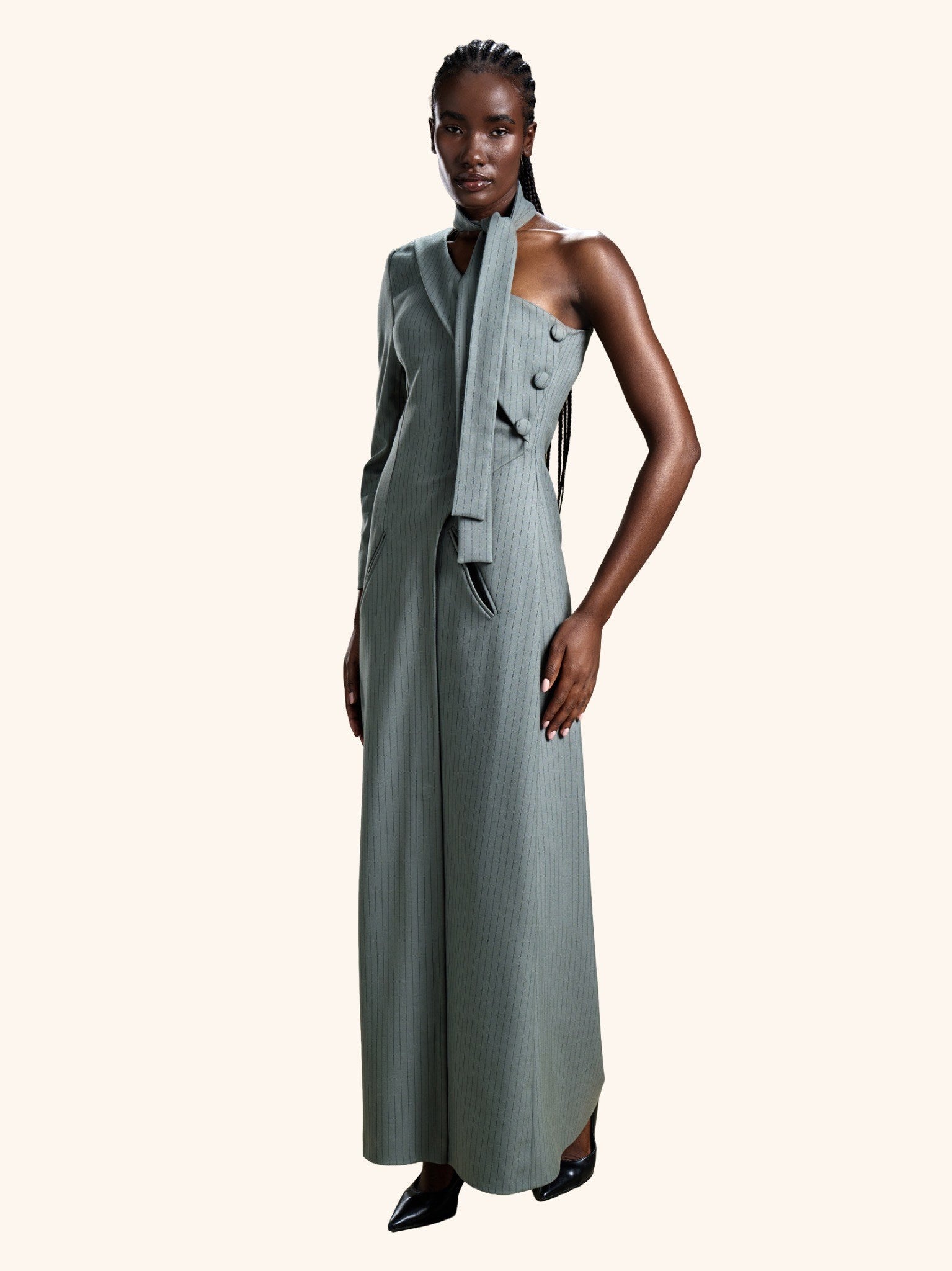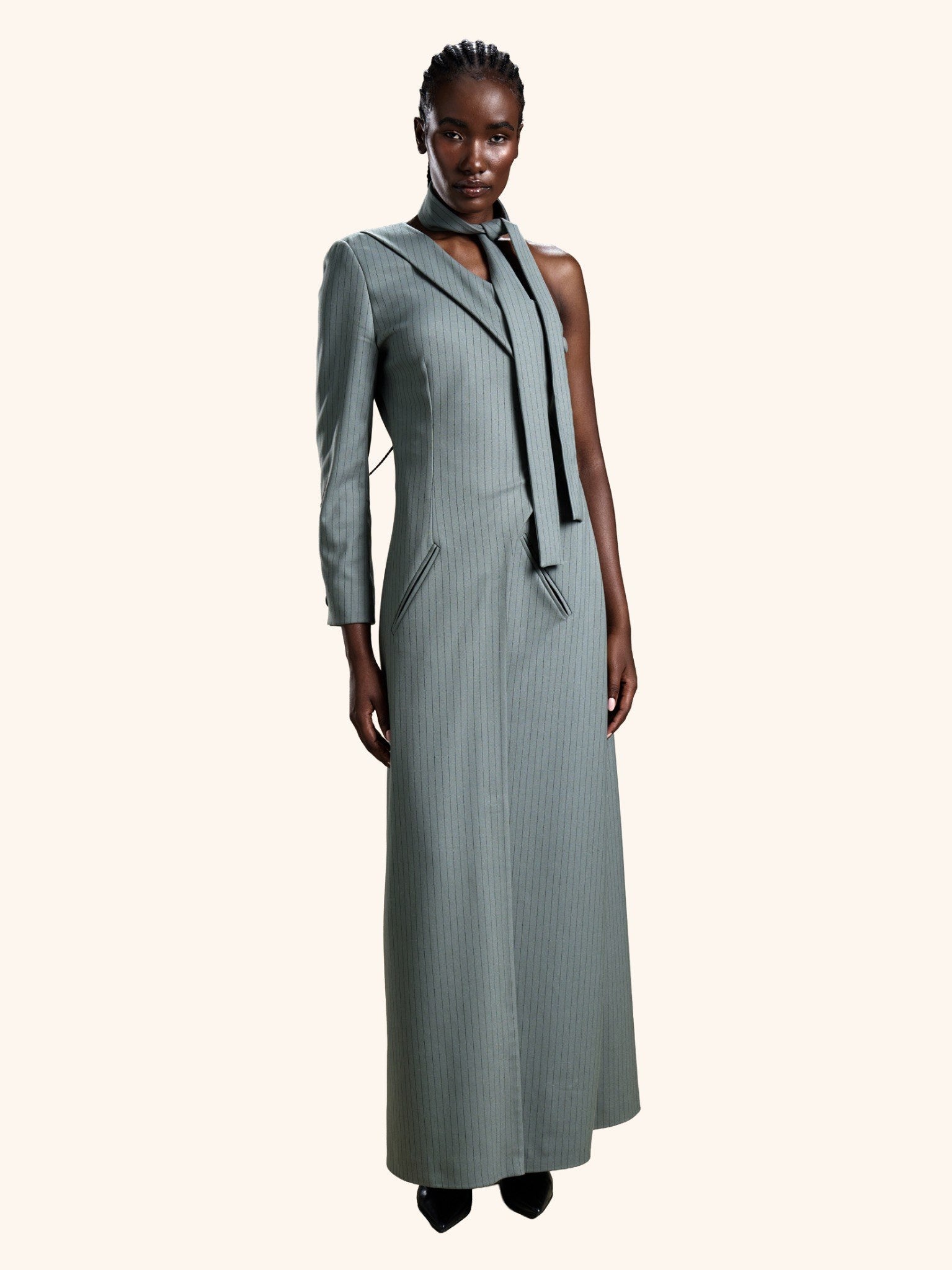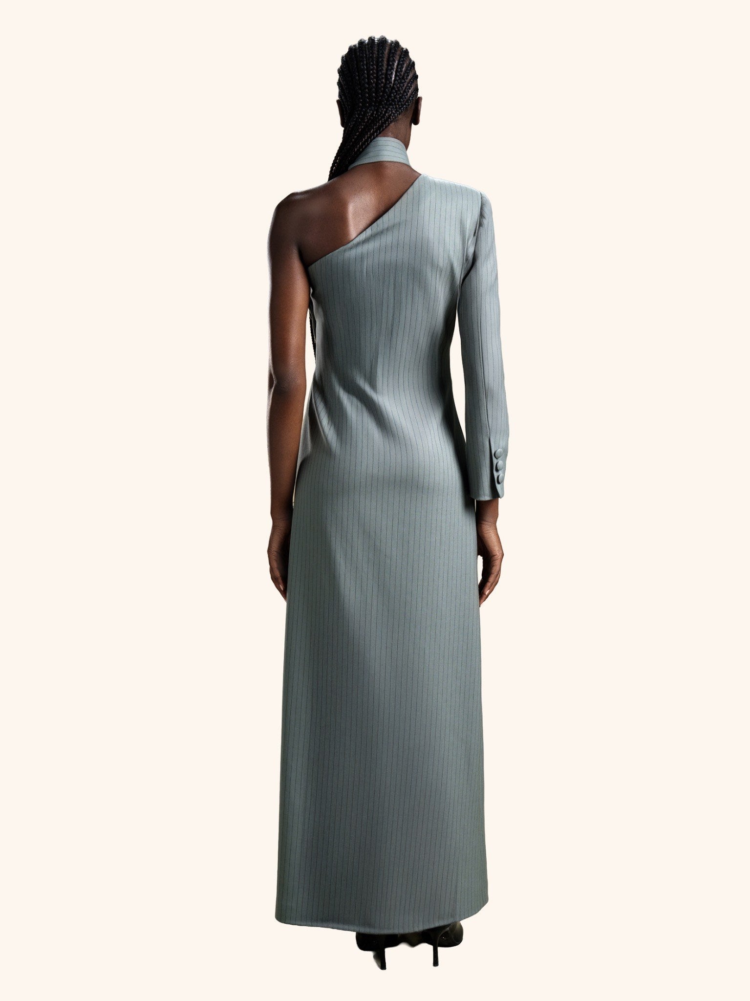 Slate Precision from our Midnight Mirage SS2026 collection. Pinstriped, asymmetrical, single-sleeve, high-collar with tie, buttoned closure. Crafted for executive / statement with tailored modernity.