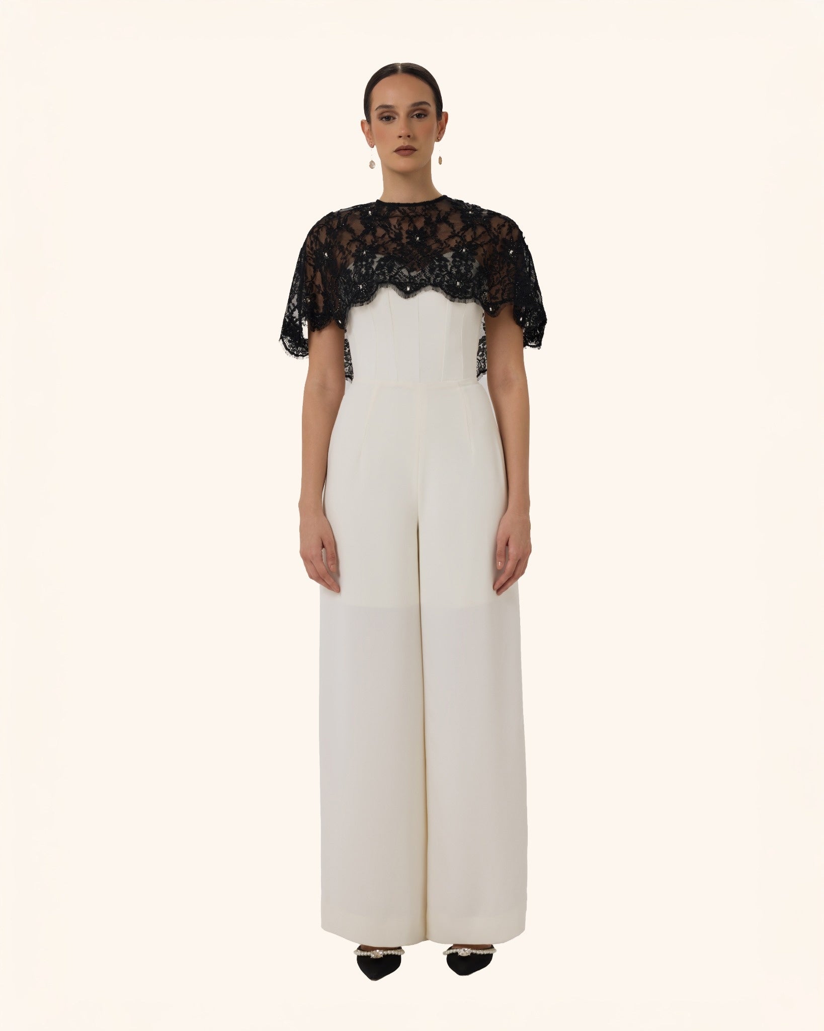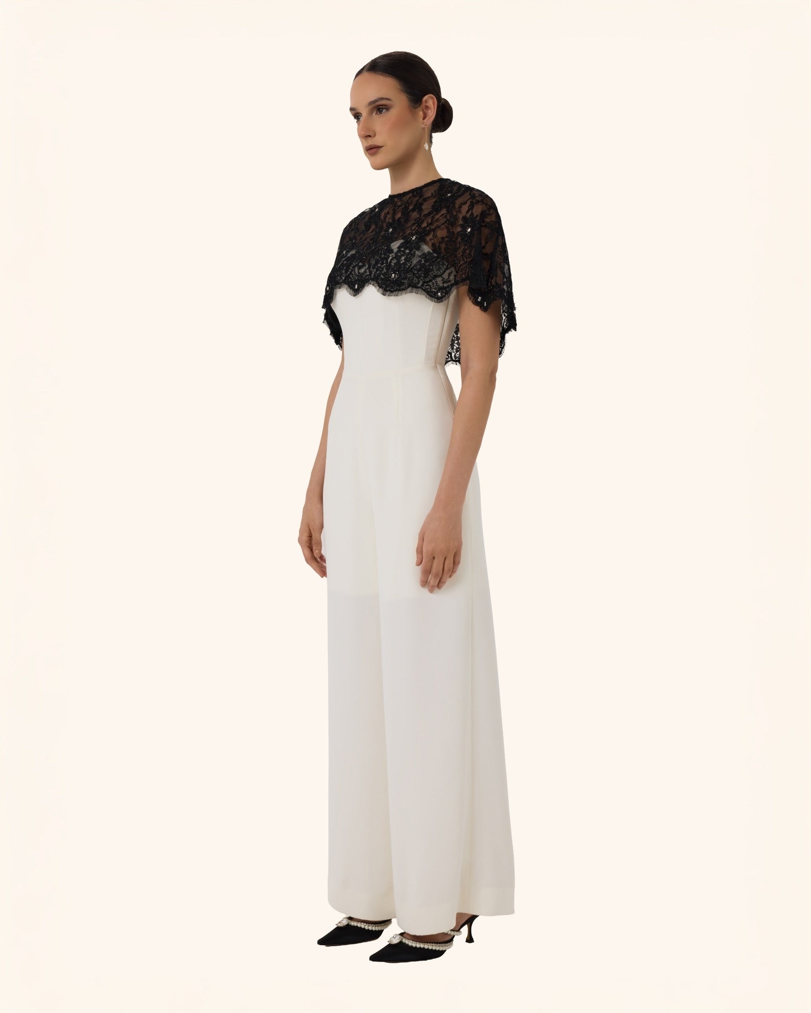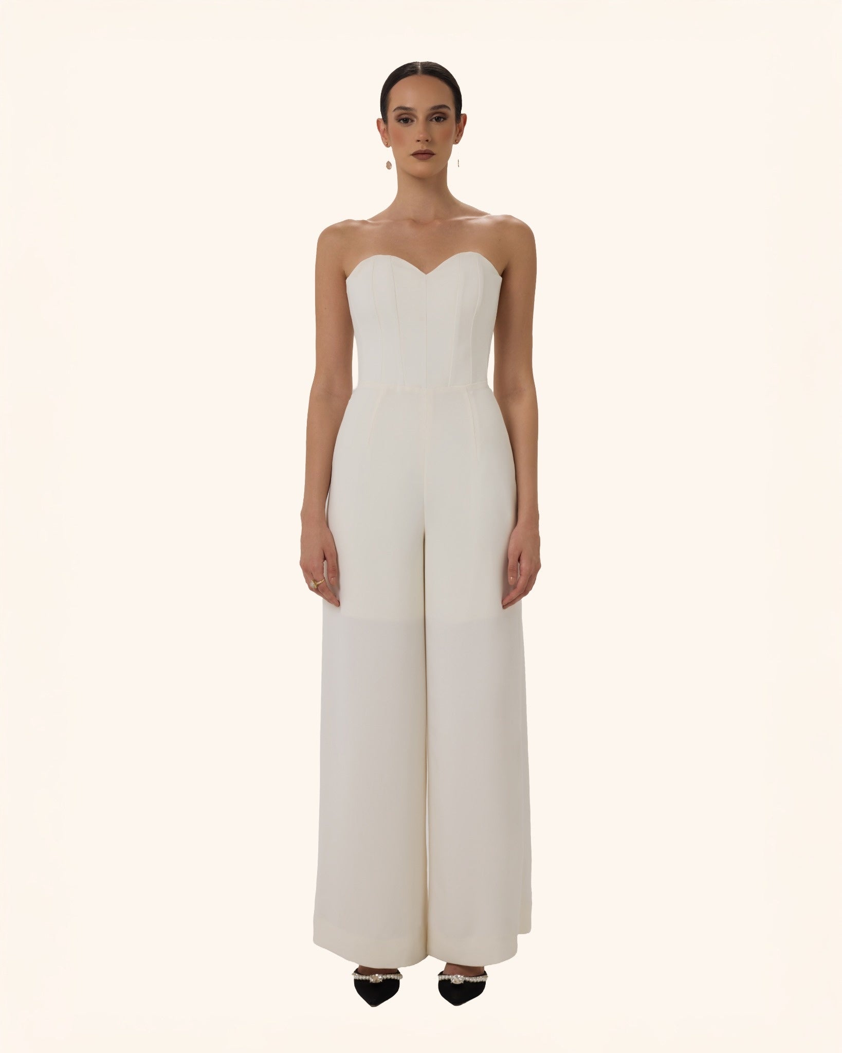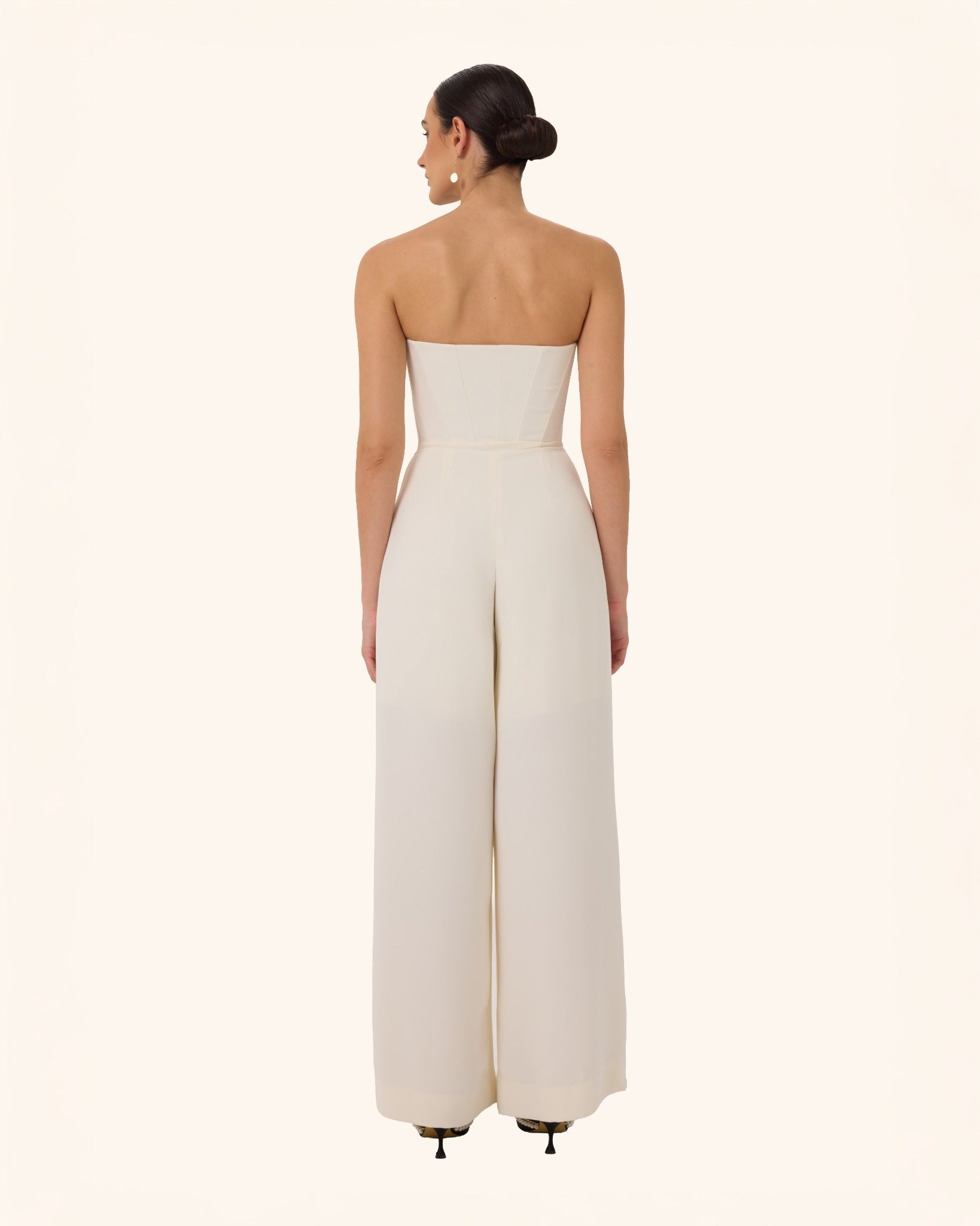 An ivory strapless jumpsuit with a sculpted bodice and wide-leg silhouette, finished with a detachable lace drape for versatile elegance.