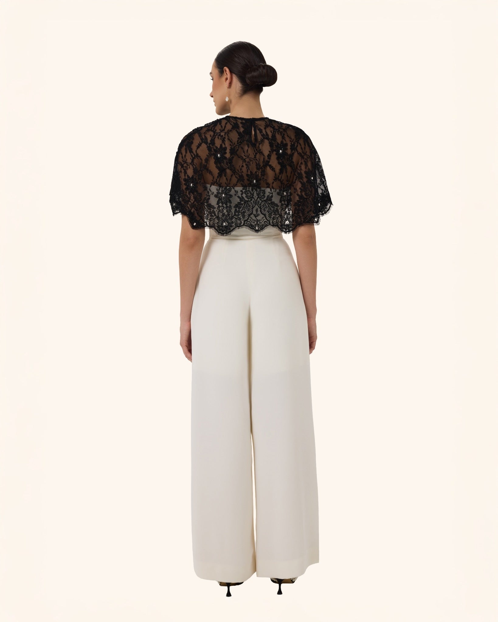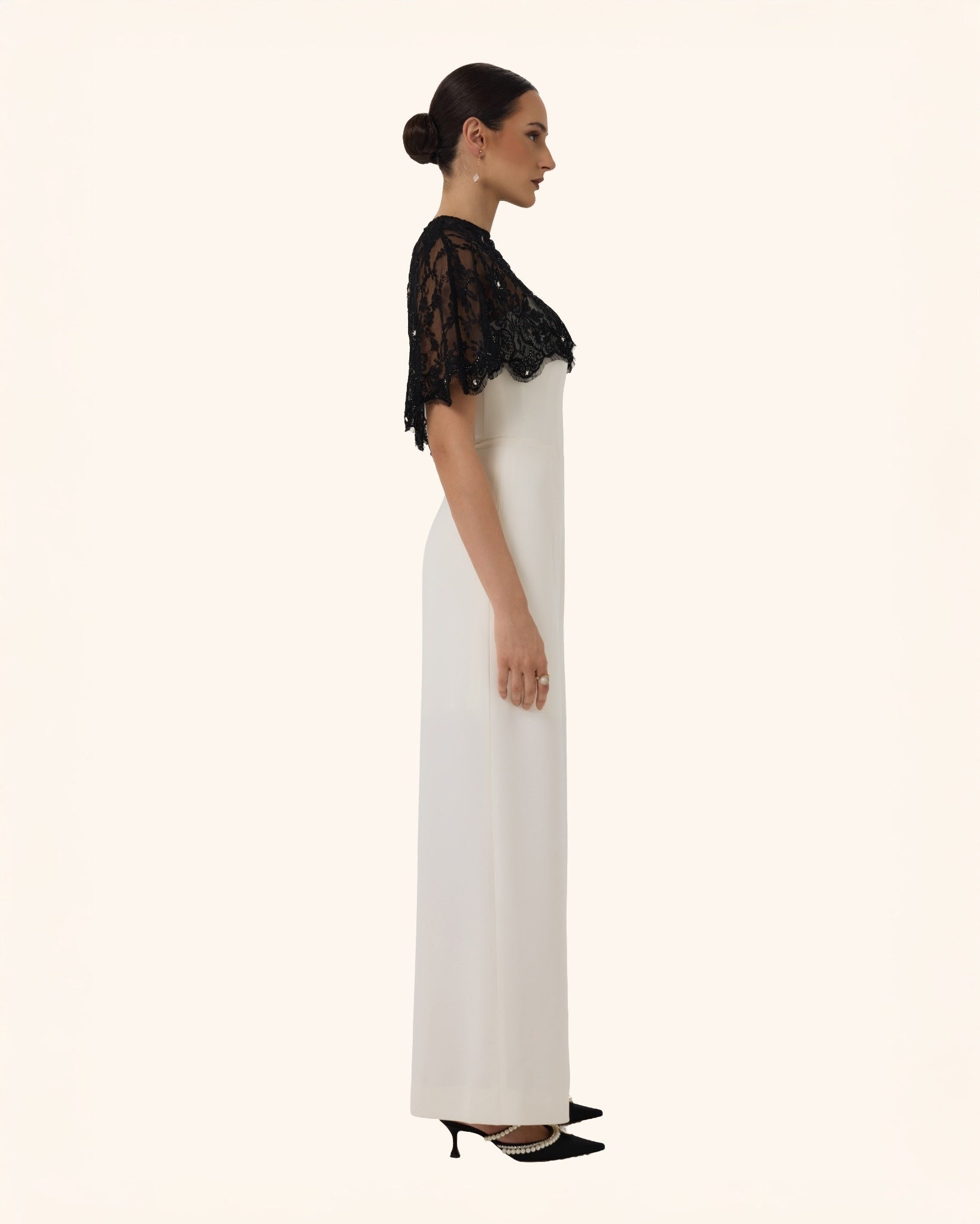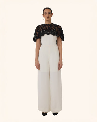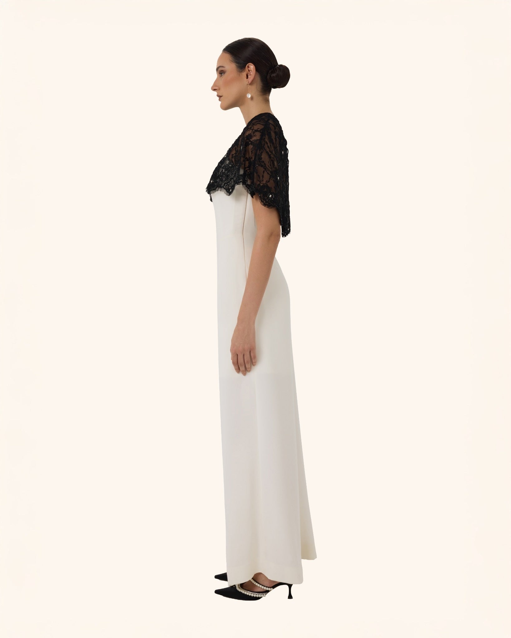 An ivory strapless jumpsuit with a sculpted bodice and wide-leg silhouette, finished with a detachable lace drape for versatile elegance.