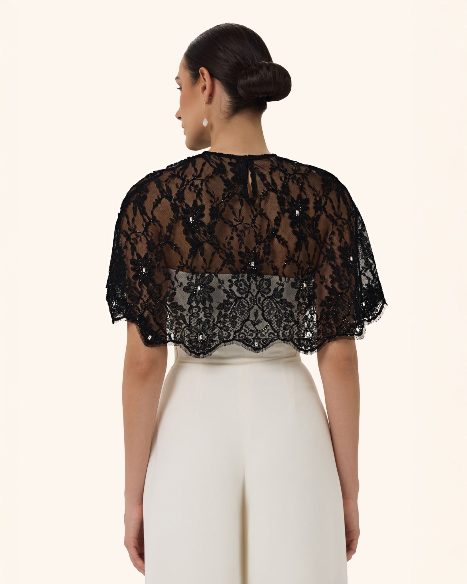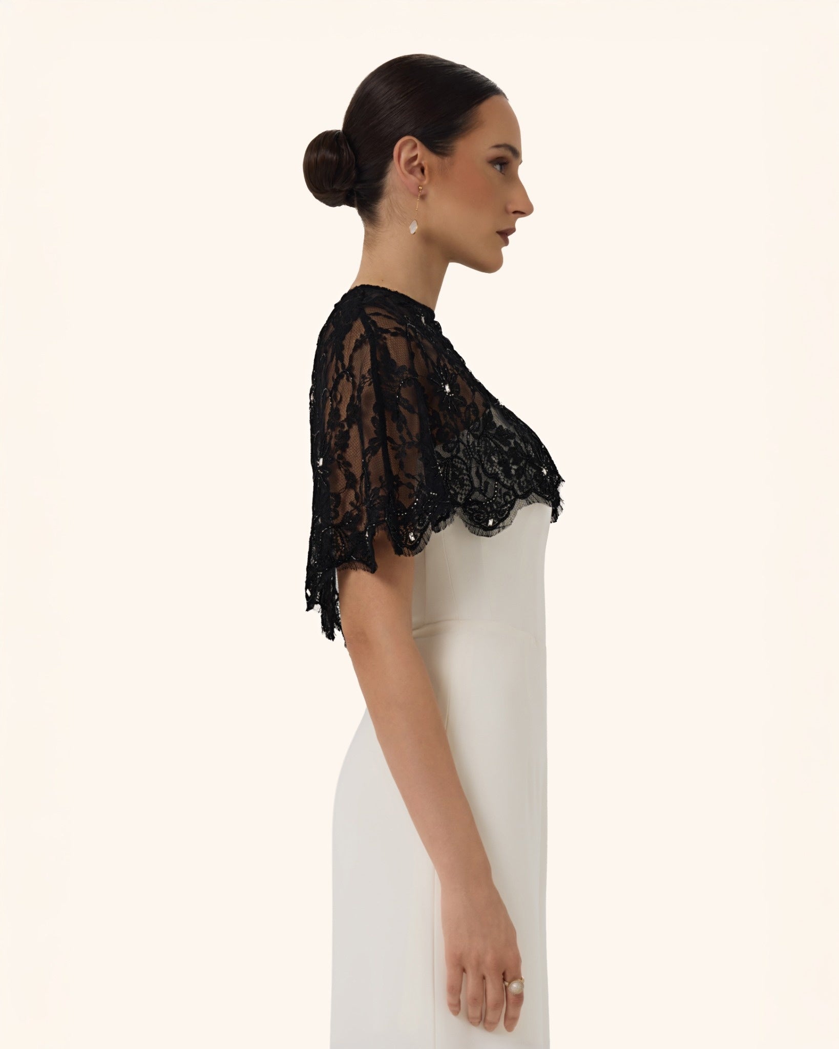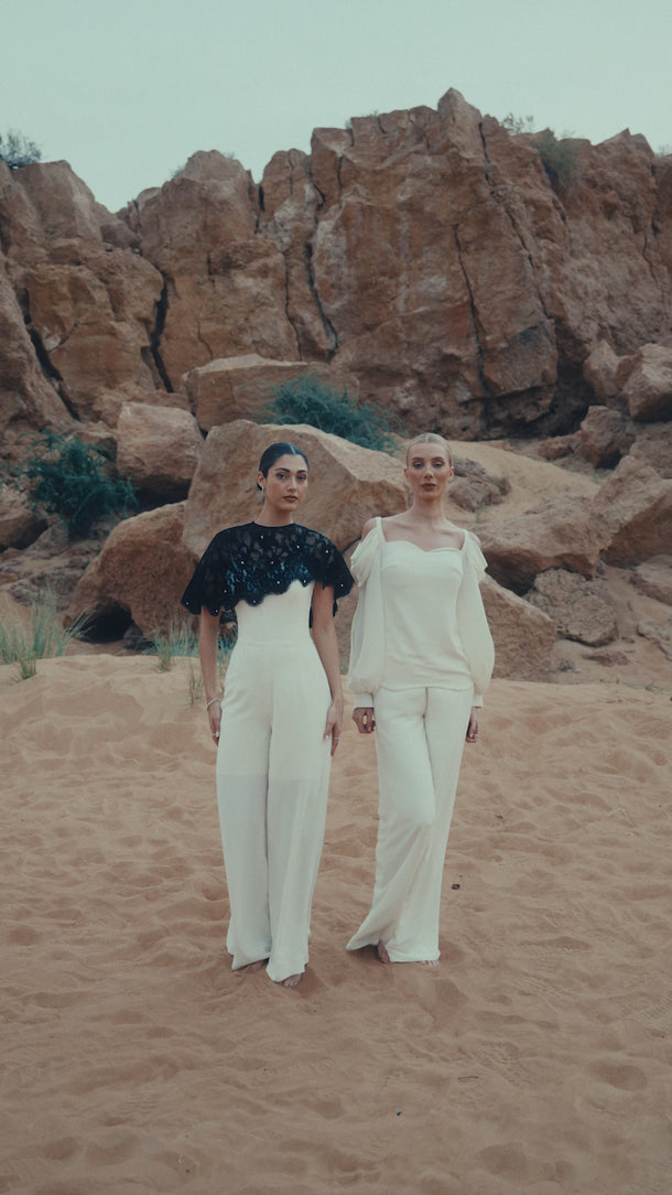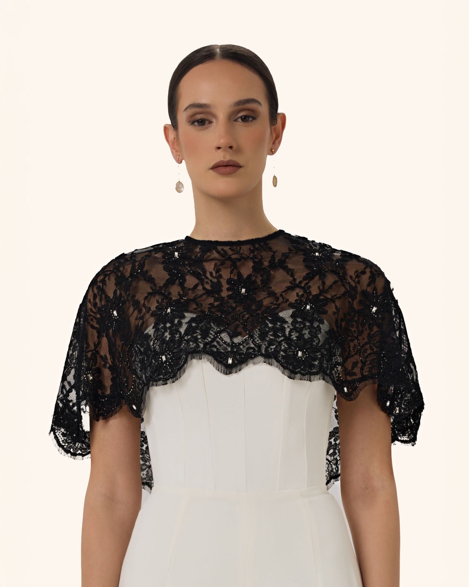 An ivory strapless jumpsuit with a sculpted bodice and wide-leg silhouette, finished with a detachable lace drape for versatile elegance.