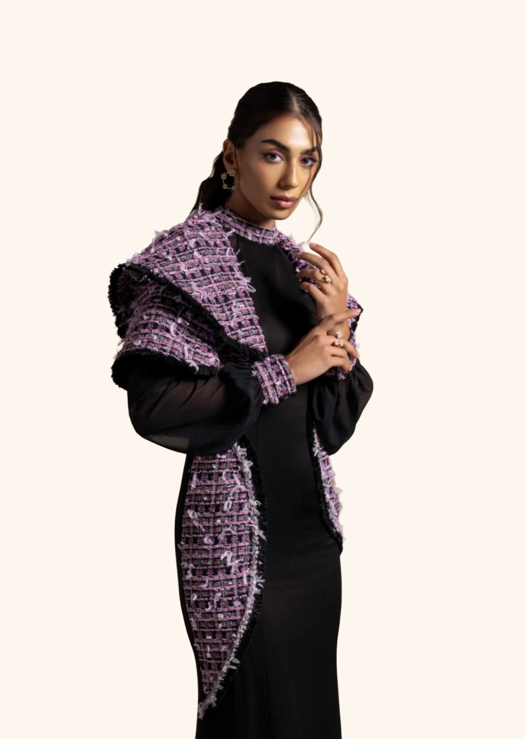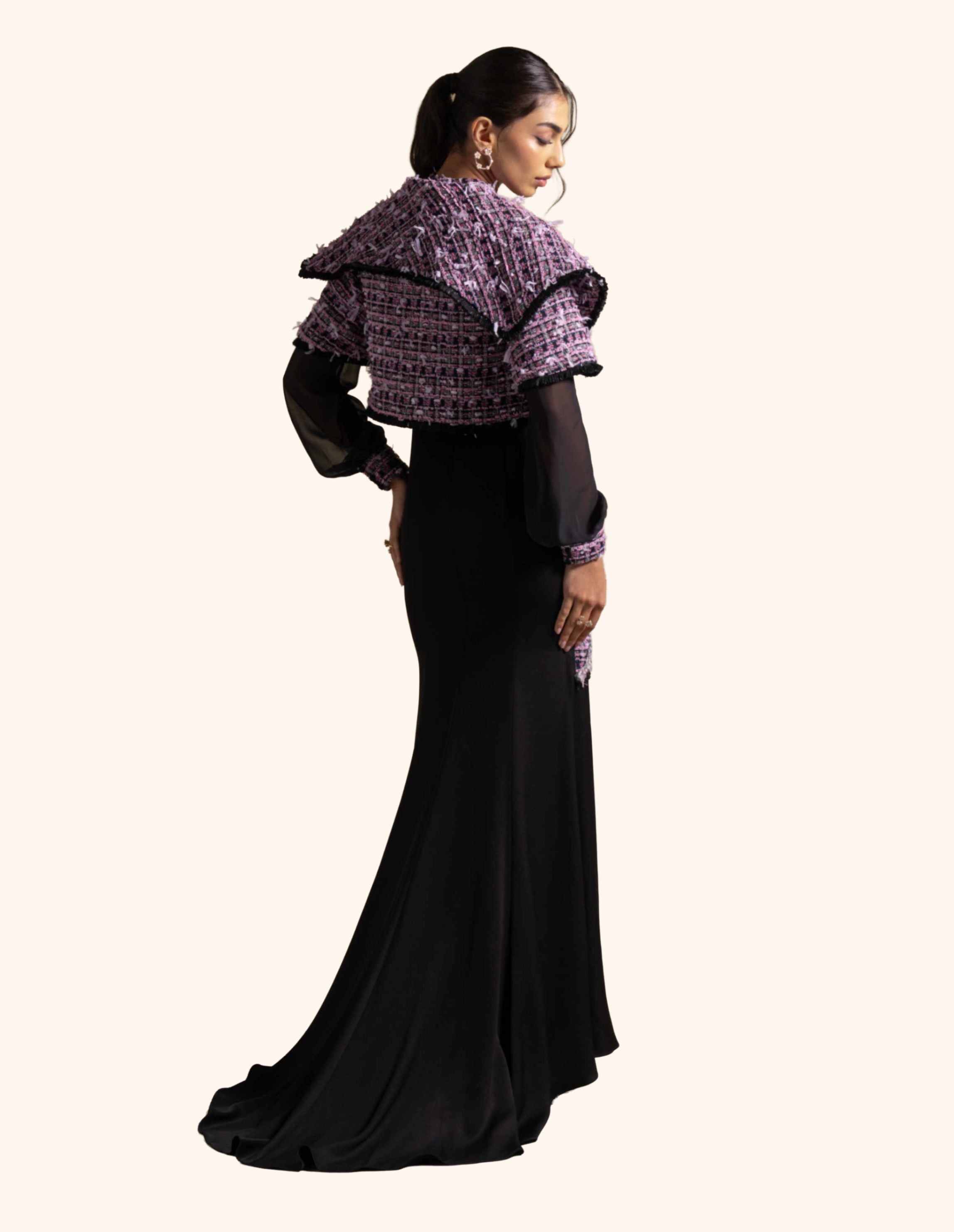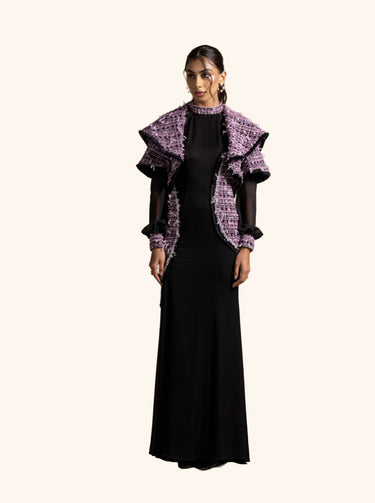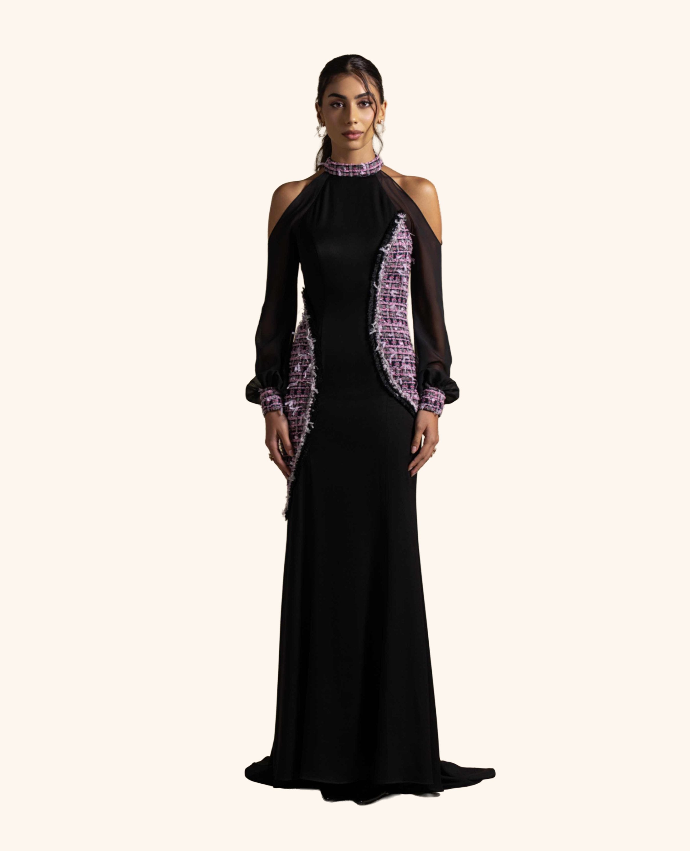 From the Zarina Collection, this Black gown features a cold-shoulder cut with sheer sleeves and contrasting tweed-inspired panel accents along the front. Its high neckline and sleek silhouette add a modern yet timeless appeal, making it perfect for evening occasions and formal gatherings.