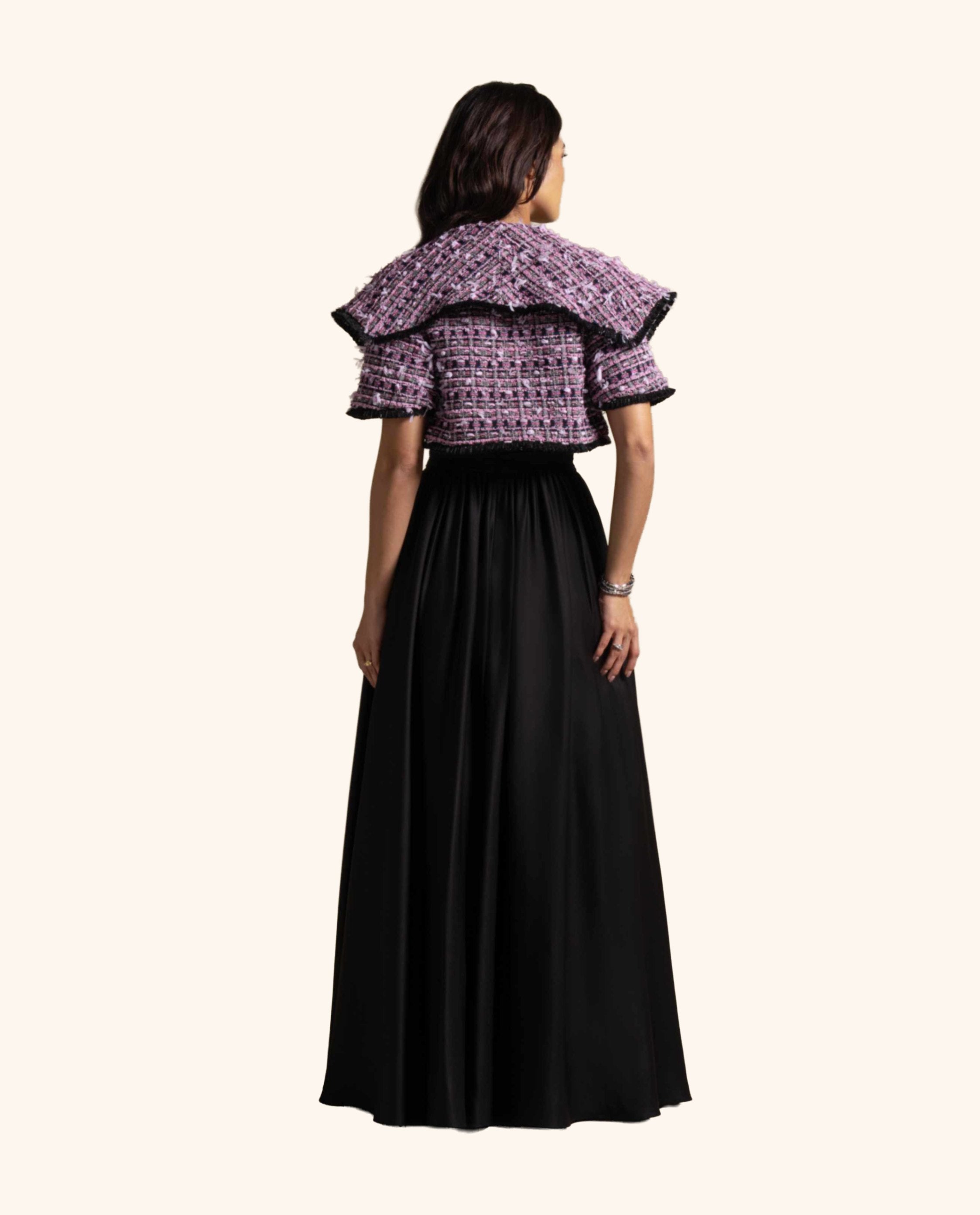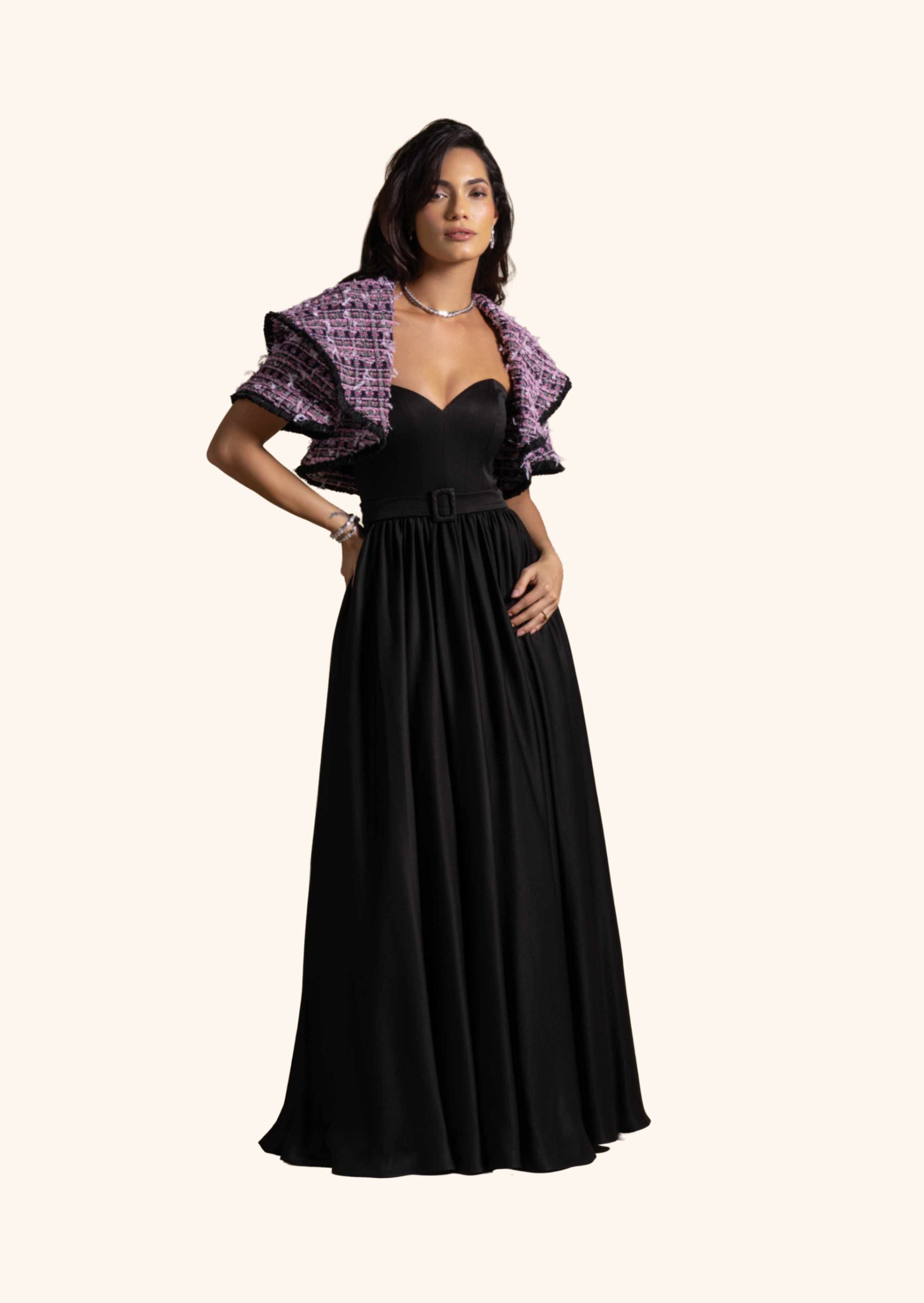 From the Zarina Collection, this elegant black gown is paired with a structured tweed jacket for a refined finish. The sweetheart neckline and belted waist create a flattering silhouette, while the cropped jacket adds texture and sophistication. Perfect for evening occasions, stylish gatherings, and modern formalwear.