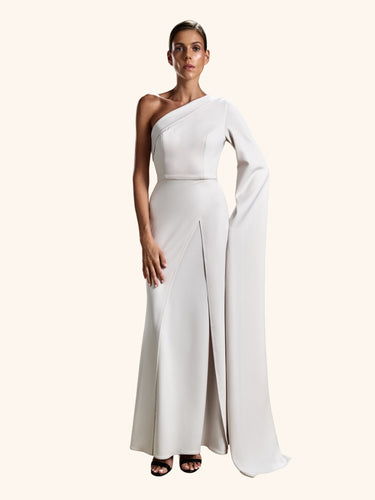 Ivory Monarch from our Midnight Mirage SS2026 collection. One-shoulder gown with dramatically extended sleeve and high side slit. Crafted for formal / evening with refined drama.
