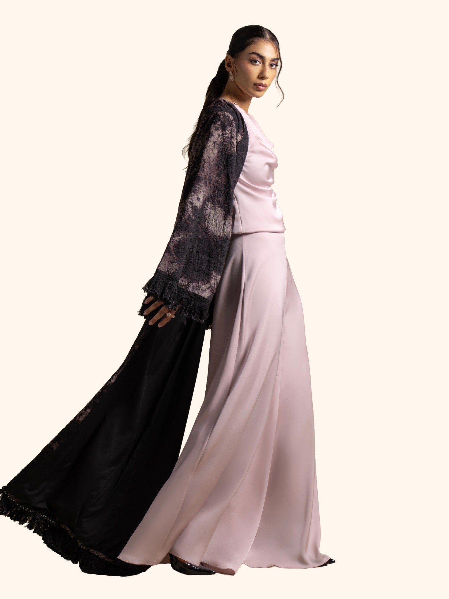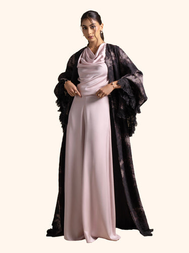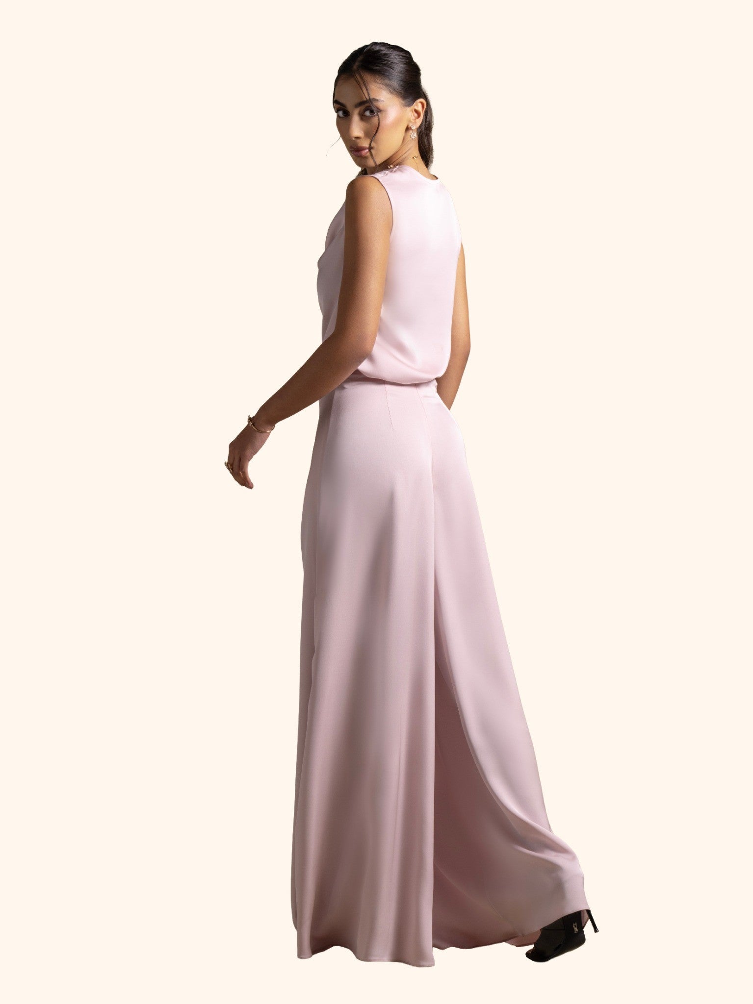 From the Zarina Collection, this Pink Quartz pantsuit features a soft draped cowl-neck top paired with wide-leg tailored trousers. Elegant and versatile, it is perfect for formal occasions, chic gatherings, and modern eveningwear.