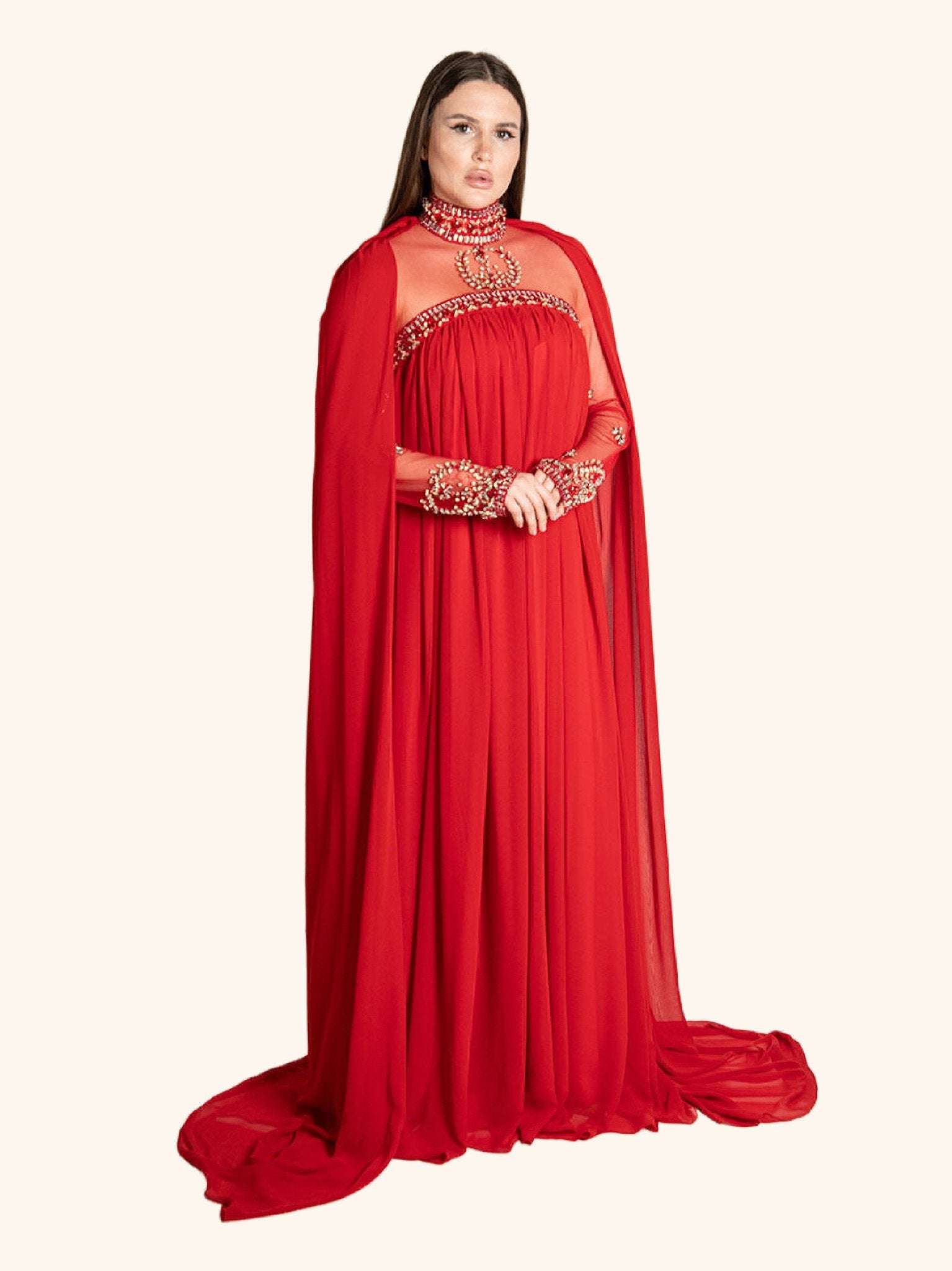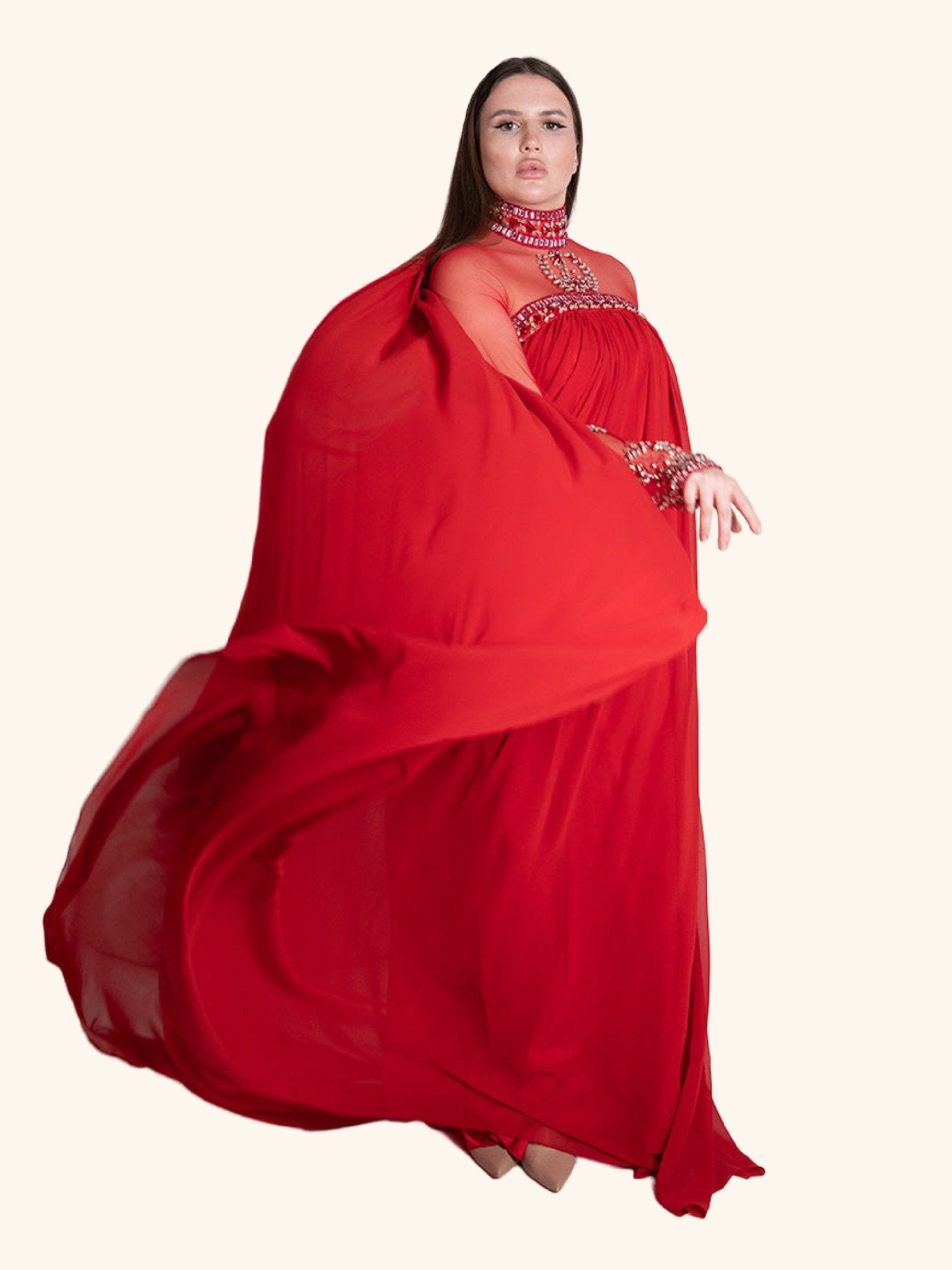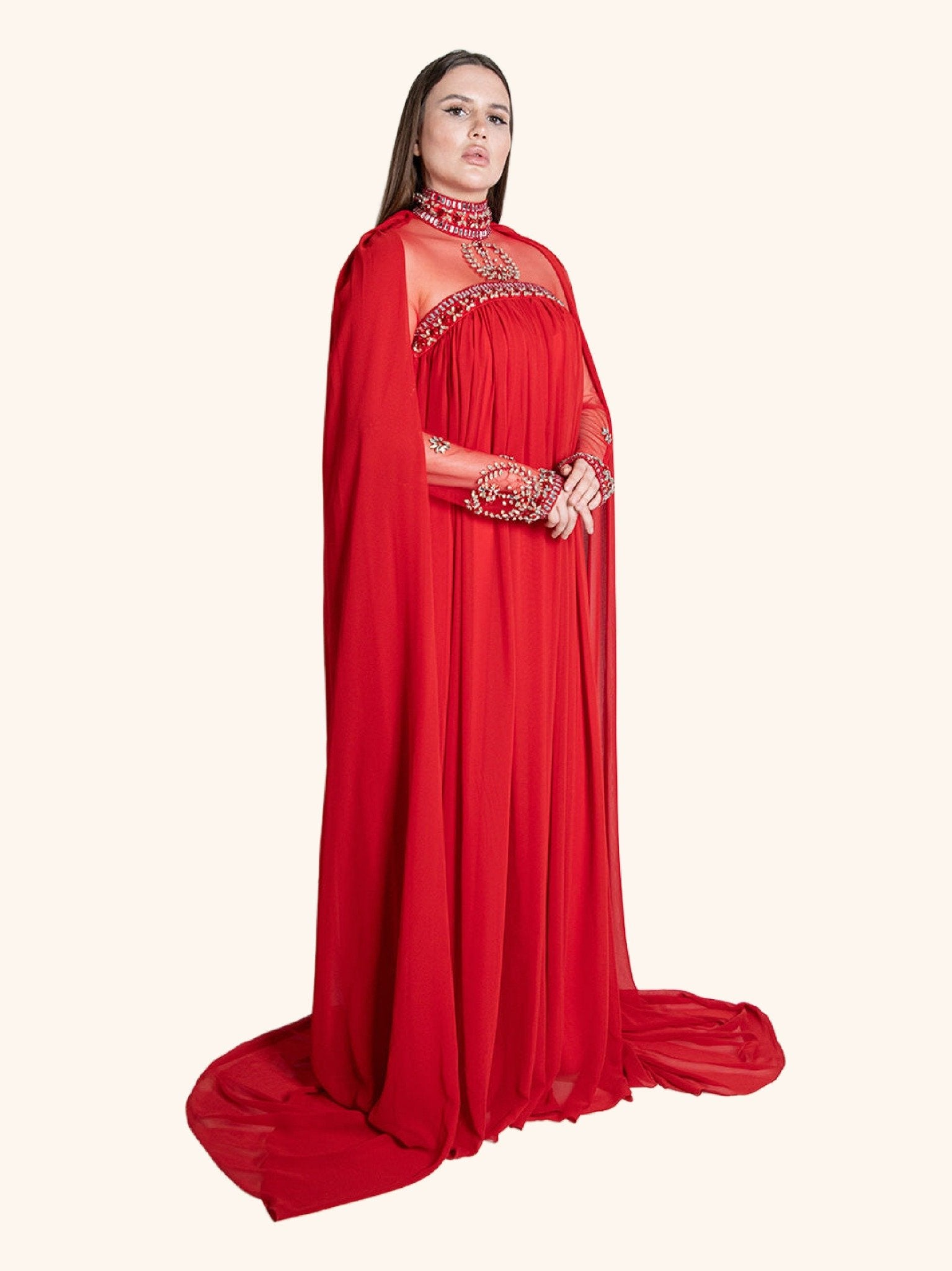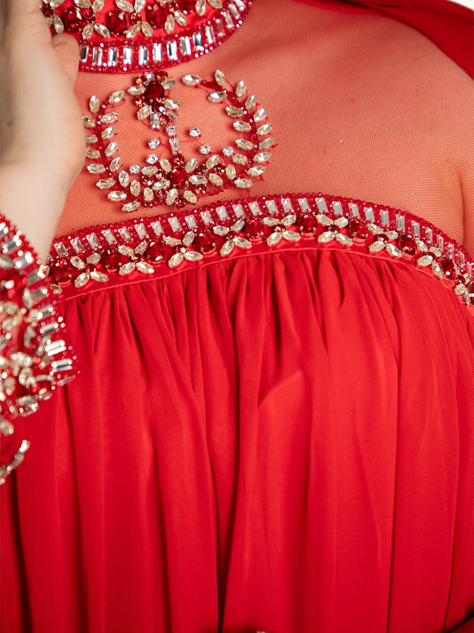 Hand-embroidered red chiffon dress with elegant layered flow.