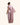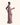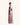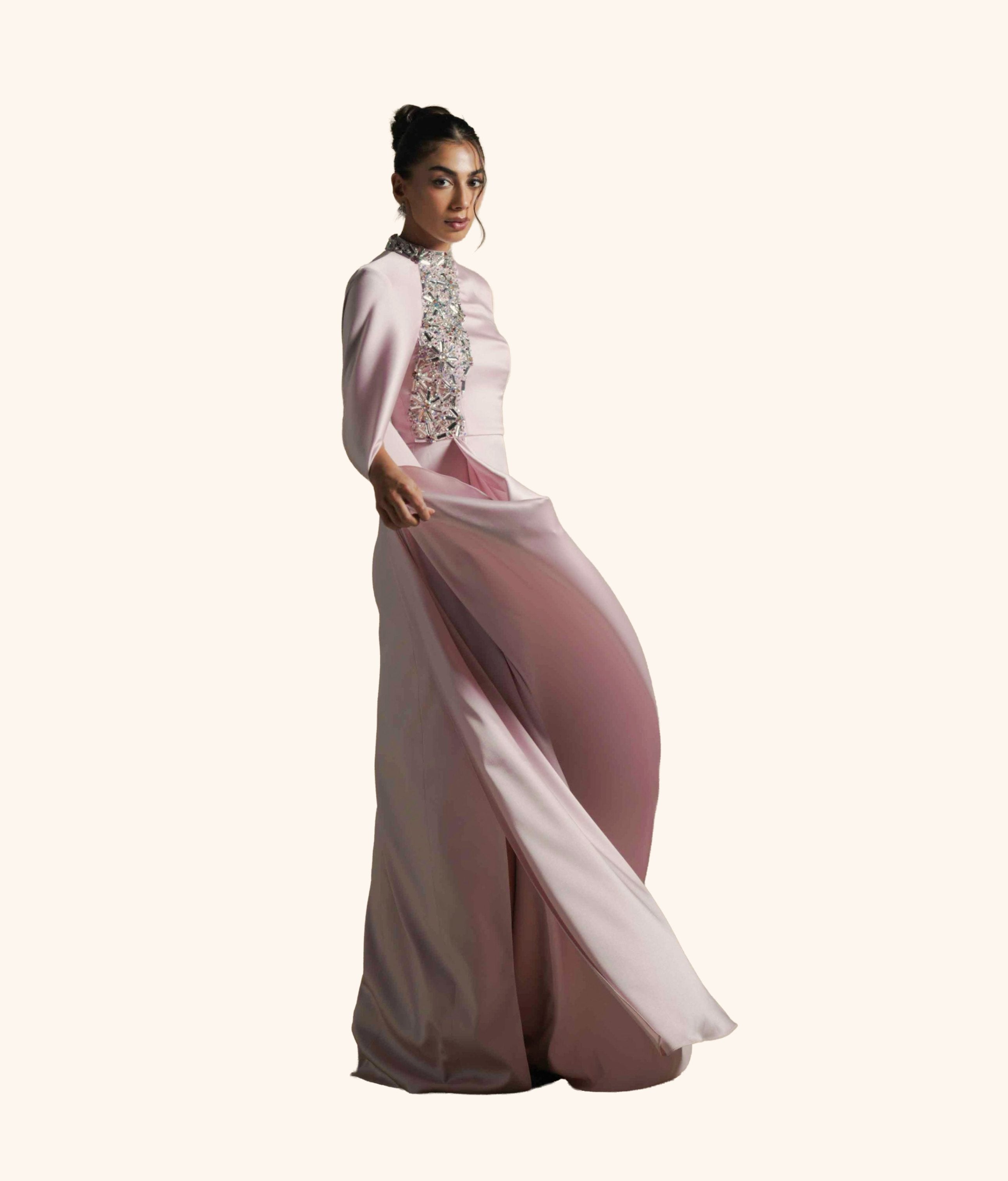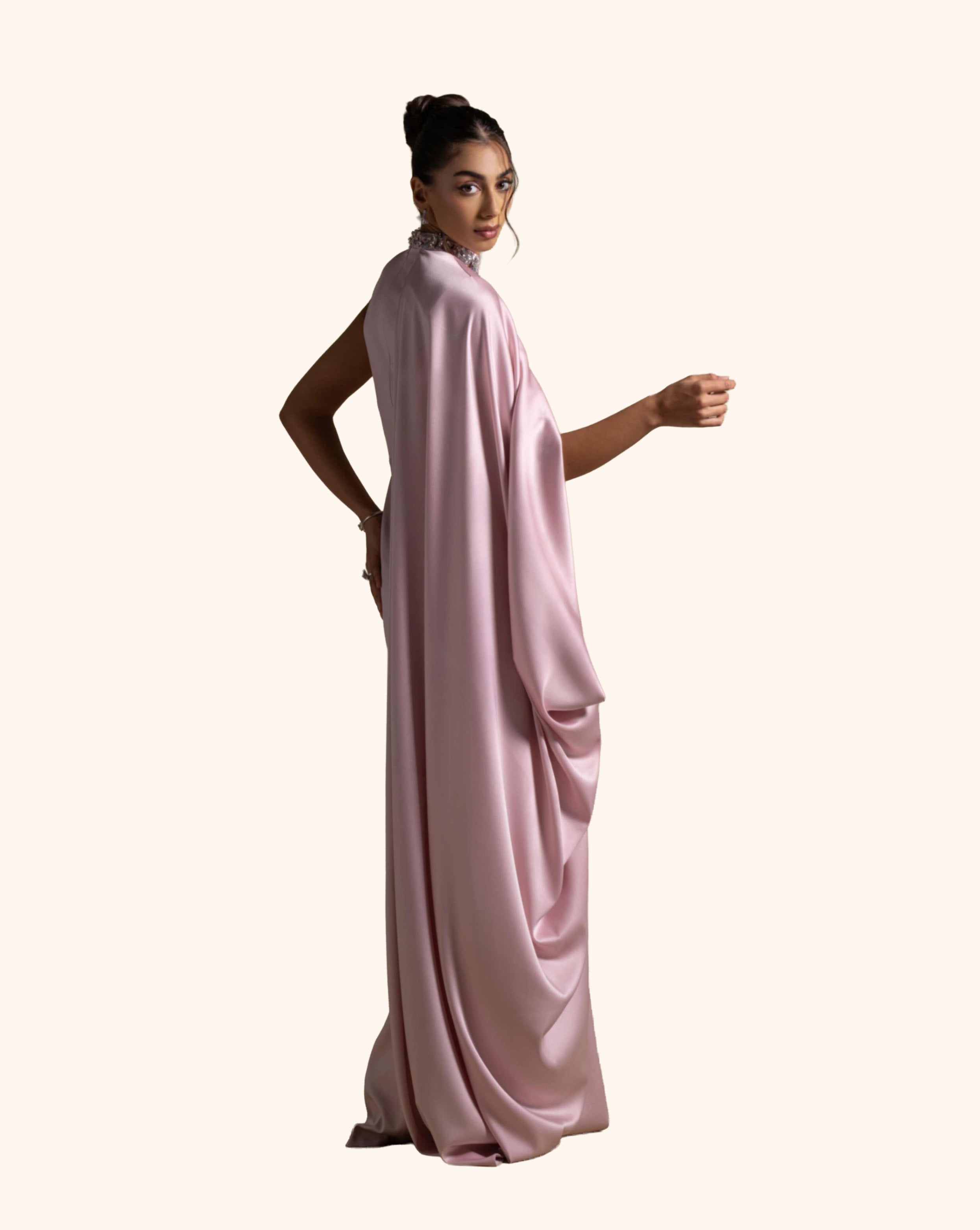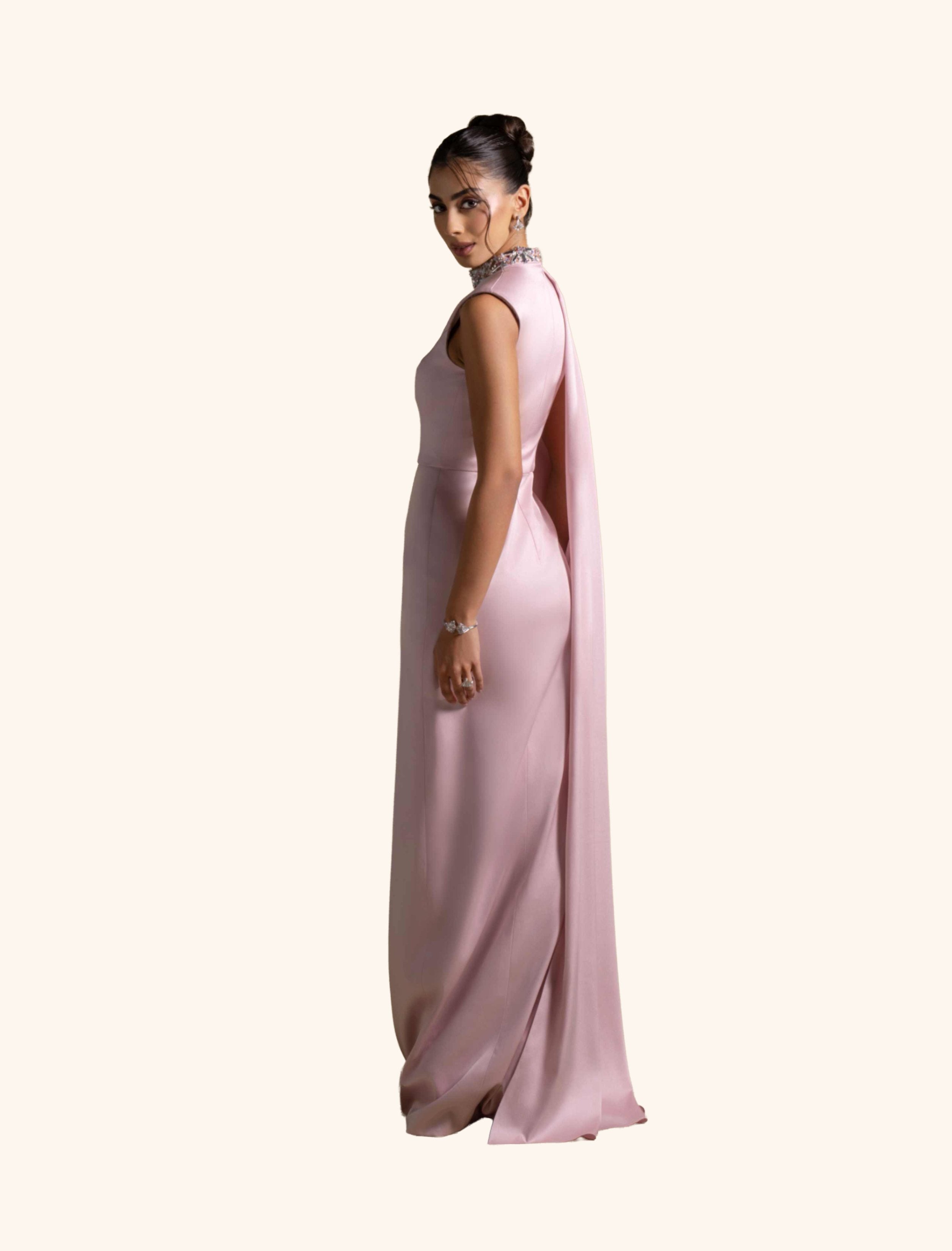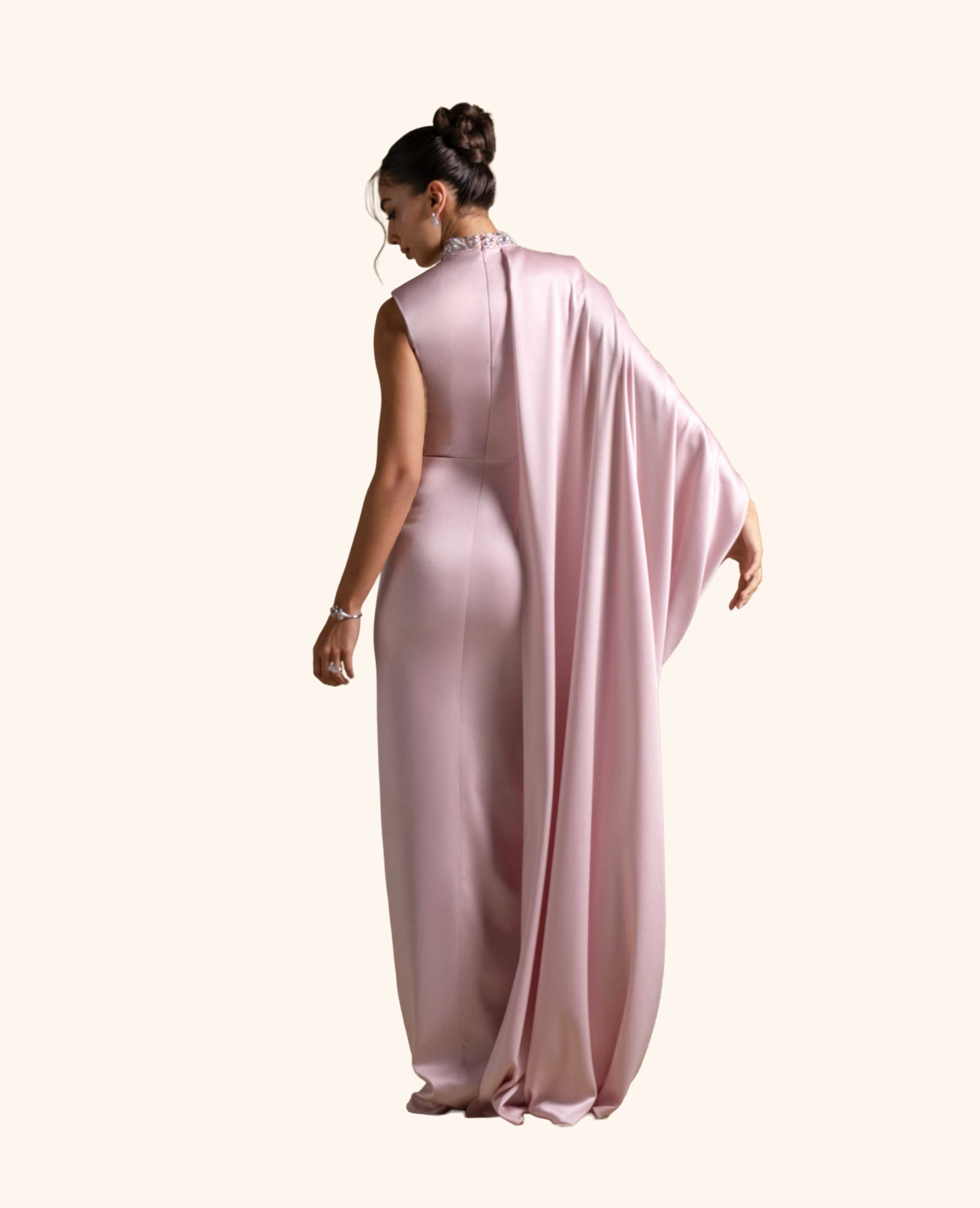 A statement gown in soft Pink Quartz satin, featuring a high neckline adorned with intricate crystal embellishments and a flowing draped cape for timeless elegance.