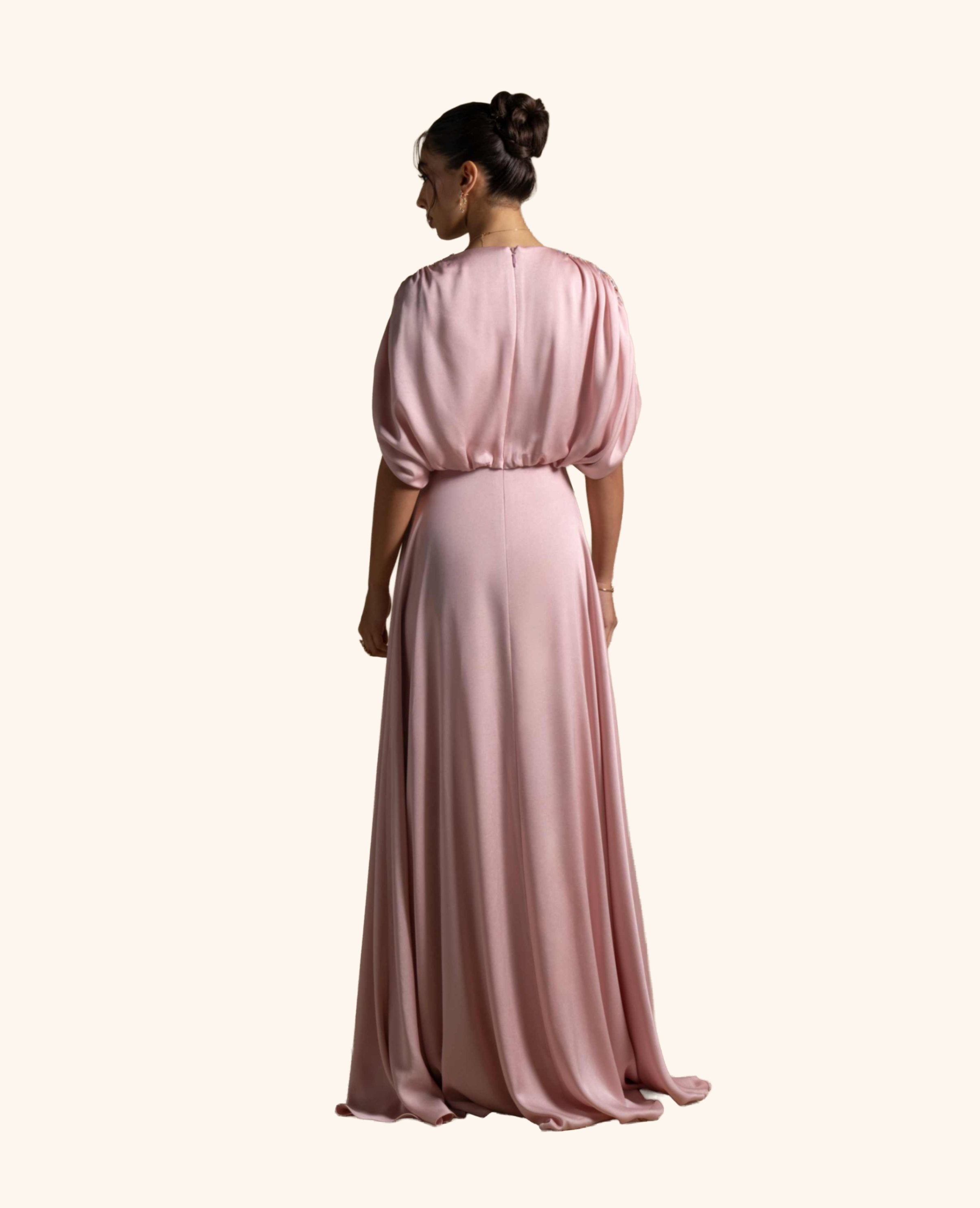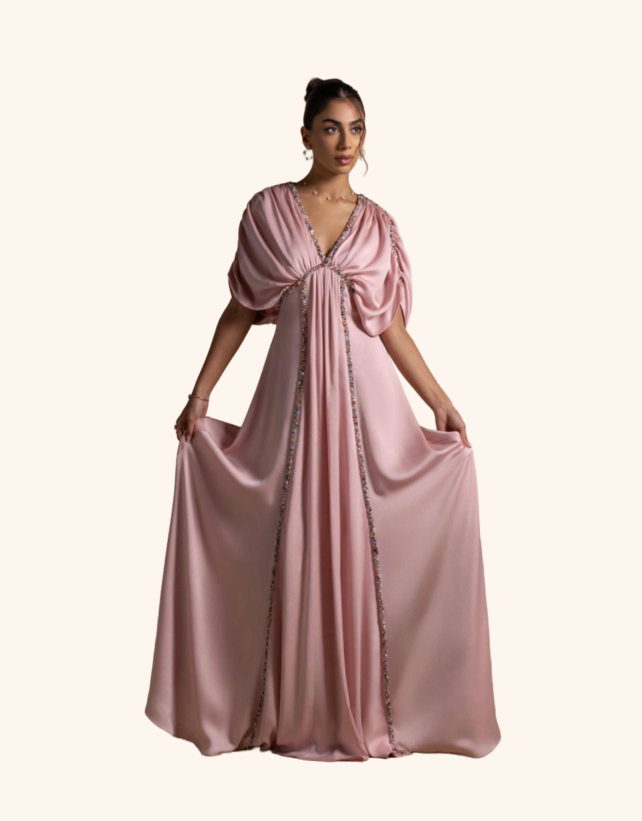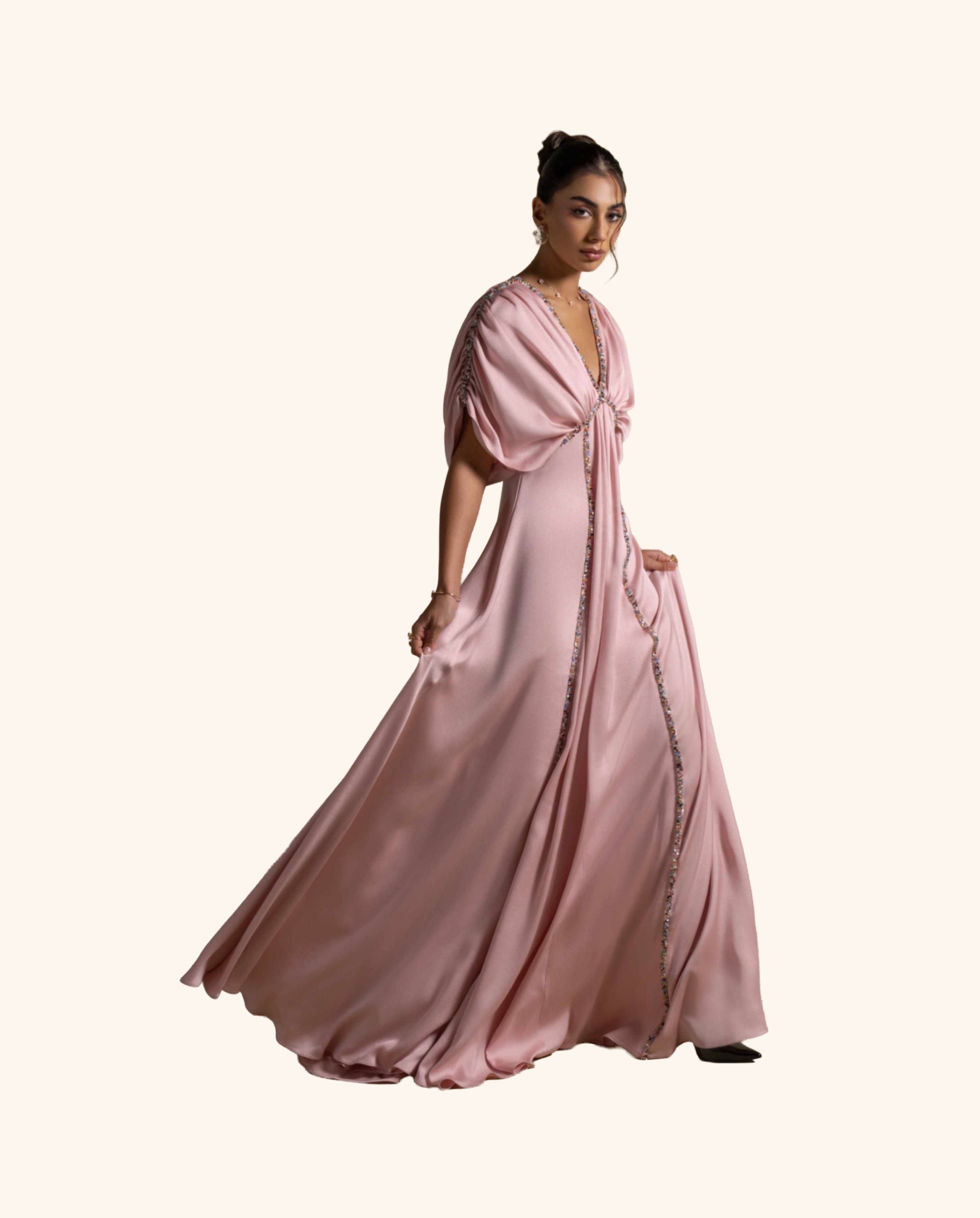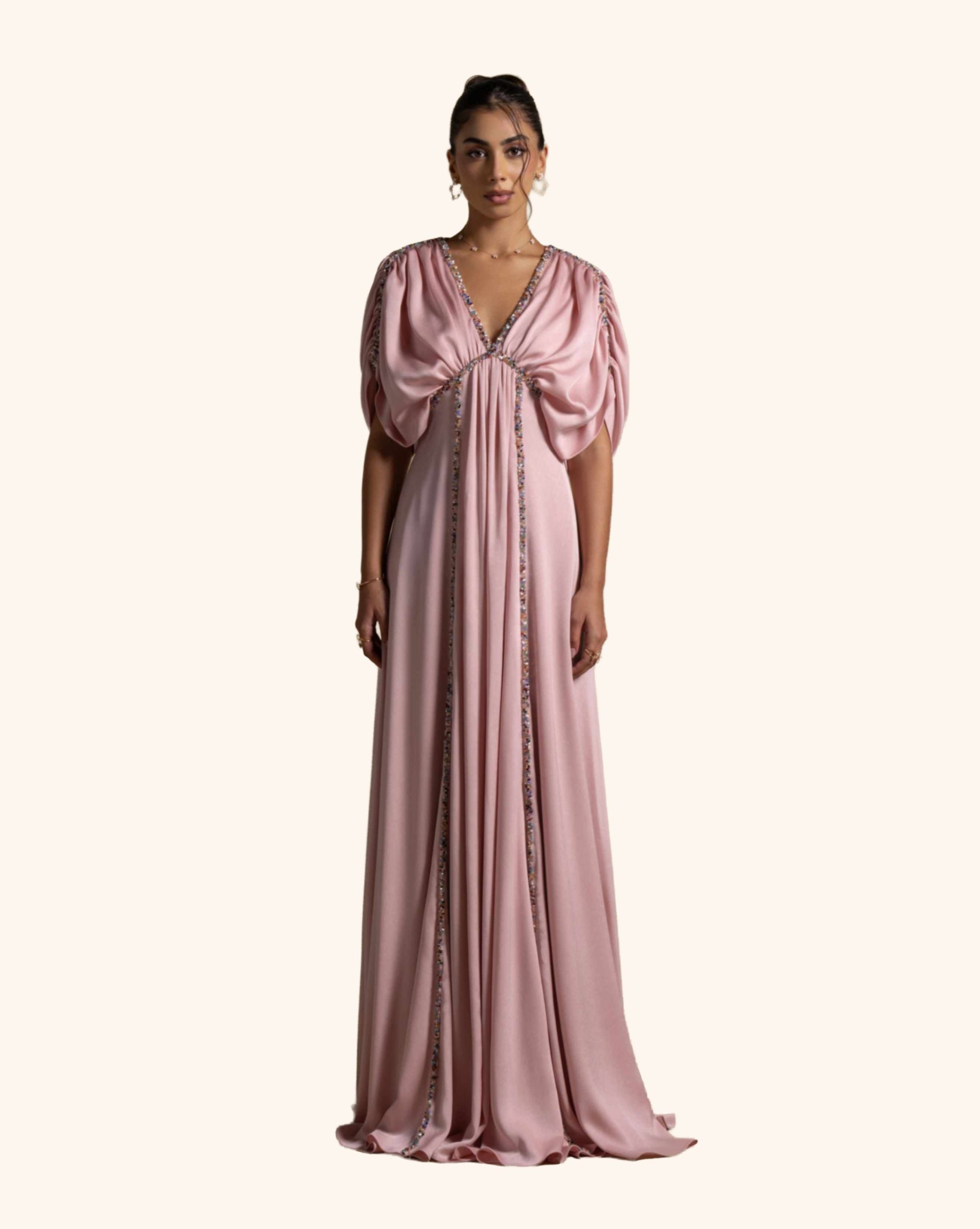 From the Zarina Collection, this Baby Pink gown features a flowing silhouette with gathered detailing at the bust and embellished trims along the neckline and front drape. Soft and graceful, it is perfect for weddings, evening occasions, and elegant celebrations.