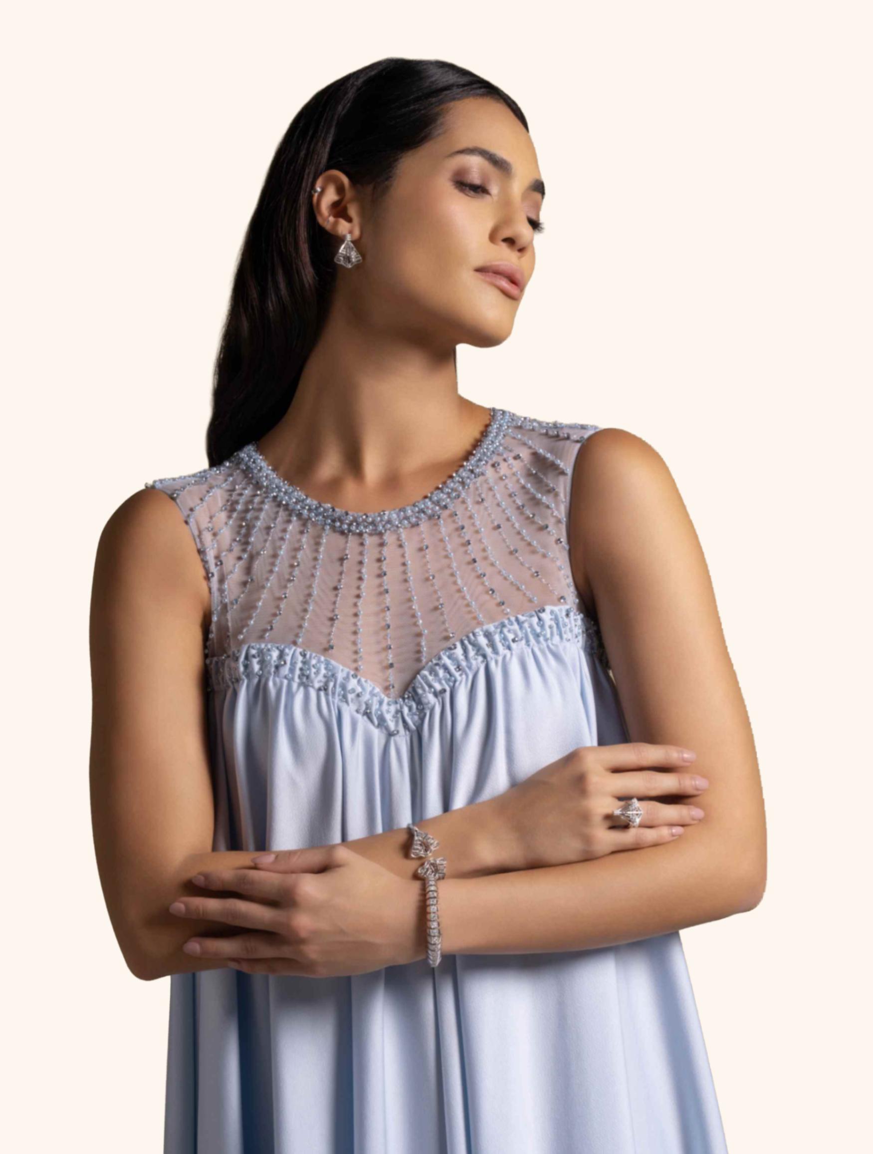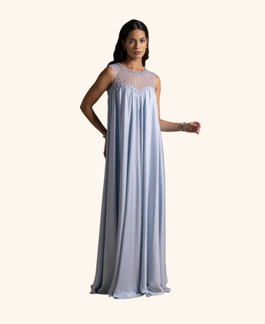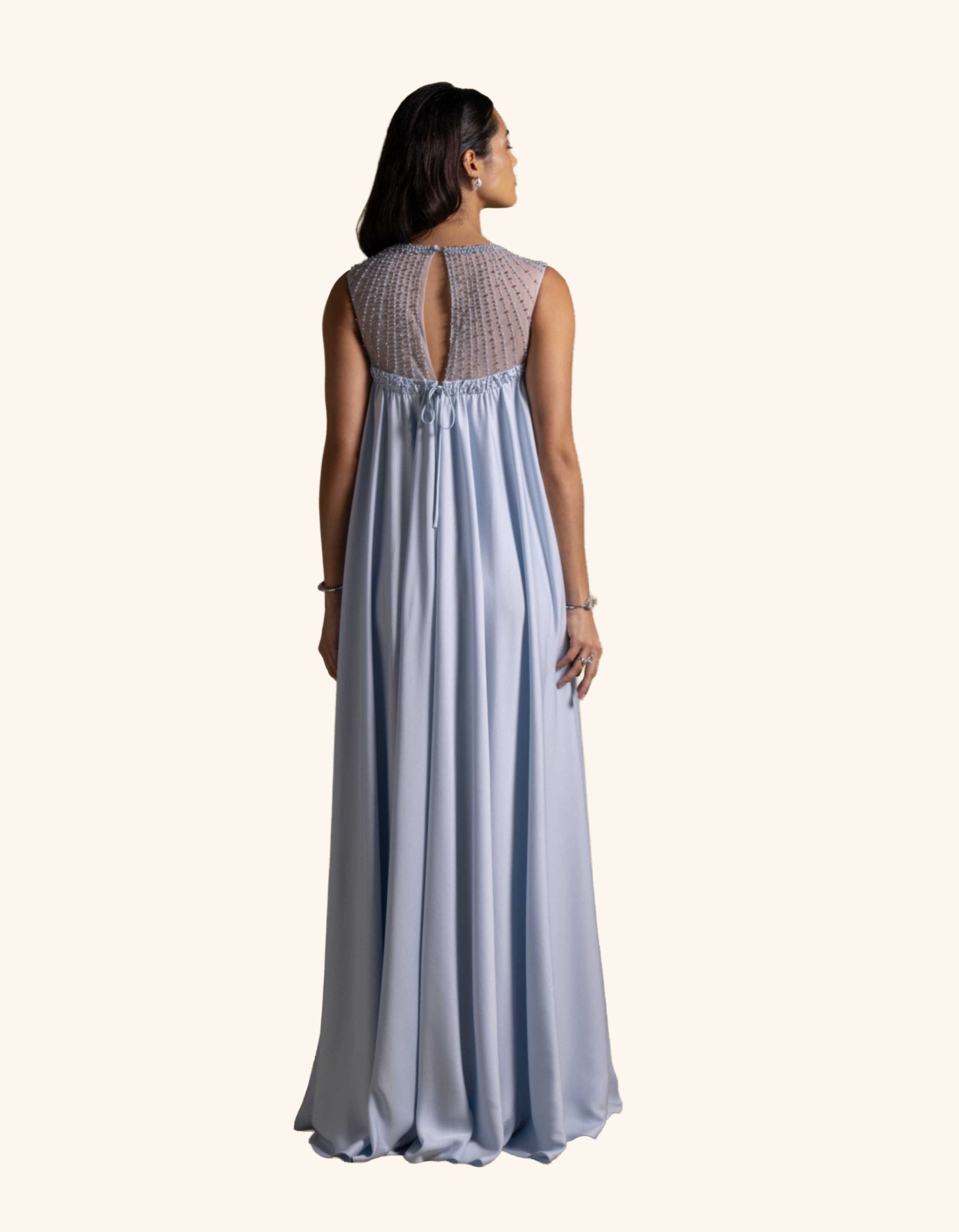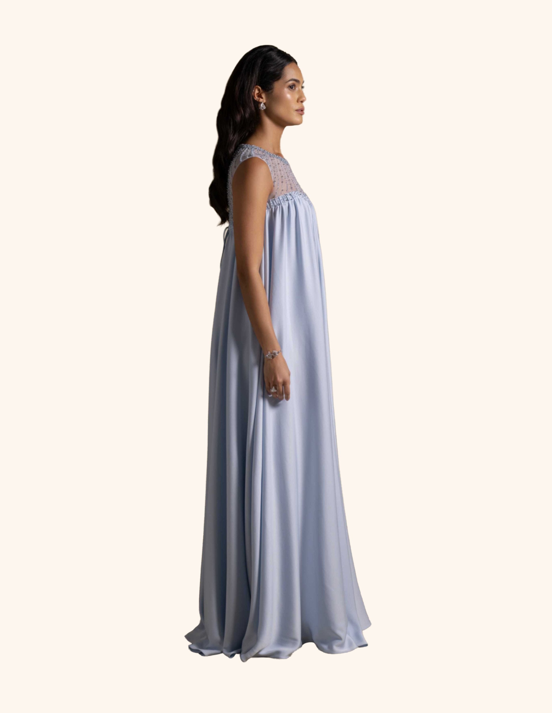 From the Zarina Collection, the Justina gown in Baby Blue features a graceful free-flowing silhouette with a sheer embroidered neckline and delicate bead accents. Light and ethereal, it is perfect for evening receptions, garden weddings, and refined celebrations.