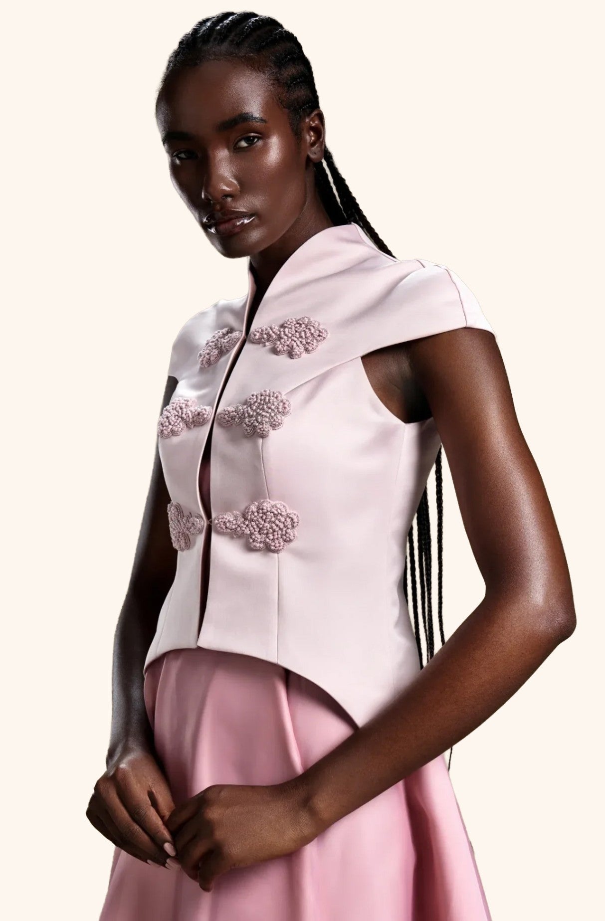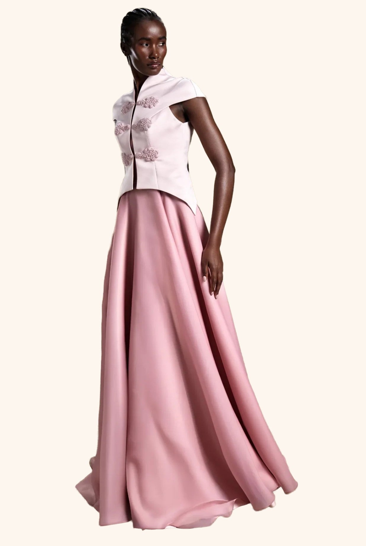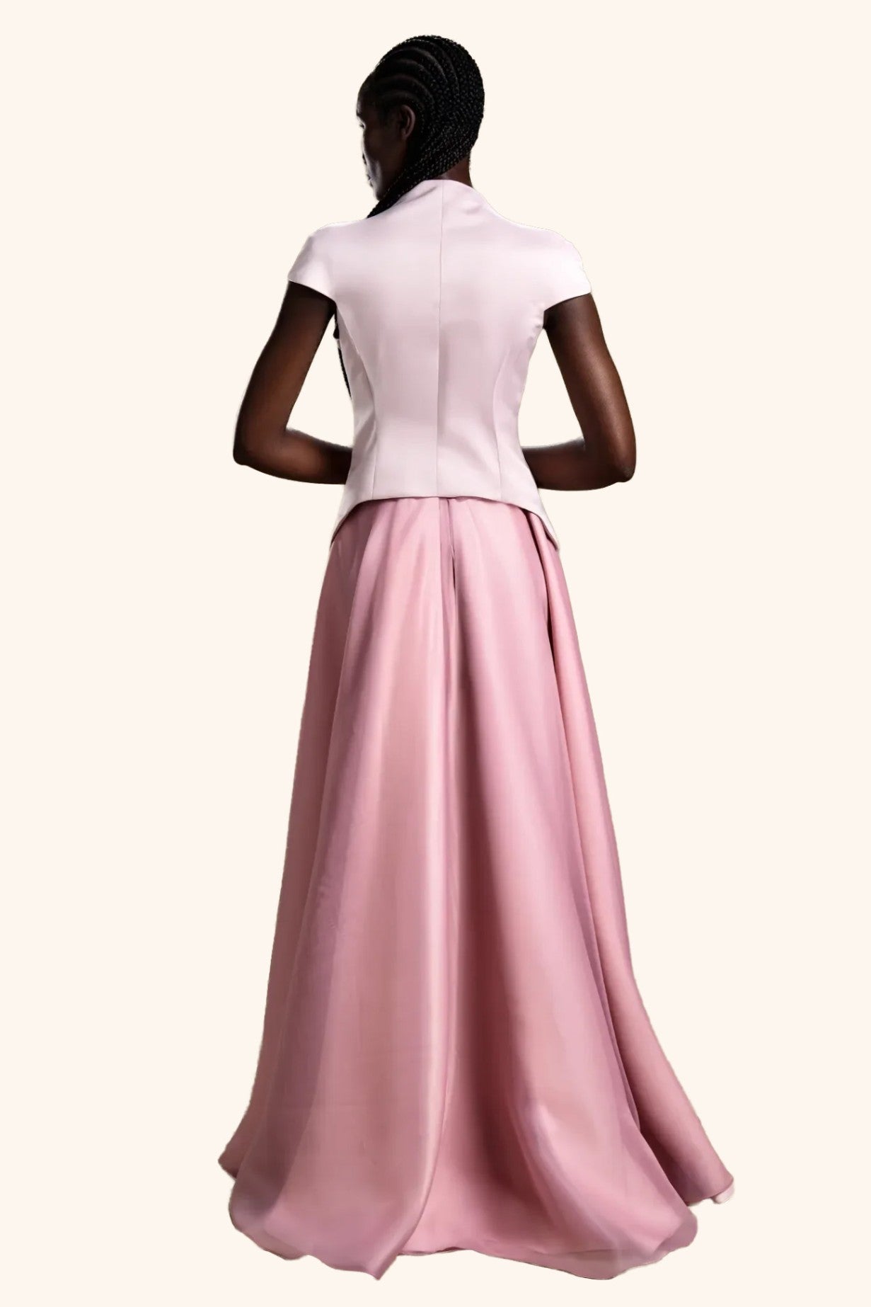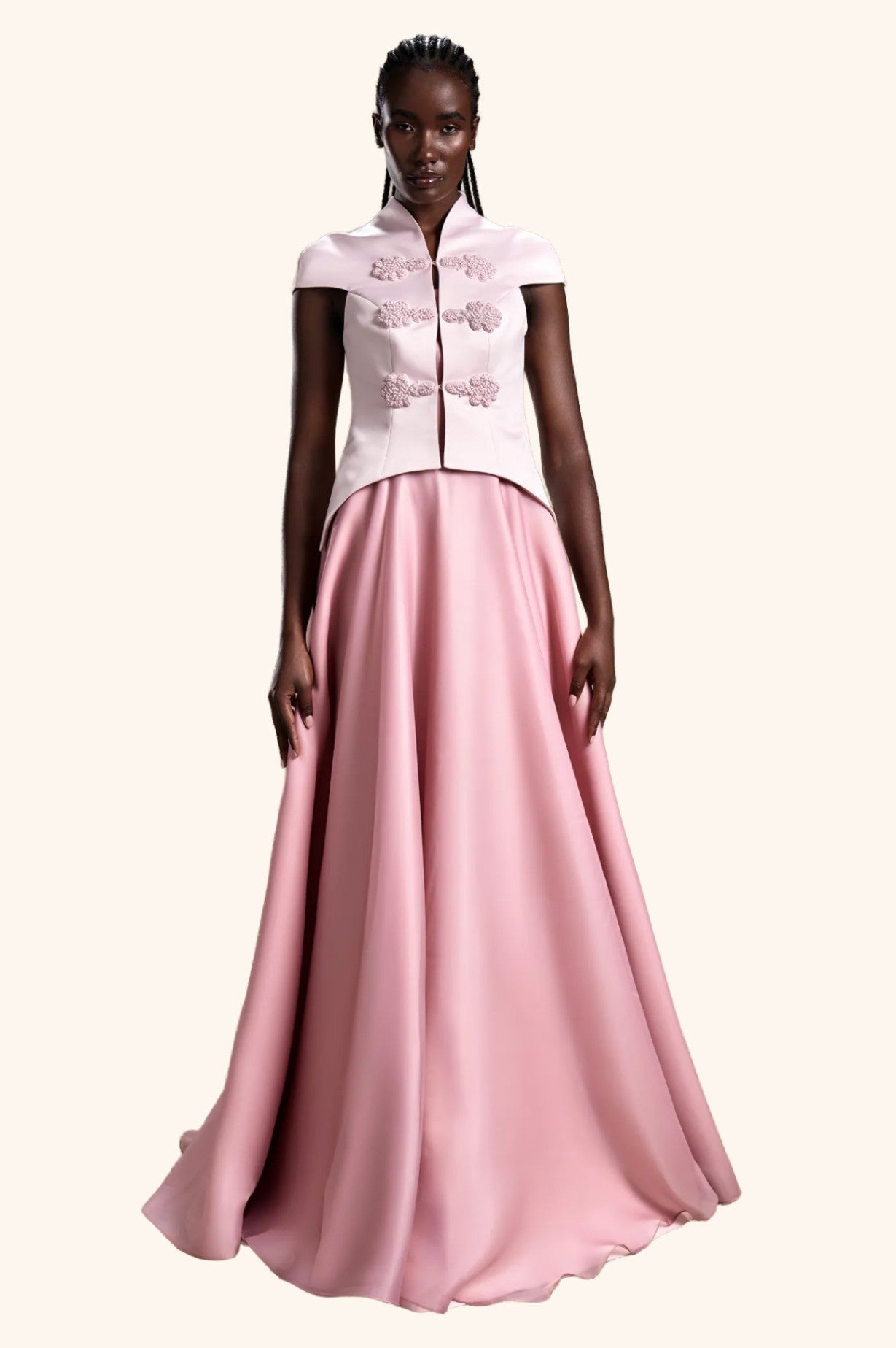 Orchid Sovereign from our Midnight Mirage SS2026 collection. Structured short-sleeve jacket with floral embellishment, voluminous dress. Crafted for formal / ceremony with feminine authority.