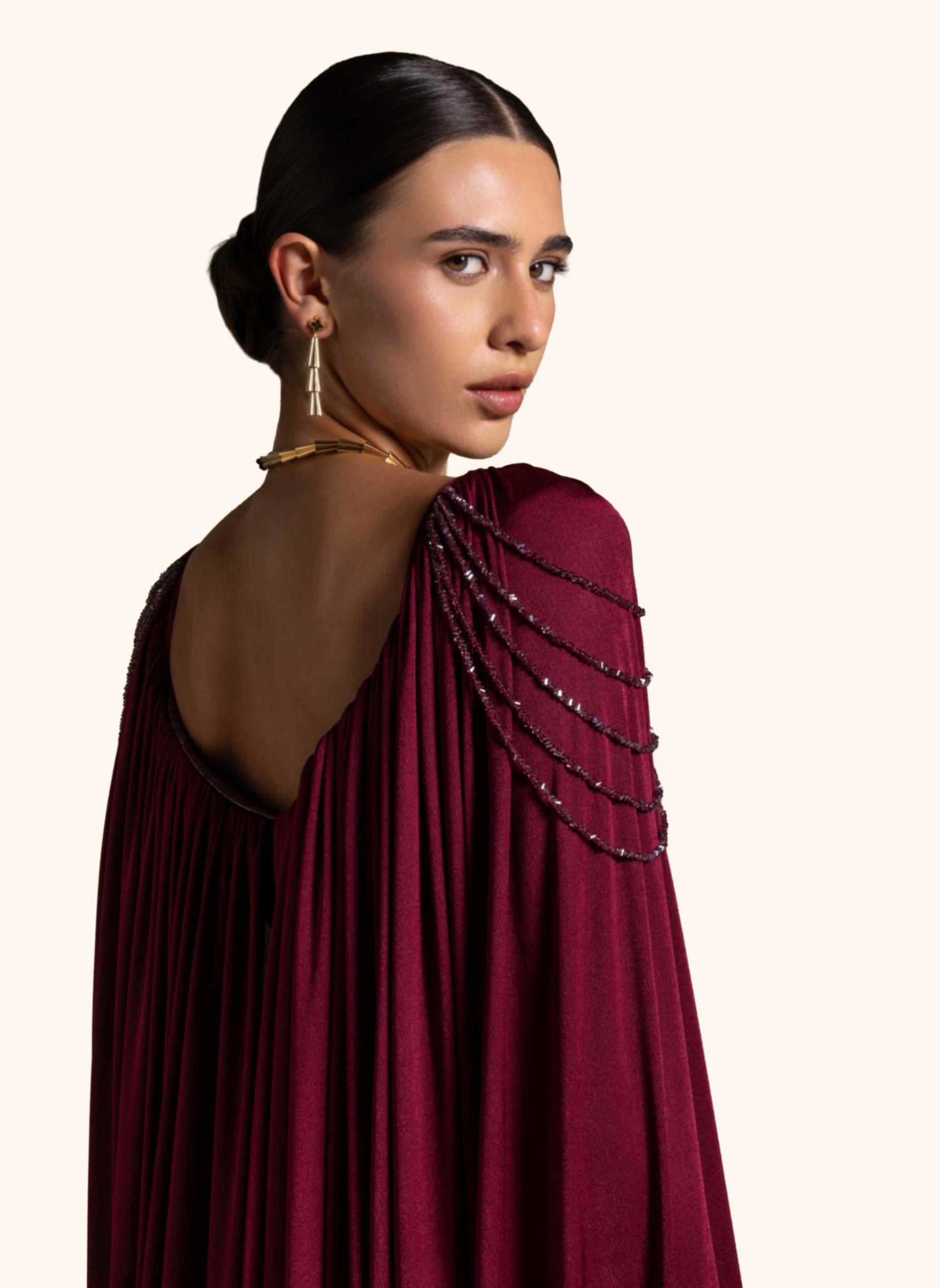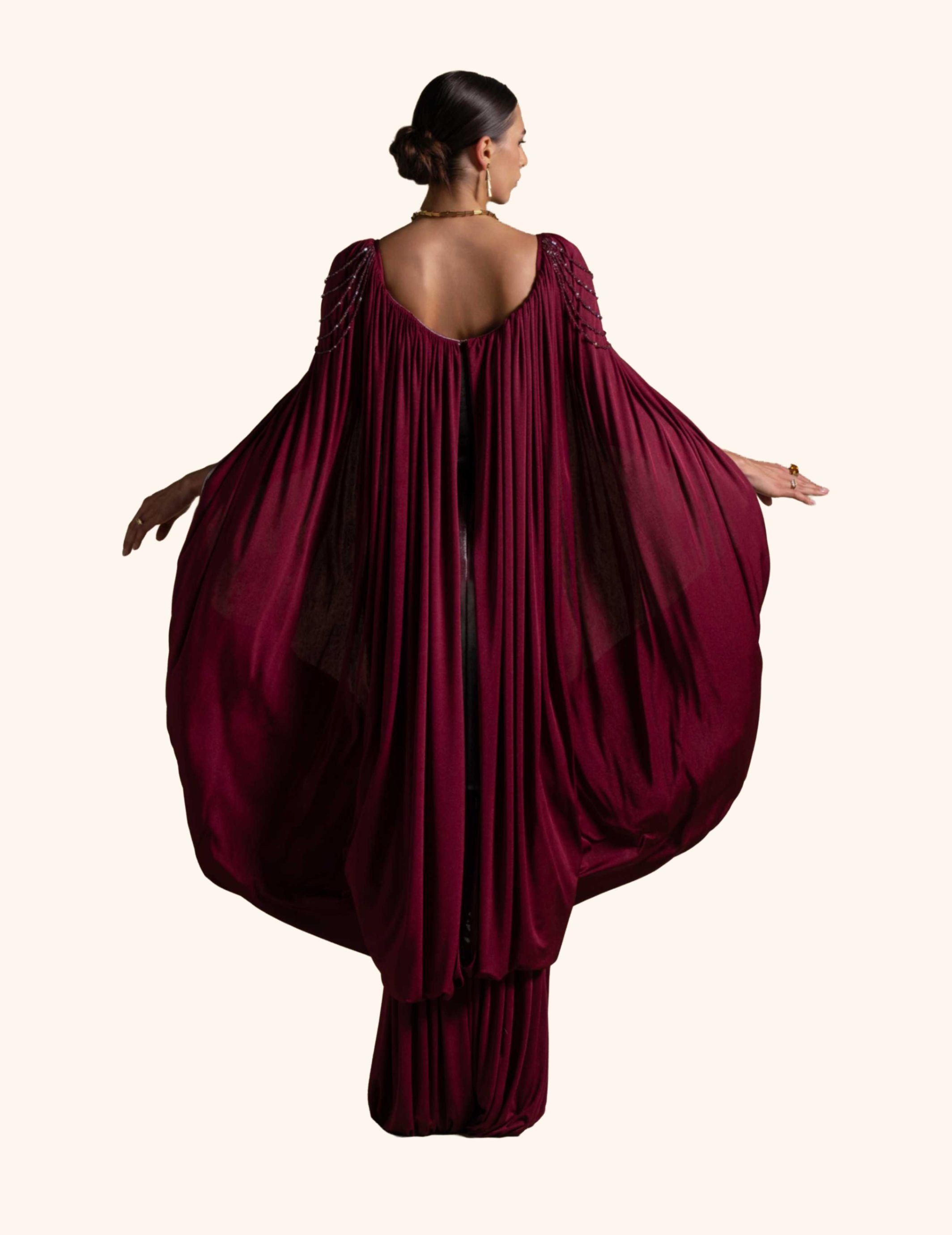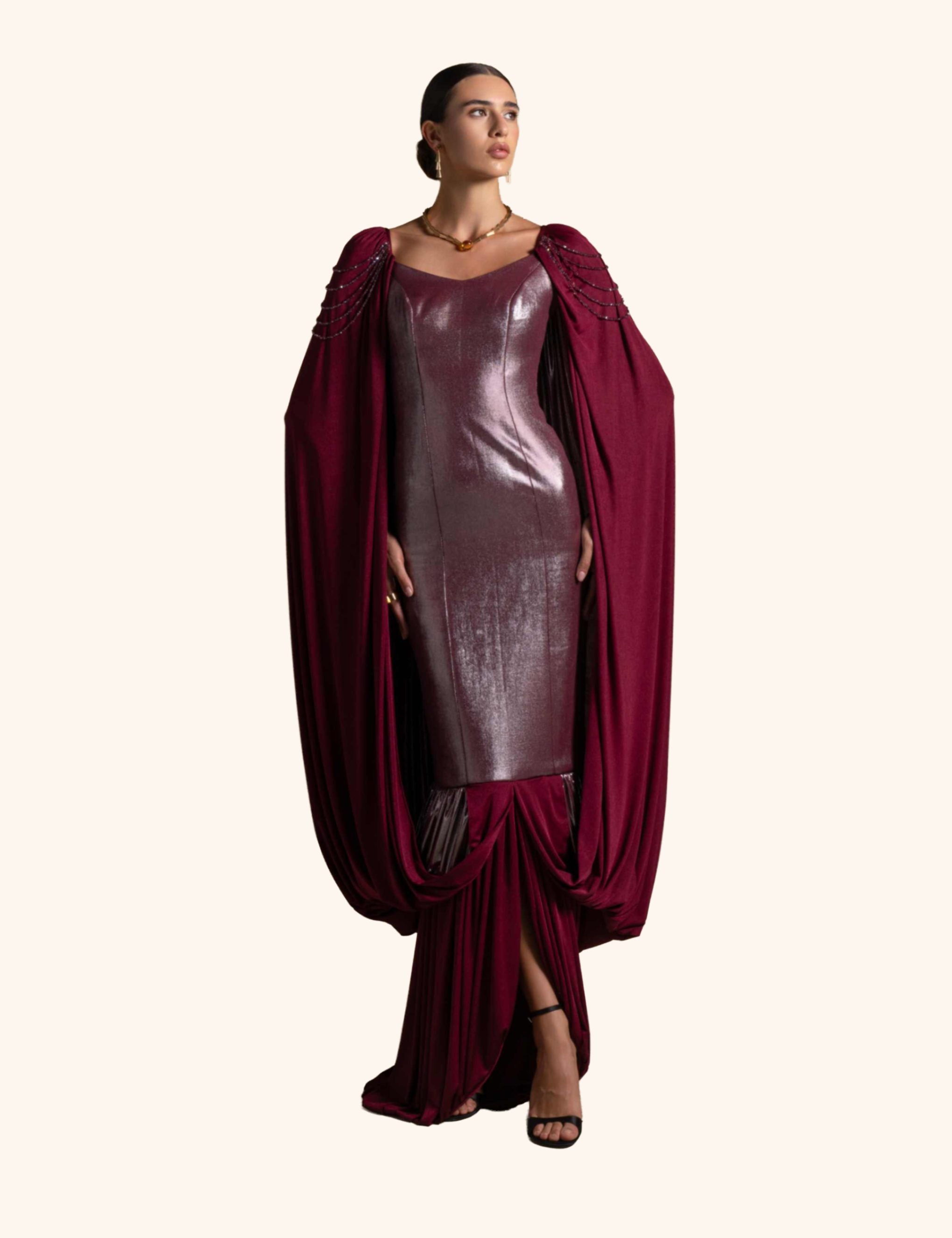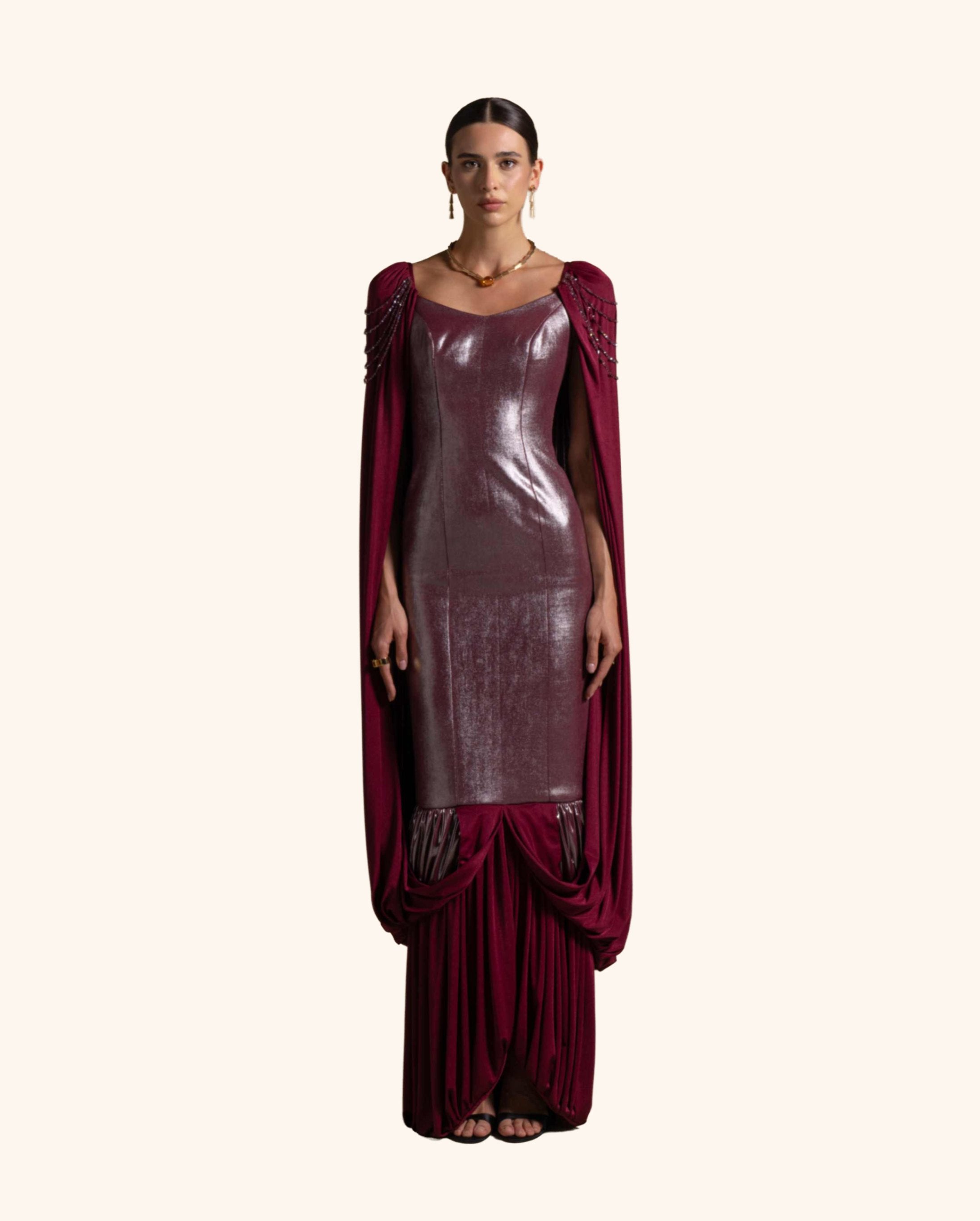 From the Zarina Collection, the Violante gown in deep Maroon showcases a sculpted metallic-finish bodice paired with draped jersey panels and beaded shoulder accents. Designed to command attention, it is perfect for high-fashion evenings, galas, and red-carpet statements.