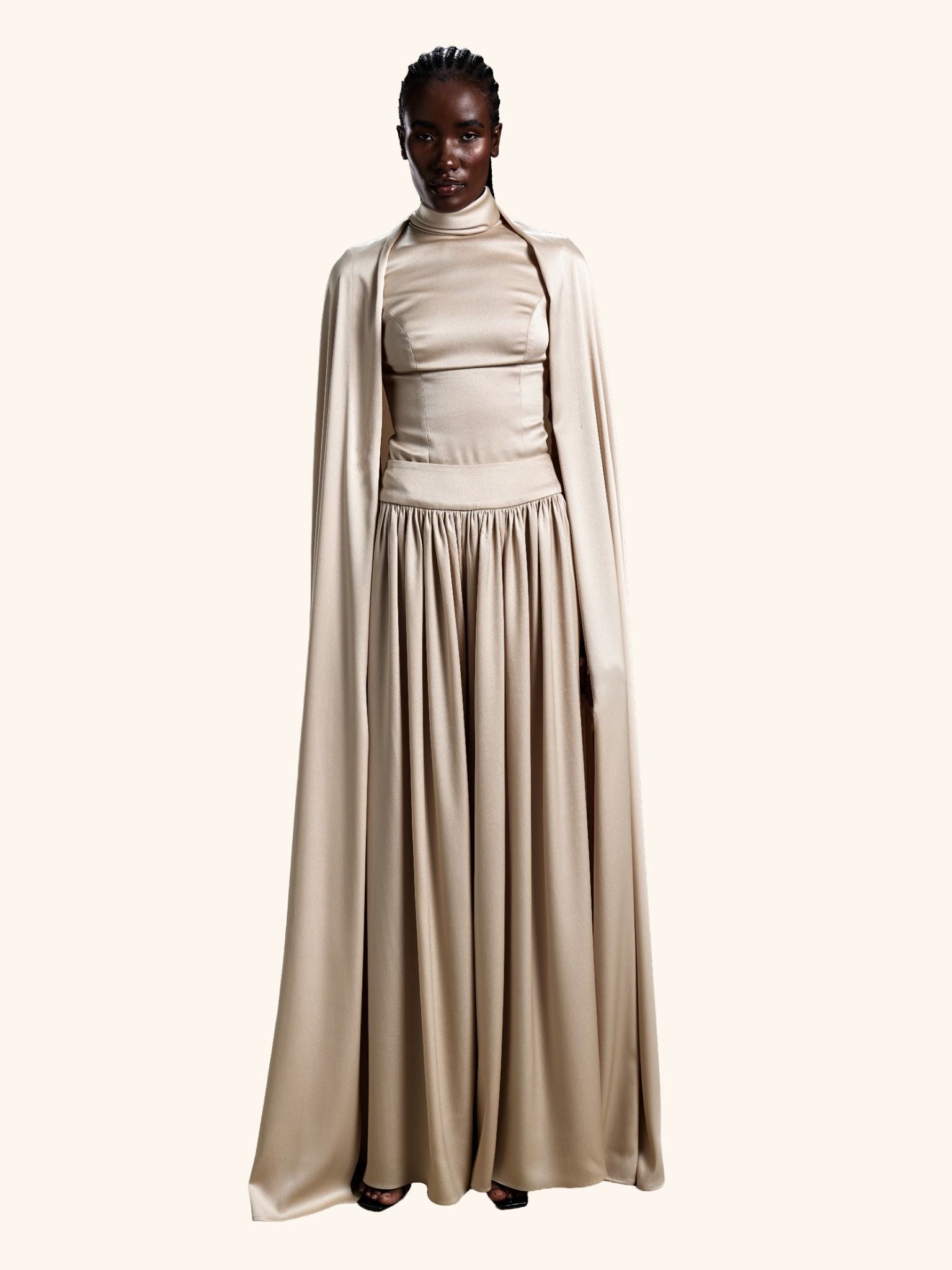 Pearl Dominion from our Midnight Mirage SS2026 collection. Tailored bodice, cape, wide-leg trousers. Crafted for red carpet / gala with power elegance.