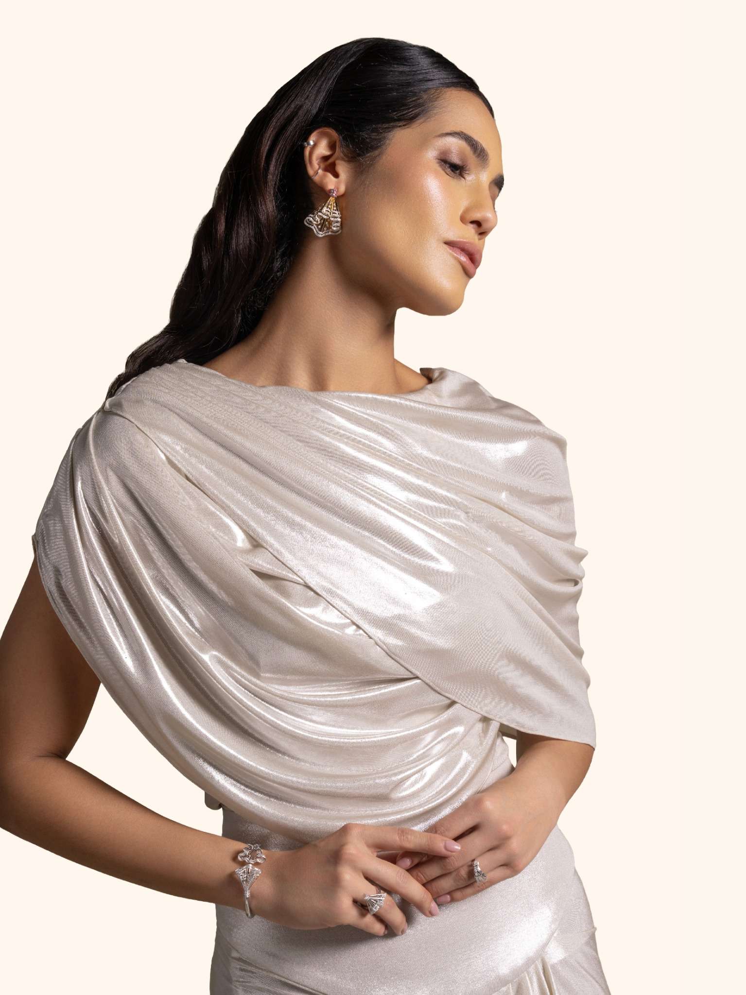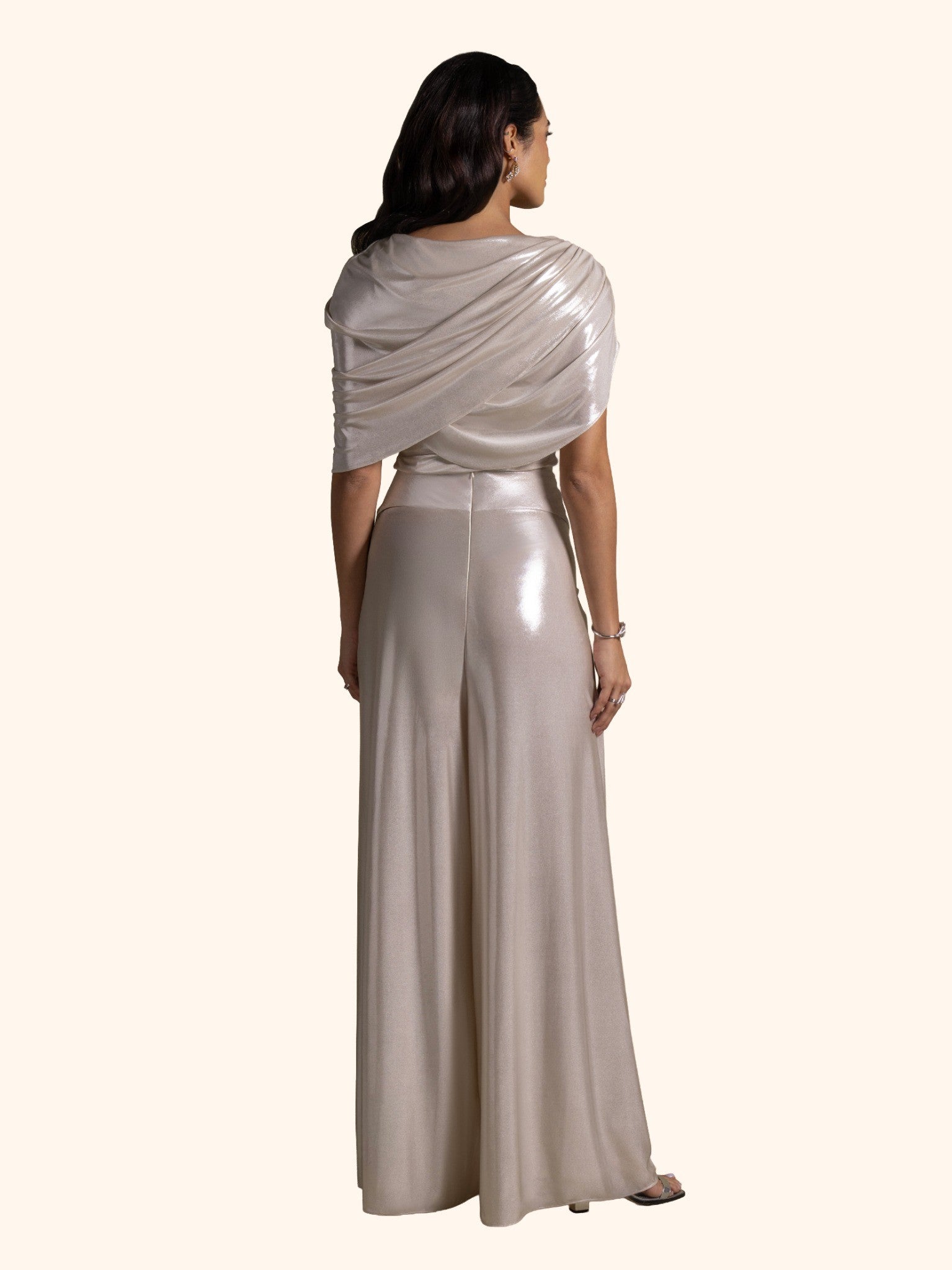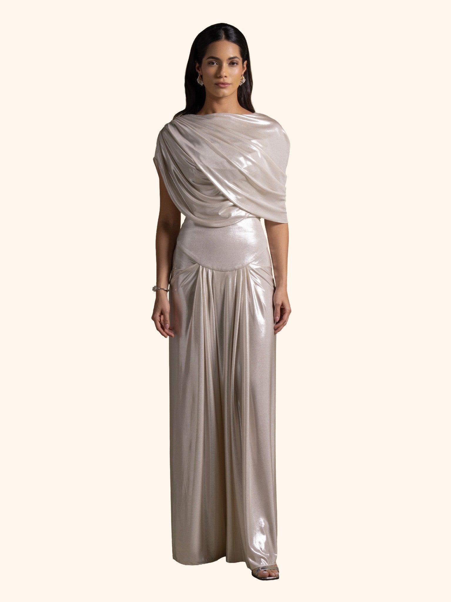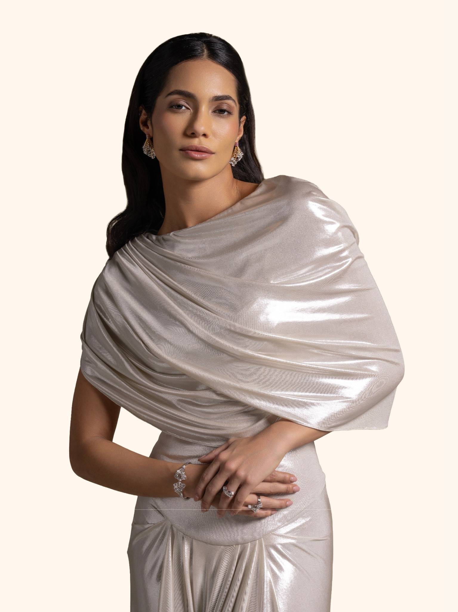 From the Zarina Collection, this striking silver gown is designed in fluid draped fabric that catches the light with every movement. Its asymmetric draping and sleek silhouette exude contemporary elegance. Perfect for glamorous evening events, high-profile galas, or red-carpet moments.