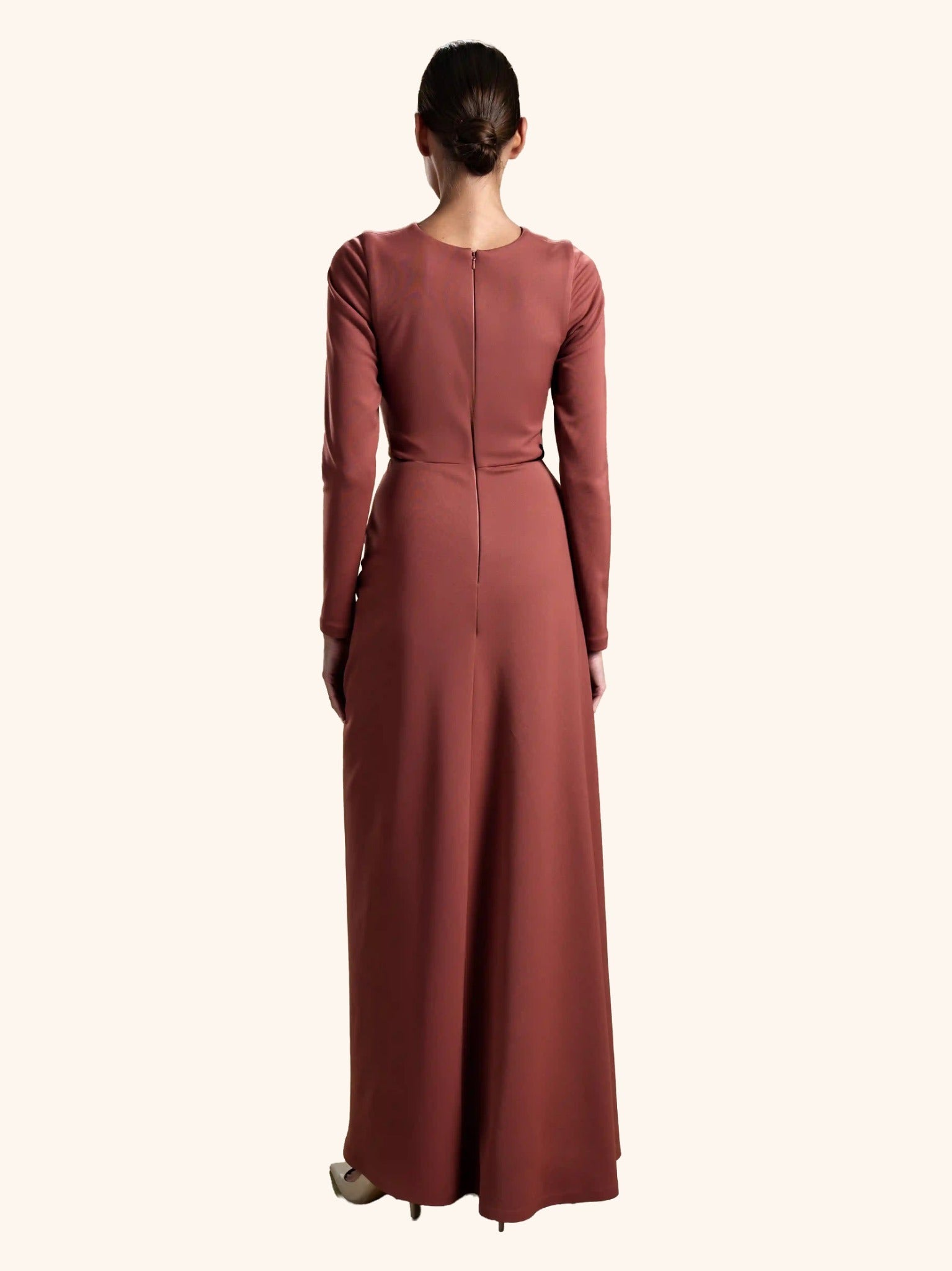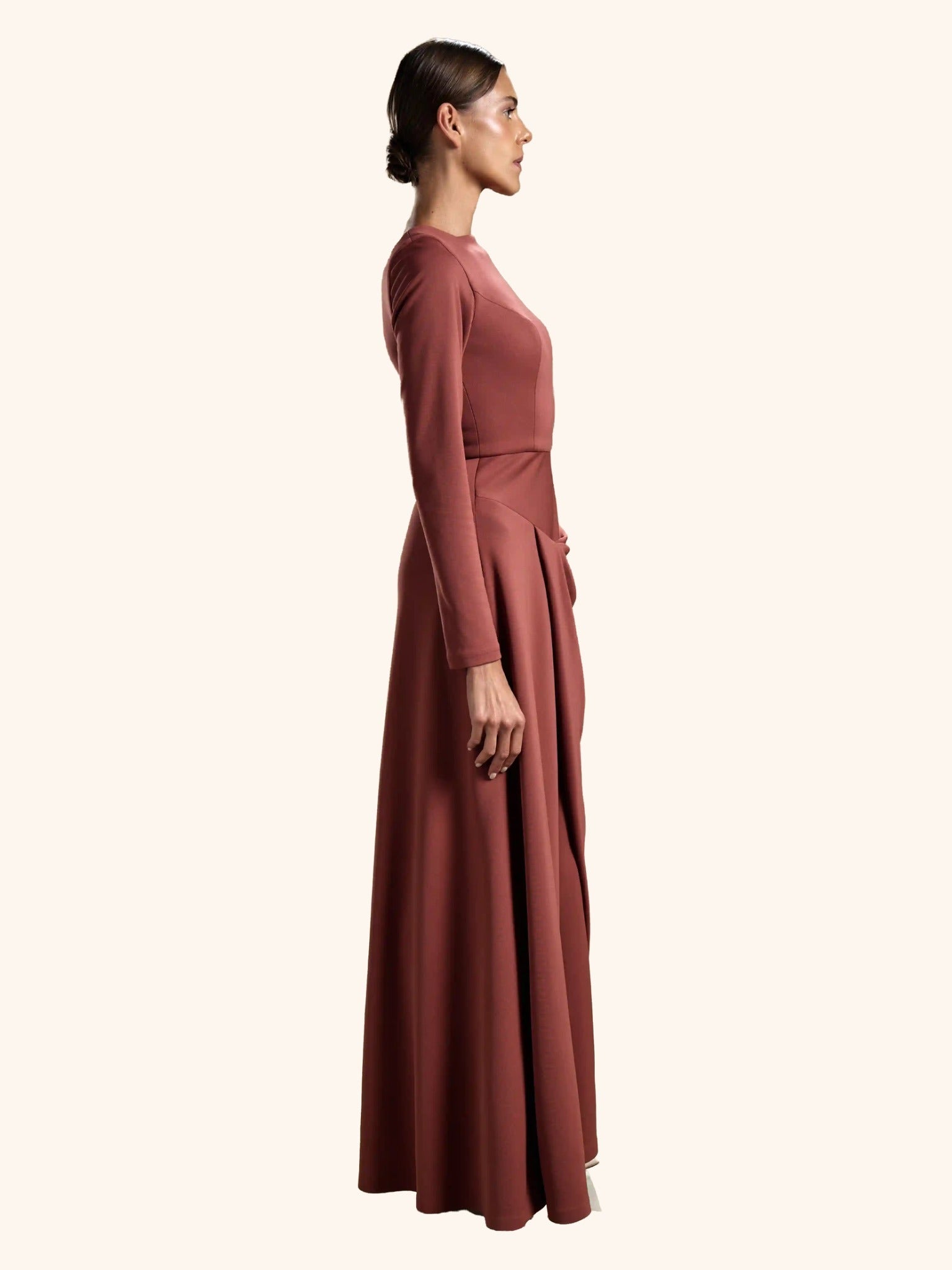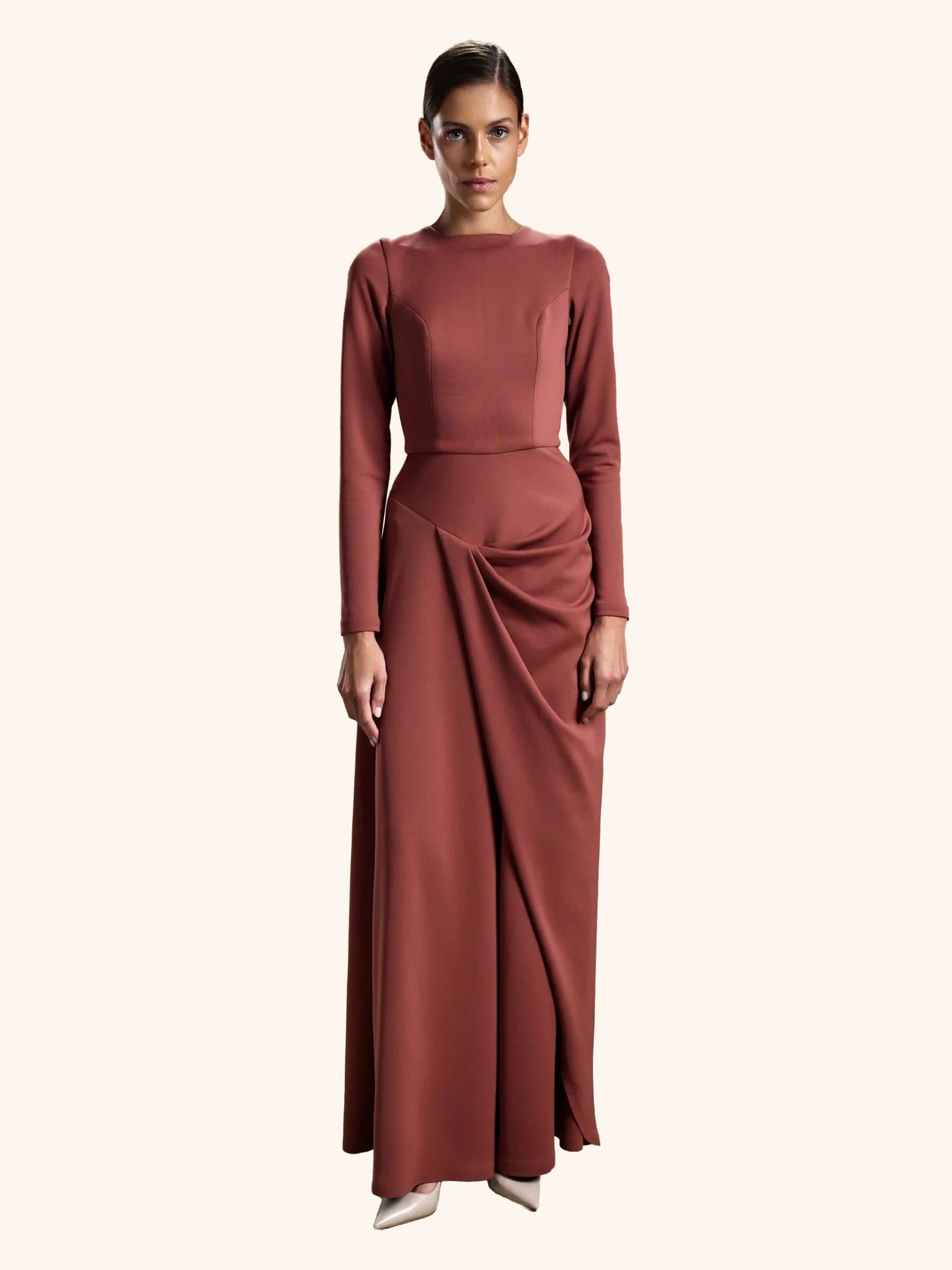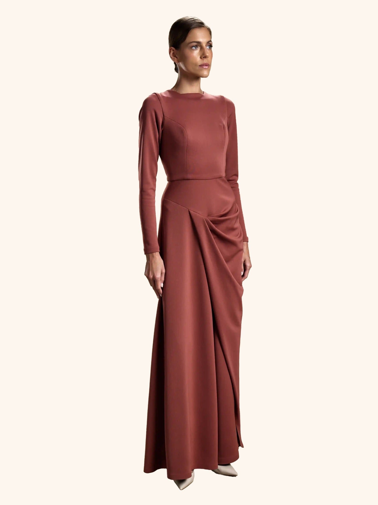 Auburn Drape from our Midnight Mirage SS2026 collection. Long fitted sleeves, round neck, draped front over skirt. Crafted for formal / evening with understated elegance.