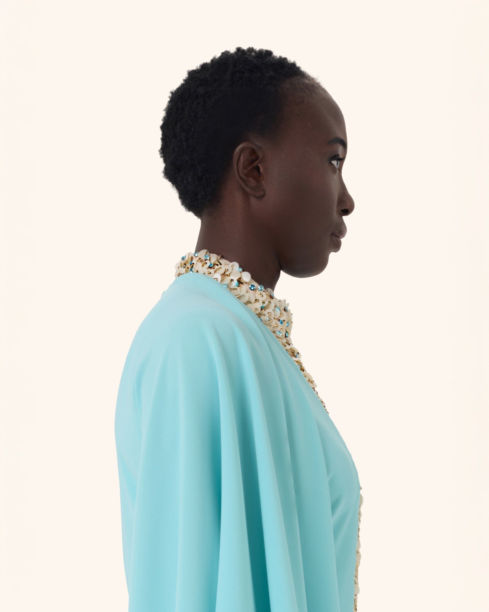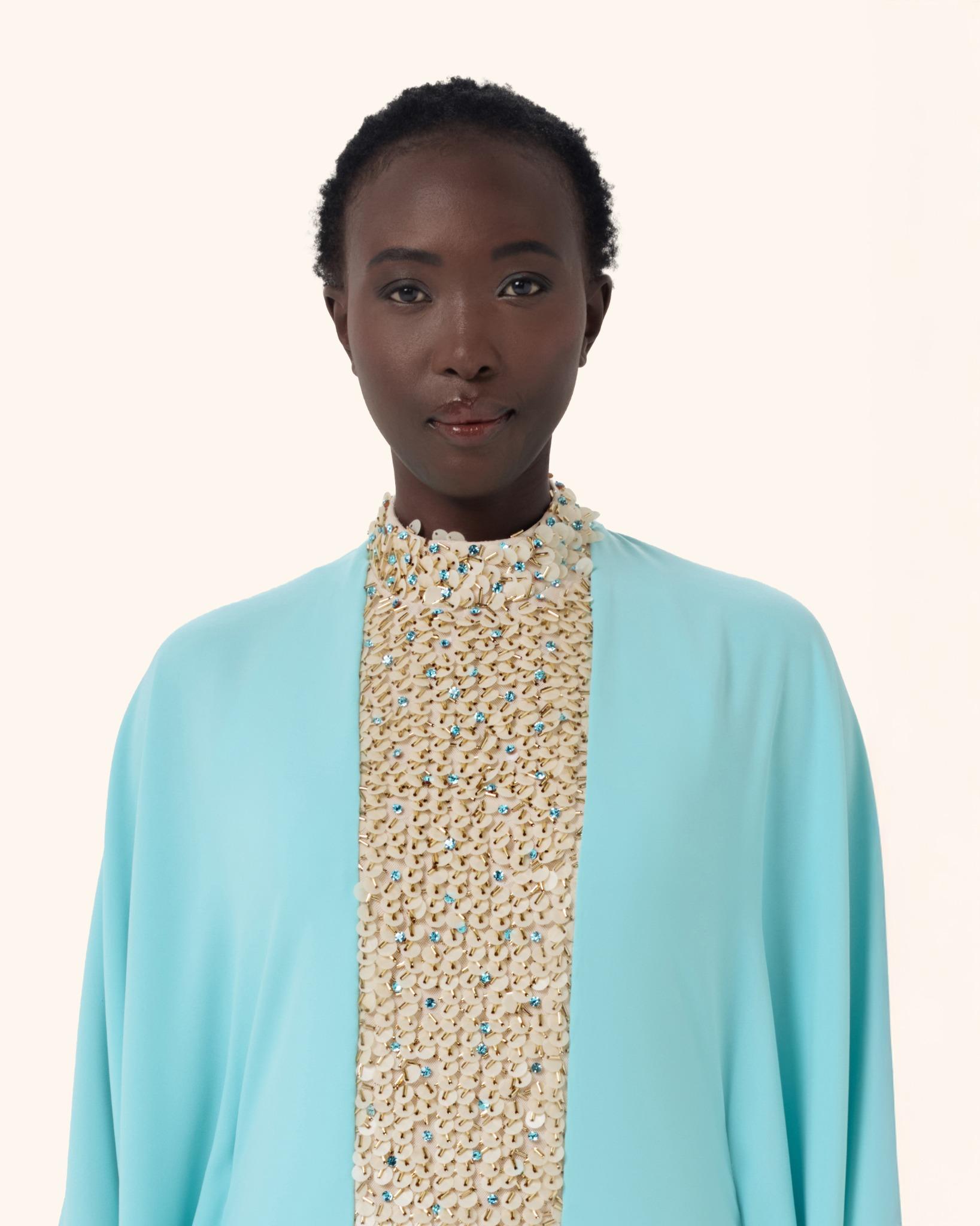 A flowing aqua-toned gown designed with a dramatic cape silhouette and a striking crystal-embellished front panel. Crafted to move beautifully with every step, this piece blends modern elegance with timeless glamour, making it ideal for evening occasions, formal events, and luxury celebrations.