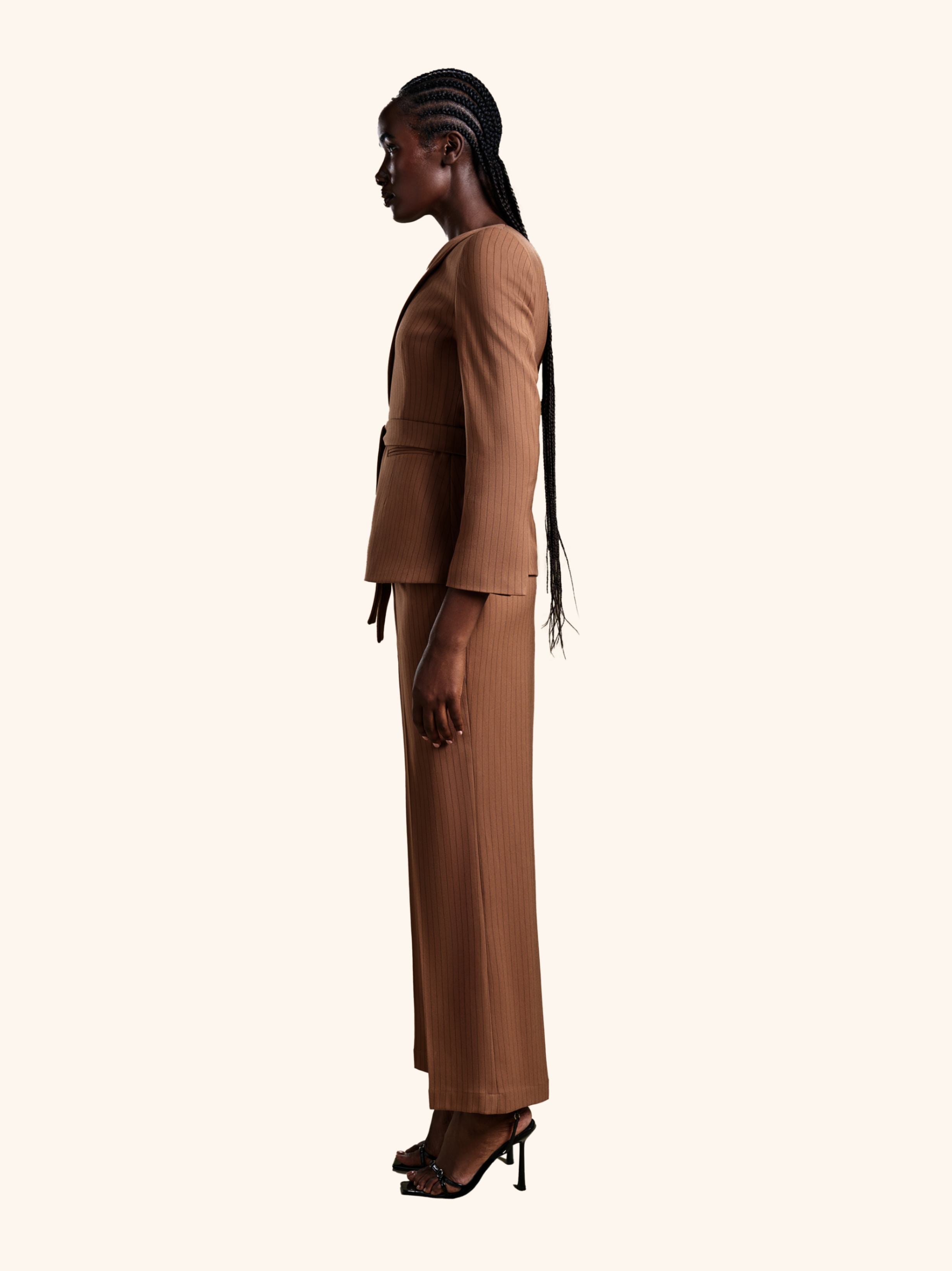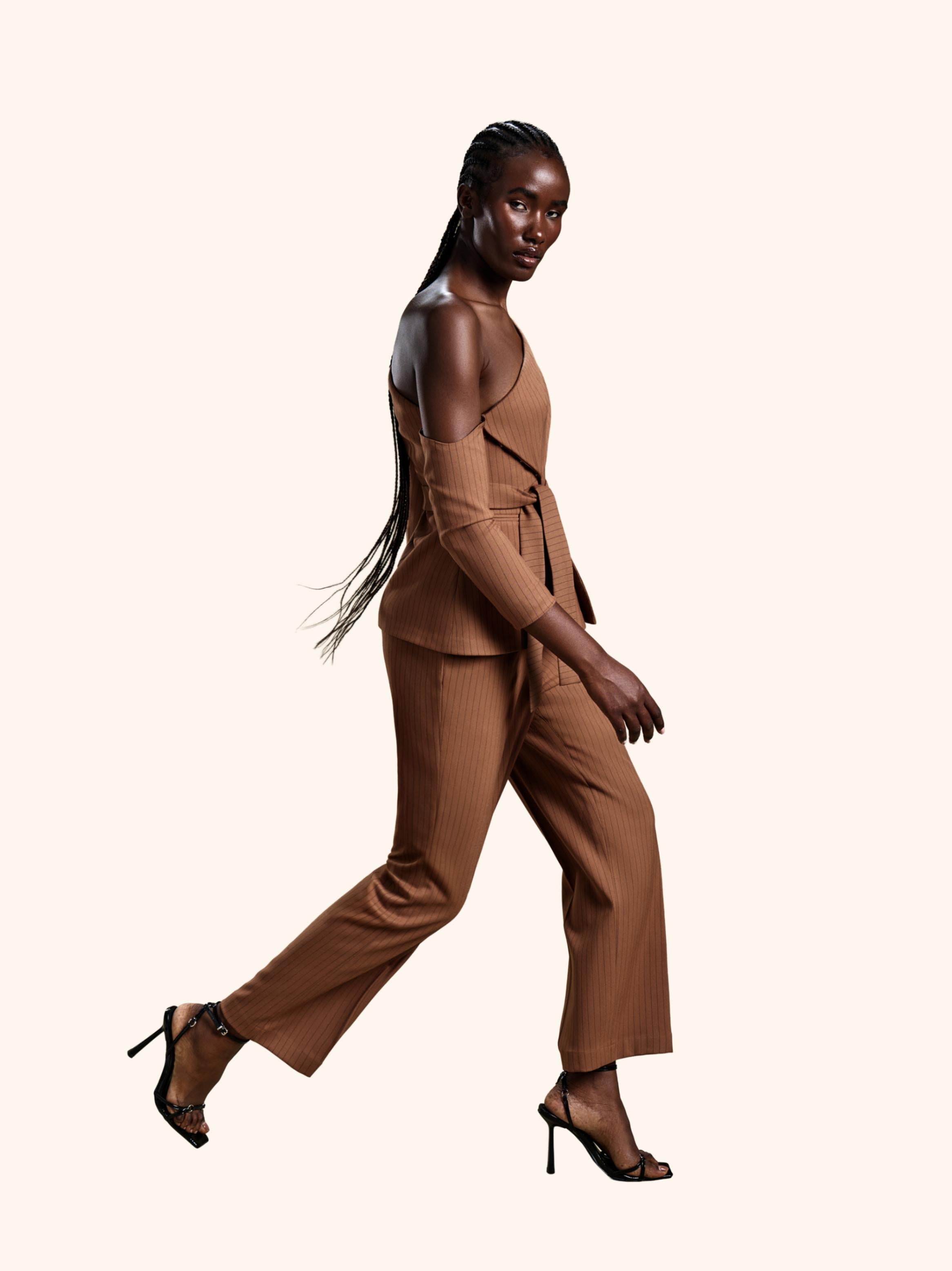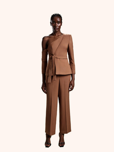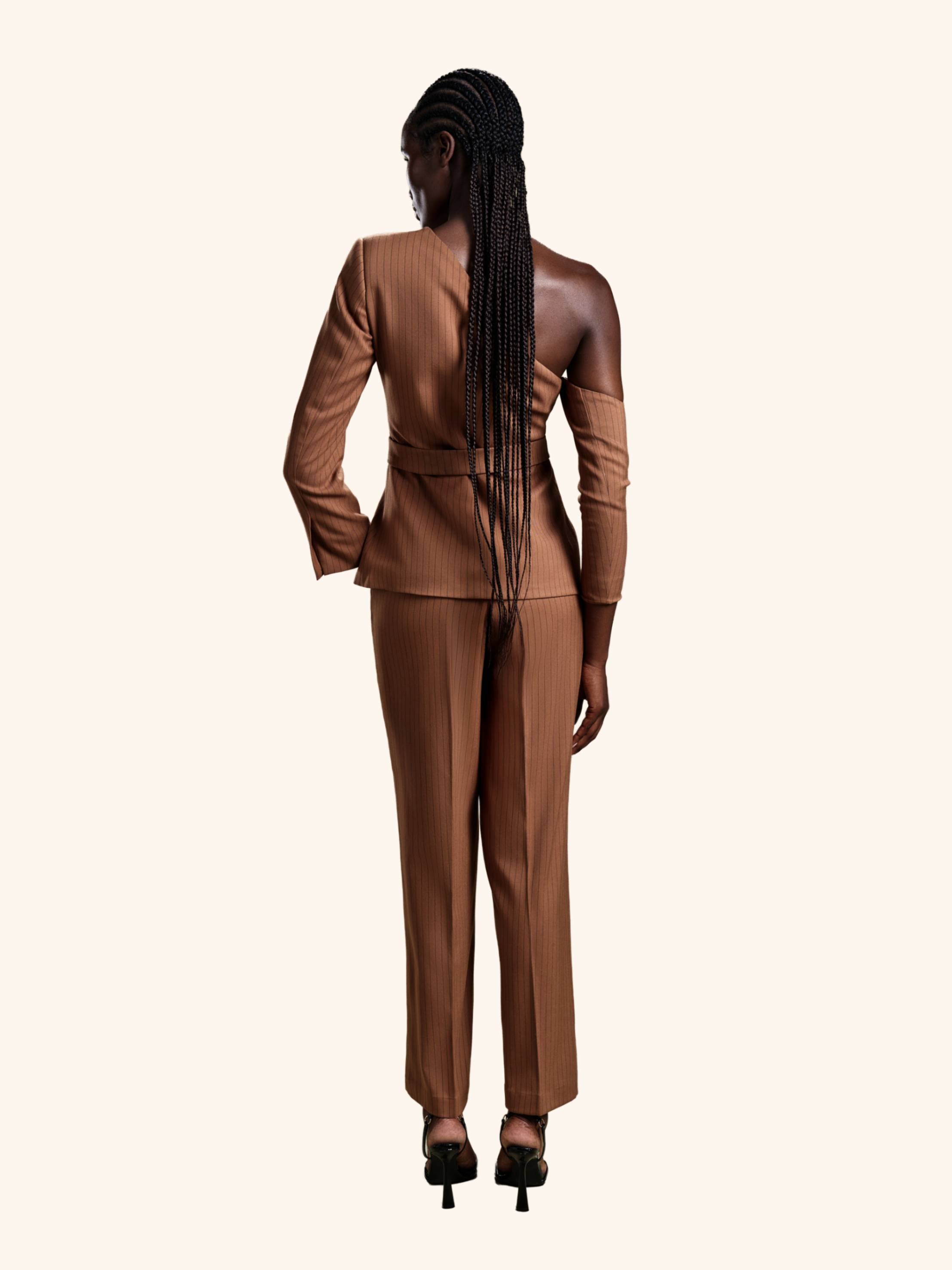 Cocoa Command from our Midnight Mirage SS2026 collection. Asymmetrical wrap top, cut-out sleeves, wide-leg trousers. Crafted for executive / evening with contemporary chic.