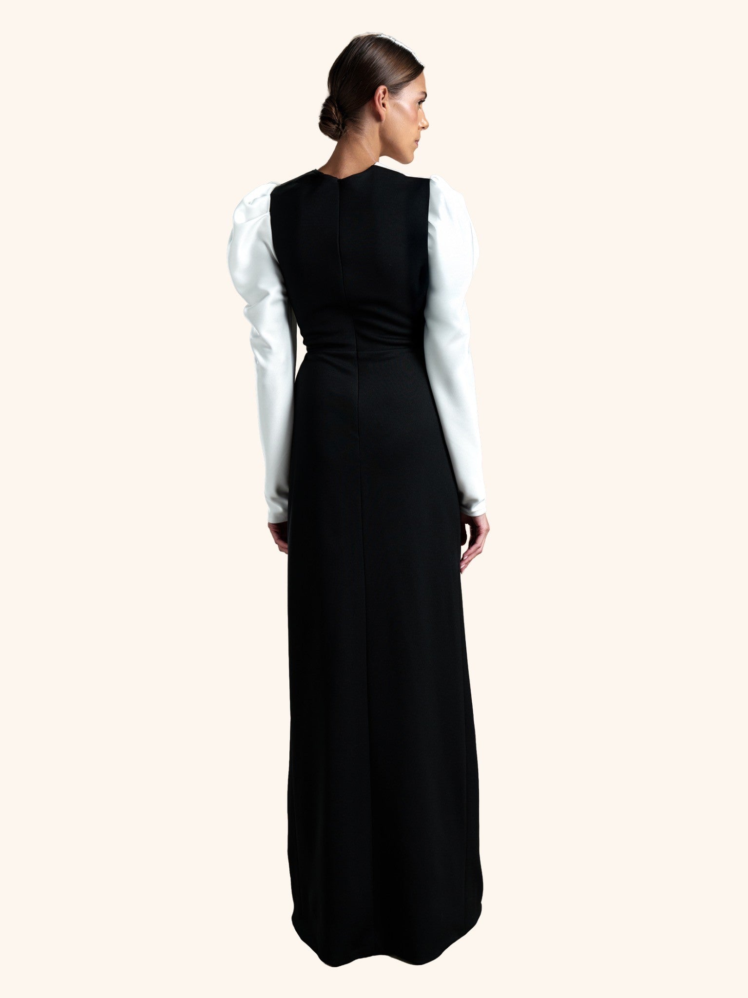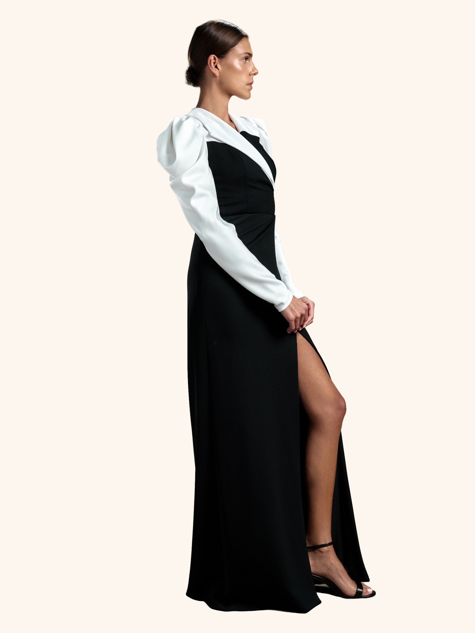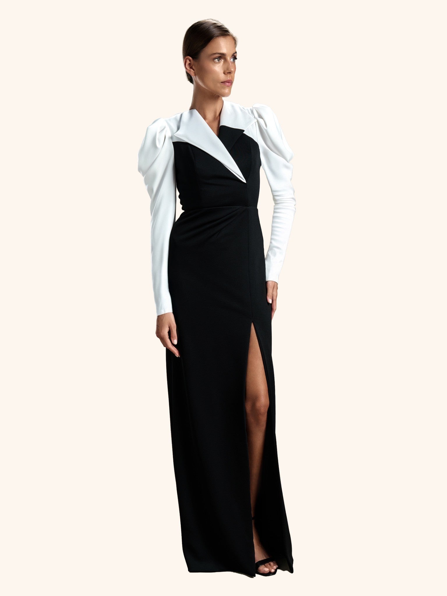 Eclipse Regal from our Midnight Mirage SS2026 collection. Asymmetrical high collar, voluminous puffed shoulders, fitted silhouette with high side slit. Crafted for formal / evening with commanding minimalism.