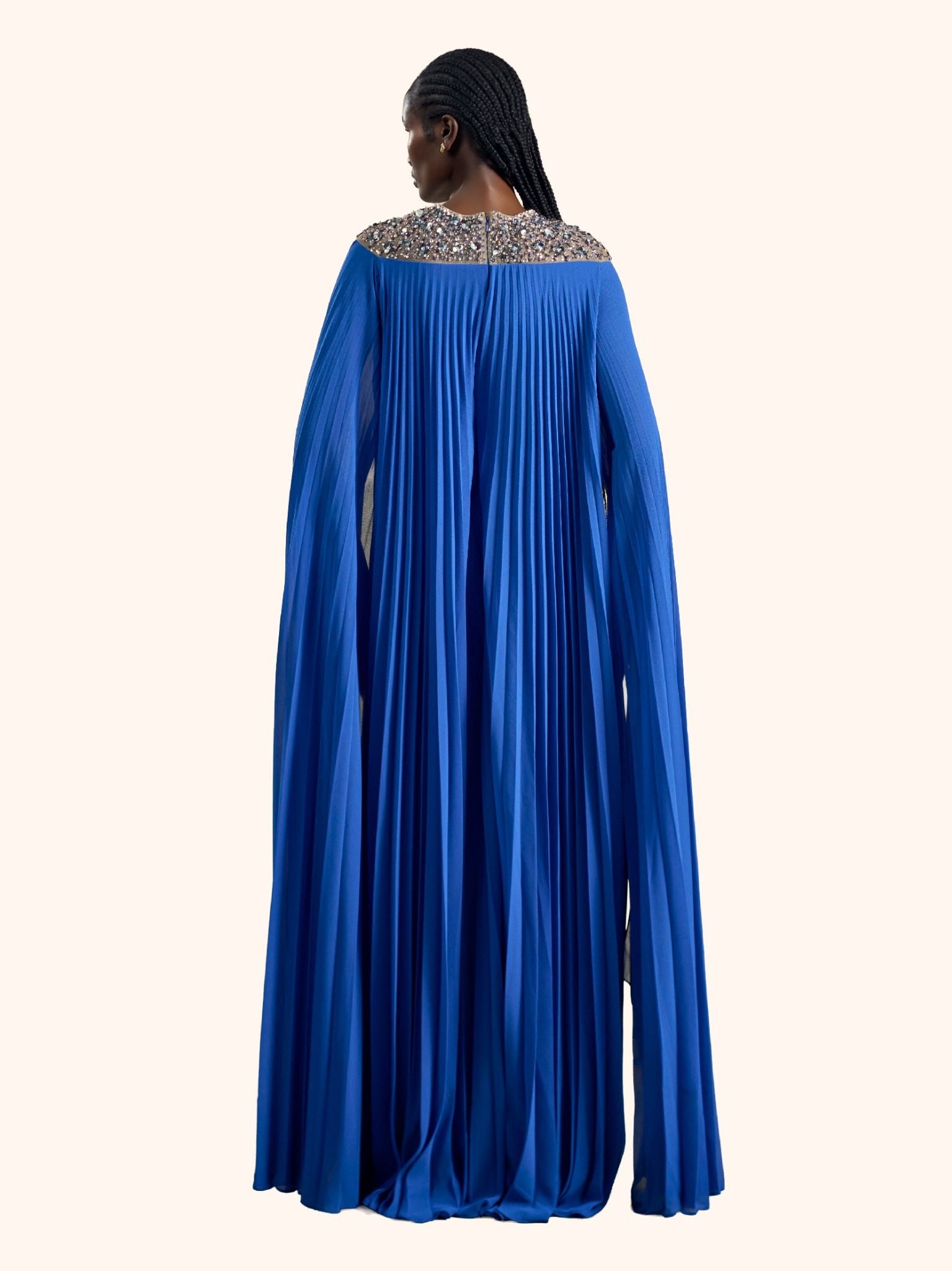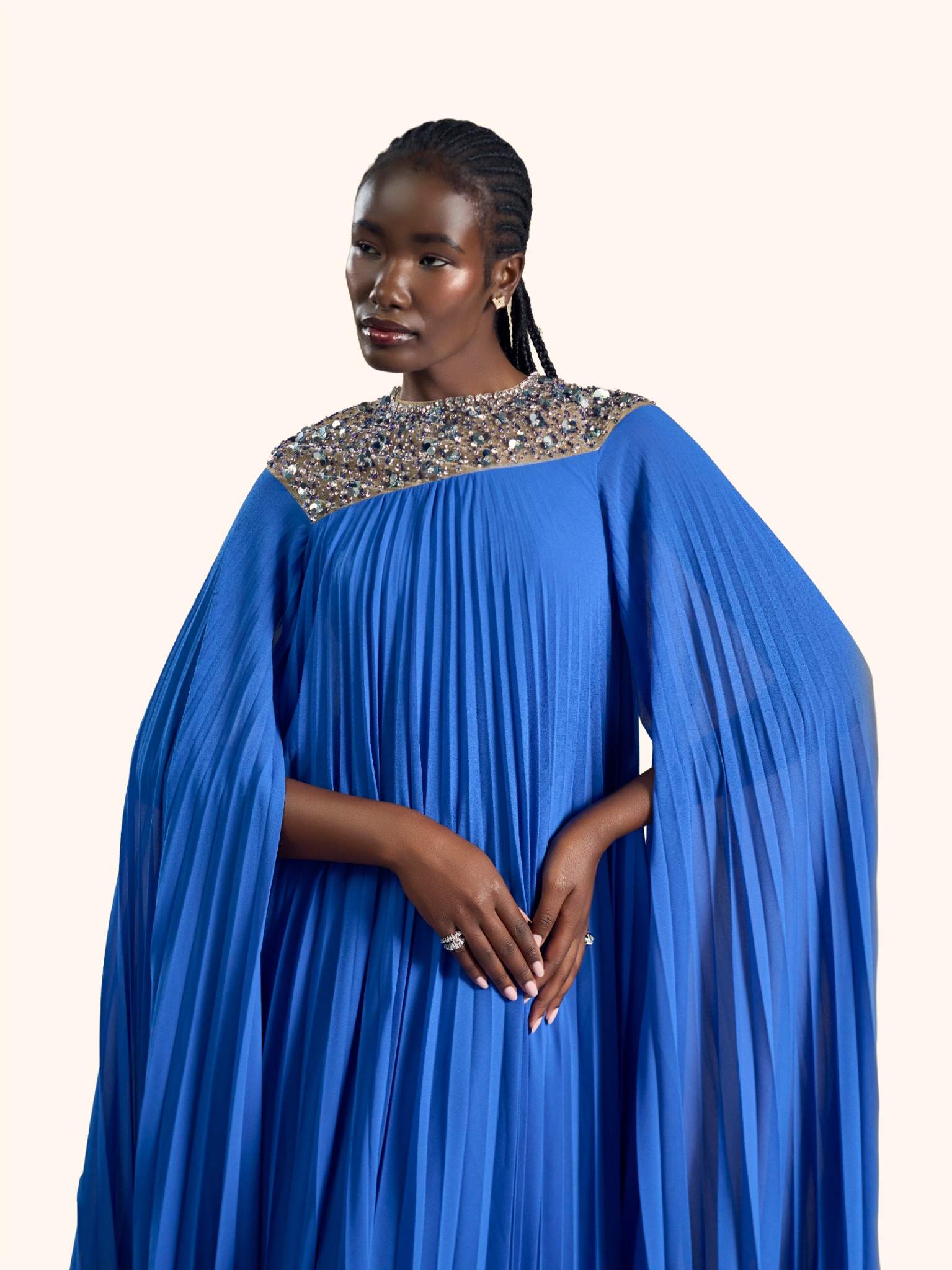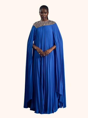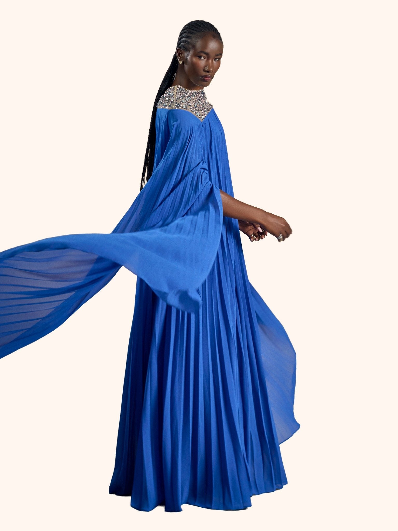 From the Zarina Collection, this royal blue gown is defined by its flowing pleats and dramatic cape-like silhouette. The embellished neckline addsa statement touch, while the voluminous drape makes it perfect for grand soirées, gala nights, and formal evening receptions.