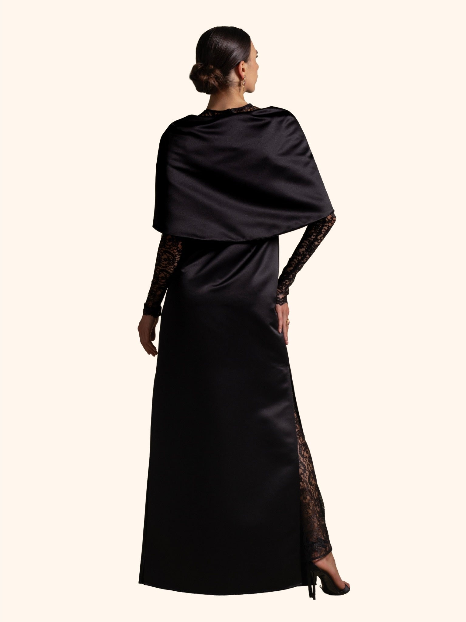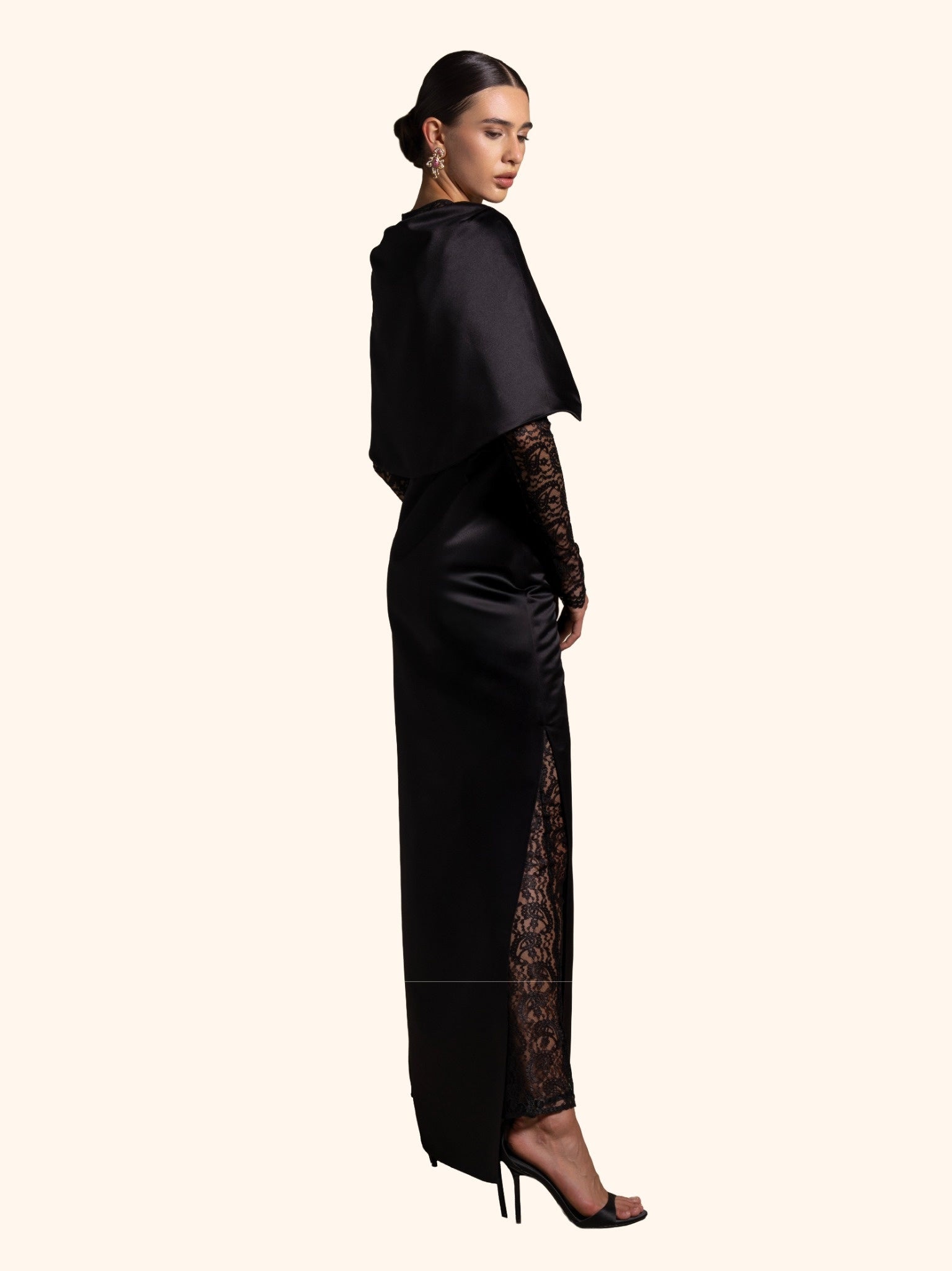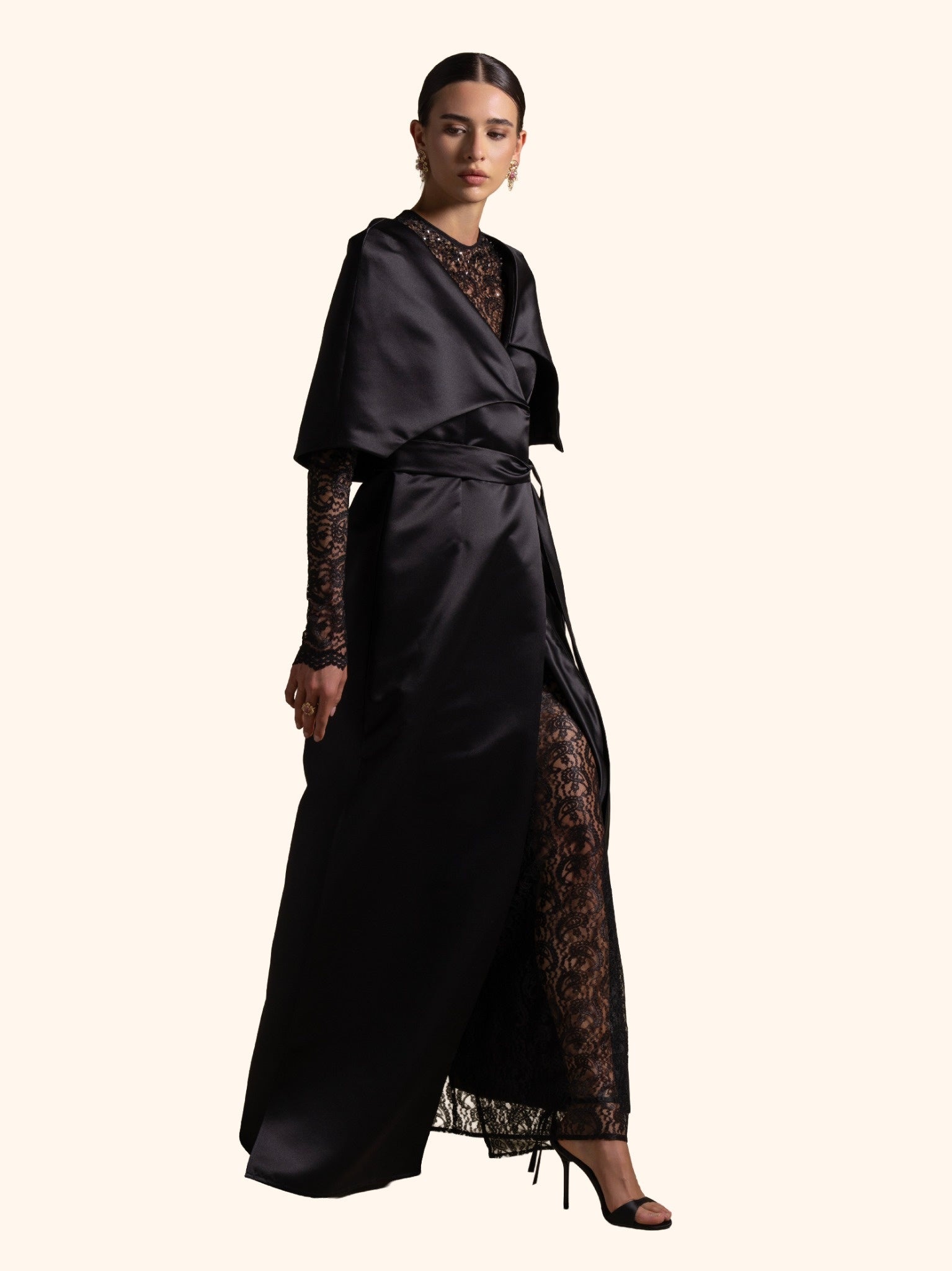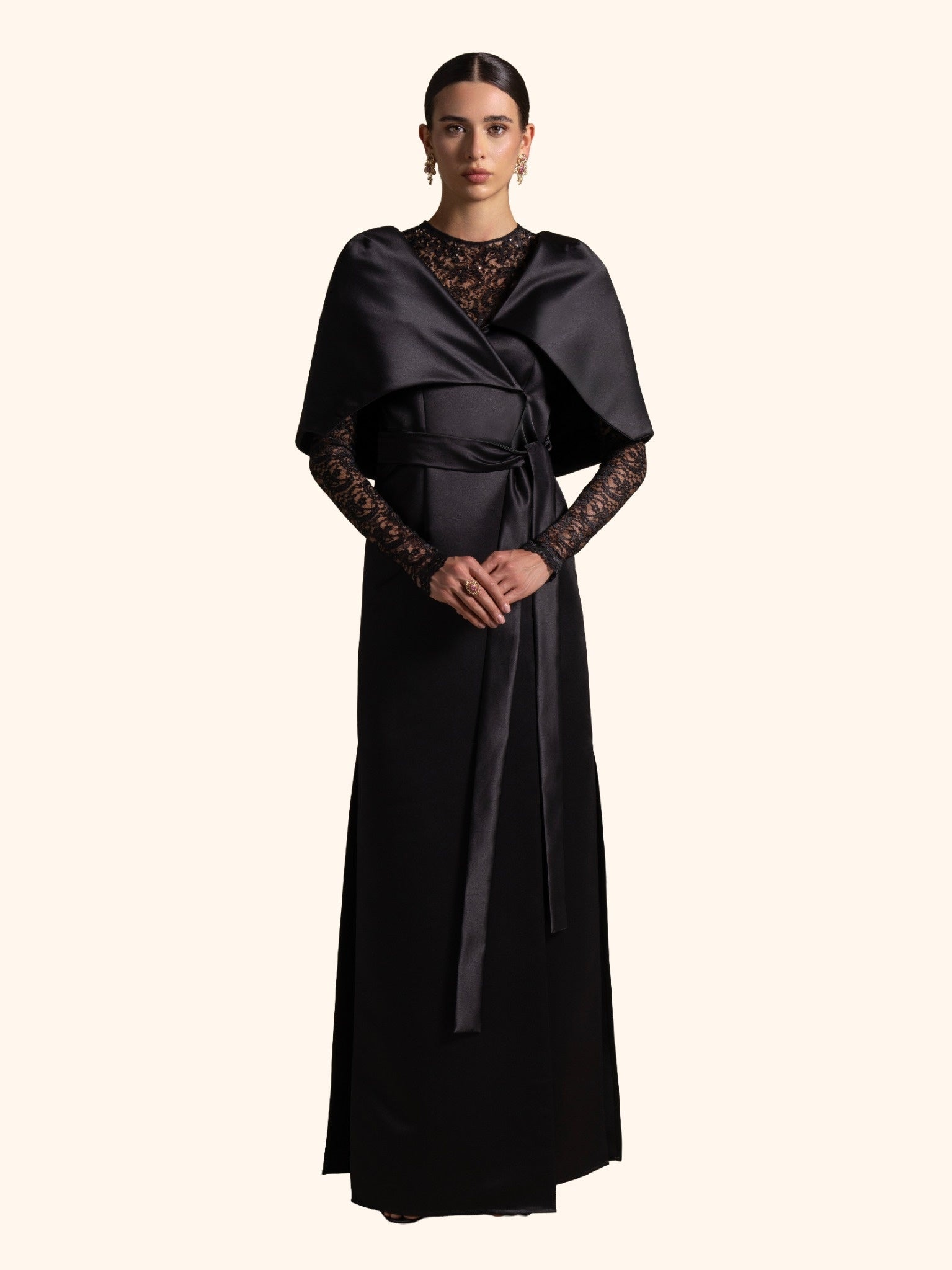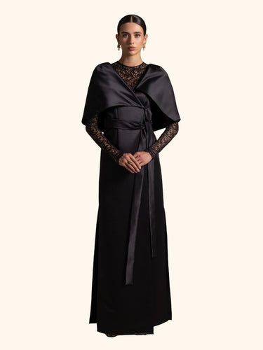 From the Zarina Collection, this Black gown pairs a sleek satin wrap silhouette with a delicate French lace inner, blending structure with sensual elegance. Finished with a waist tie and cape-style overlay, it is perfect for gala dinners, formal evenings, and timeless black-tie occasions