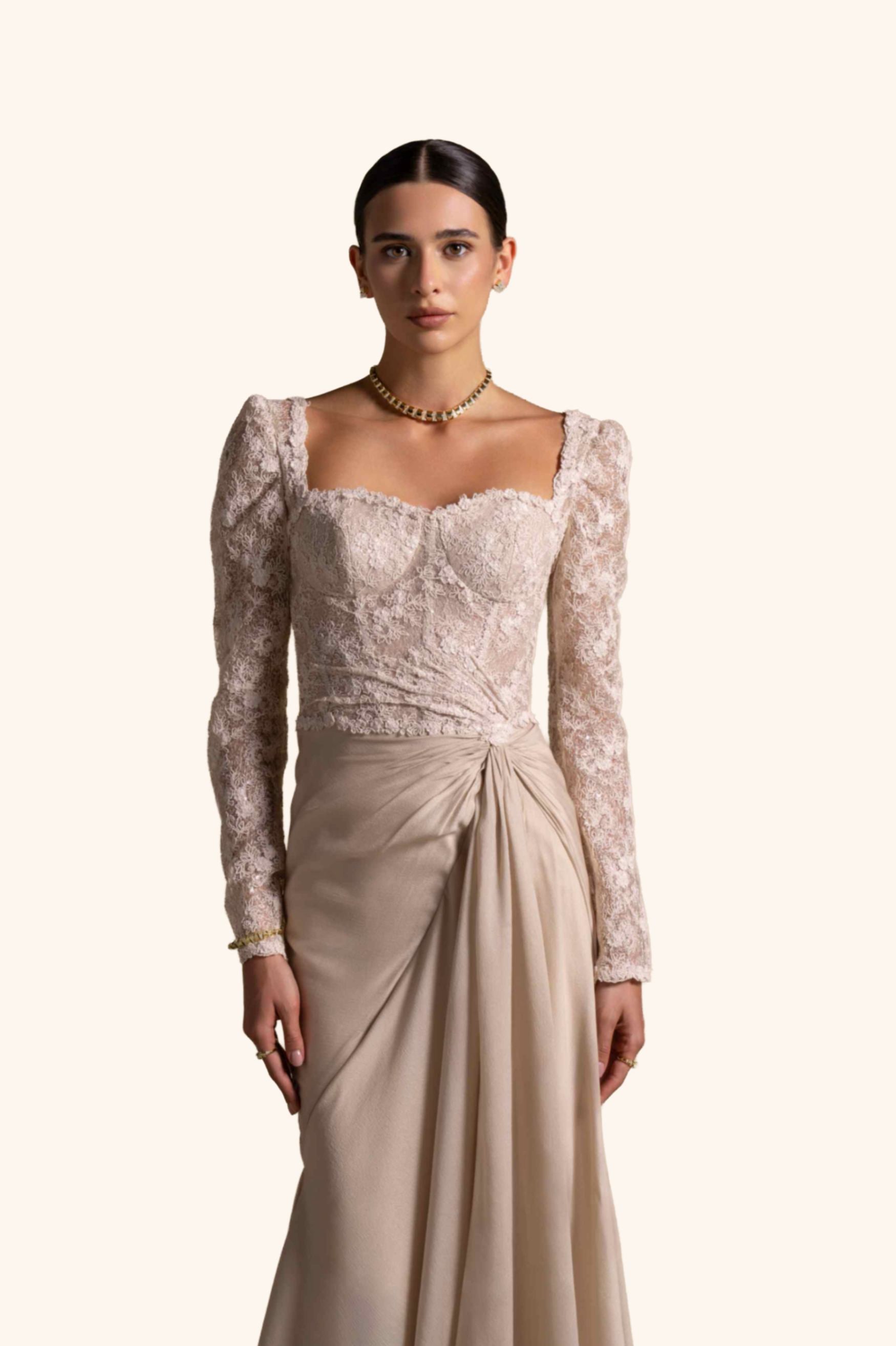 From the Zarina Collection, this couture gown in soft Beige features a fitted lace bodice with long sleeves and a delicately draped chiffon skirt. Romantic and refined, it is perfect for weddings, luxury soirées, and timeless celebrations.