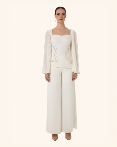 An ivory co-ord set inspired by the spider lily, featuring sculpted contours, delicate beaded detailing, and softly pleated sleeves paired with wide-leg trousers.