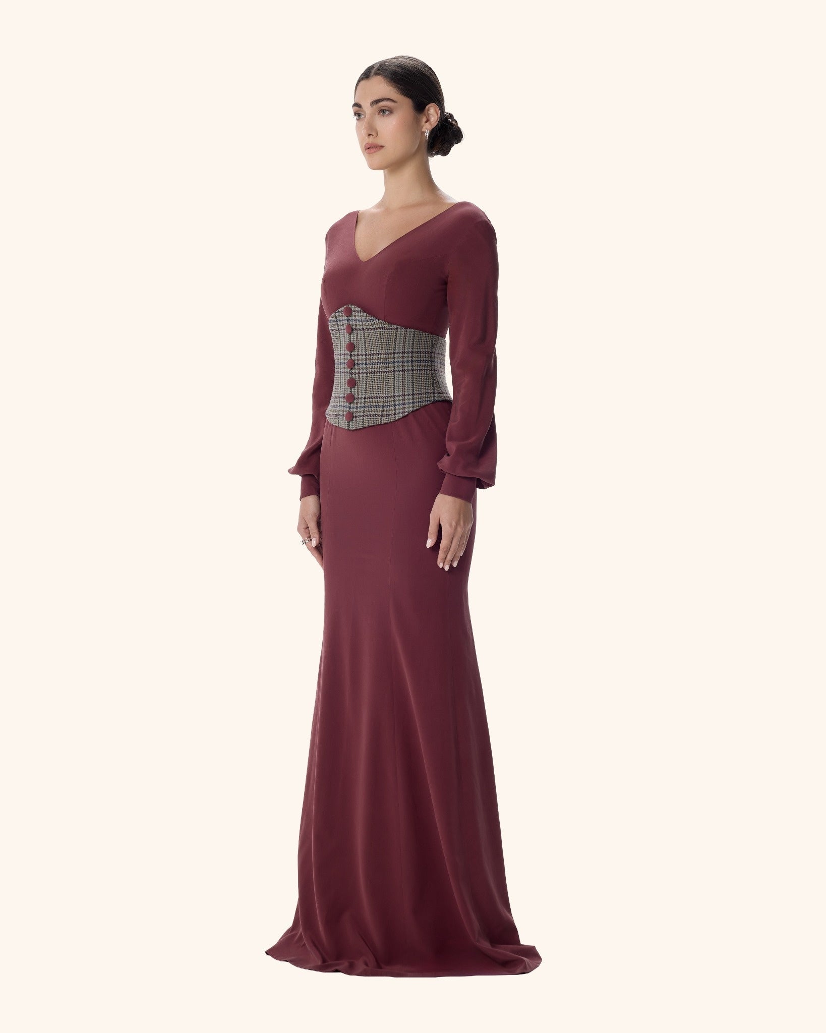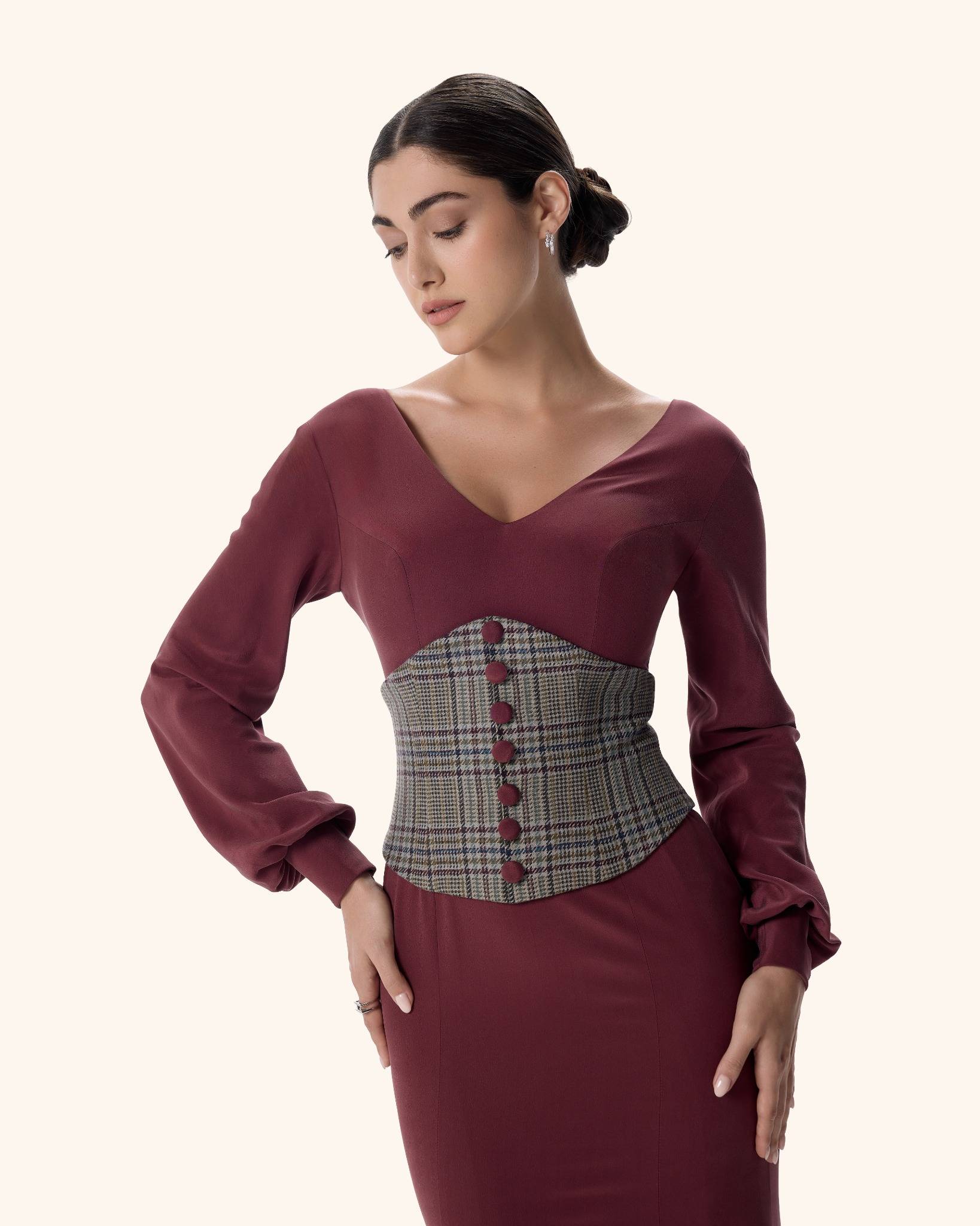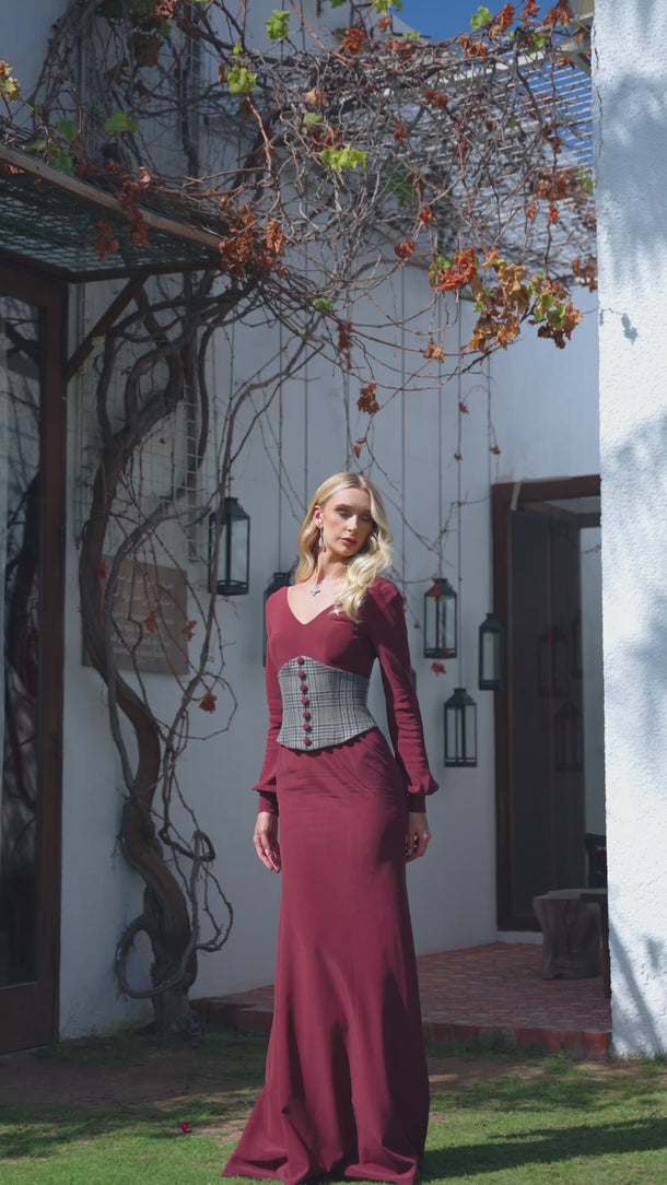 A powerful column gown in deep burgundy stretch crepe, sculpted with a structured houndstooth corset and refined V-neckline. With flared cuffs and a commanding silhouette, she moves like moonlight — quiet, magnetic, and impossible to ignore.