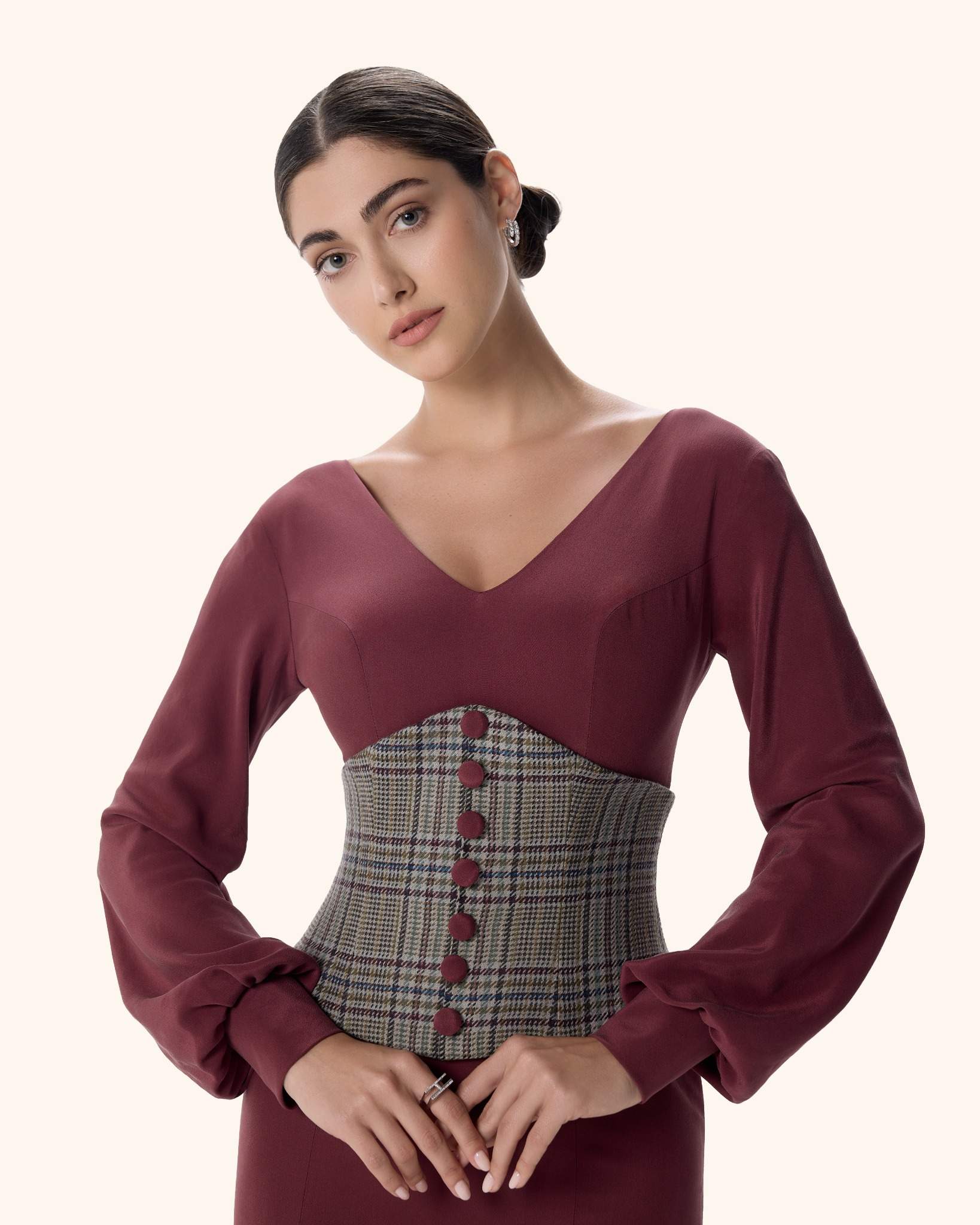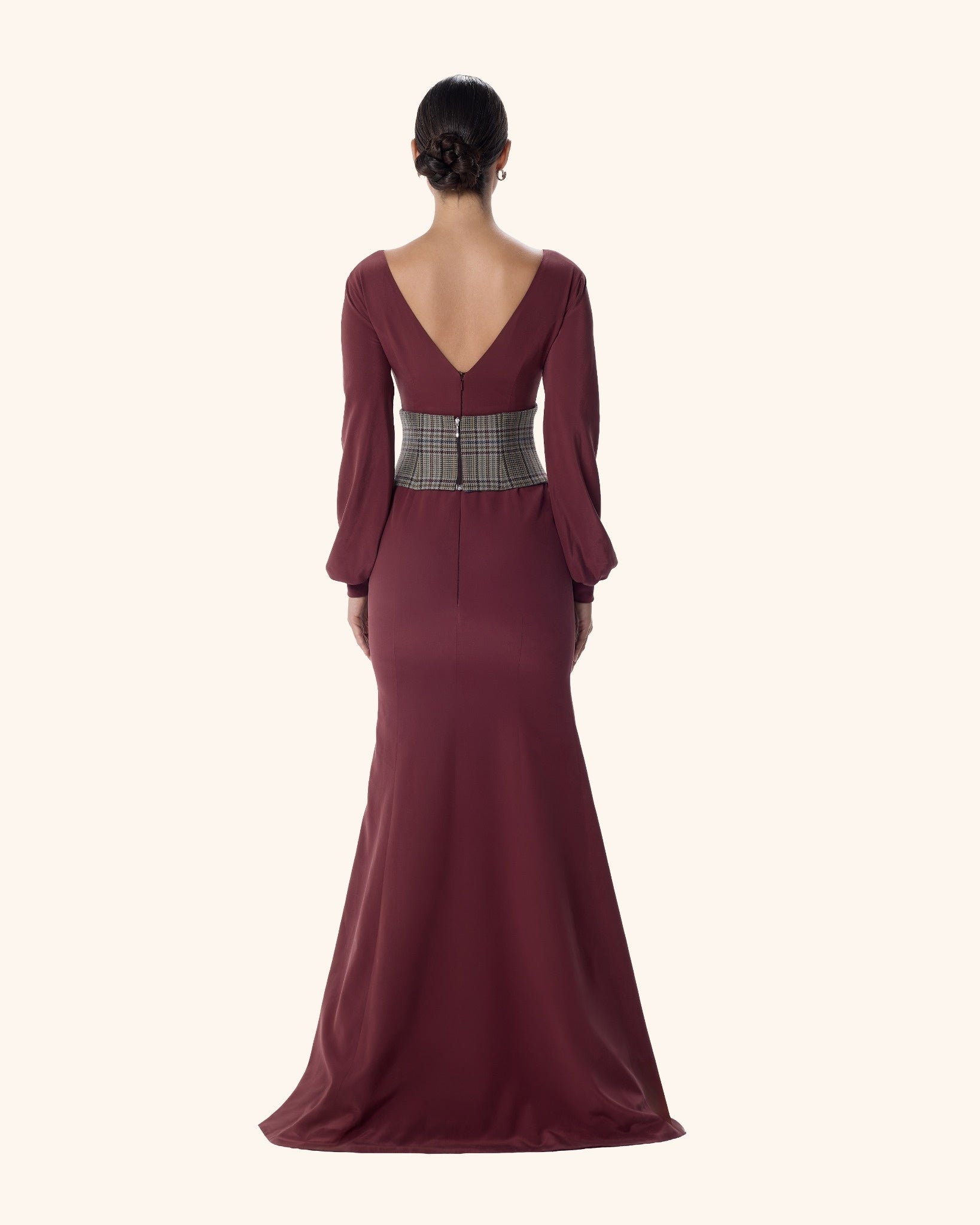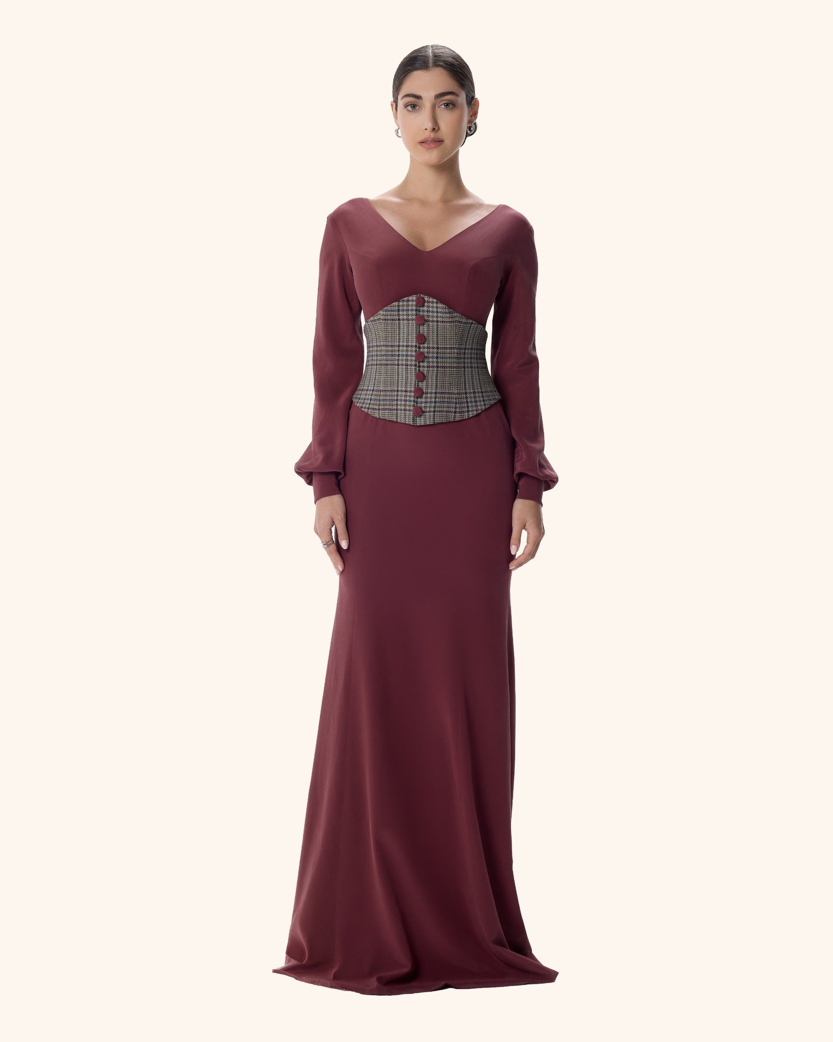 A powerful column gown in deep burgundy stretch crepe, sculpted with a structured houndstooth corset and refined V-neckline. With flared cuffs and a commanding silhouette, she moves like moonlight — quiet, magnetic, and impossible to ignore.